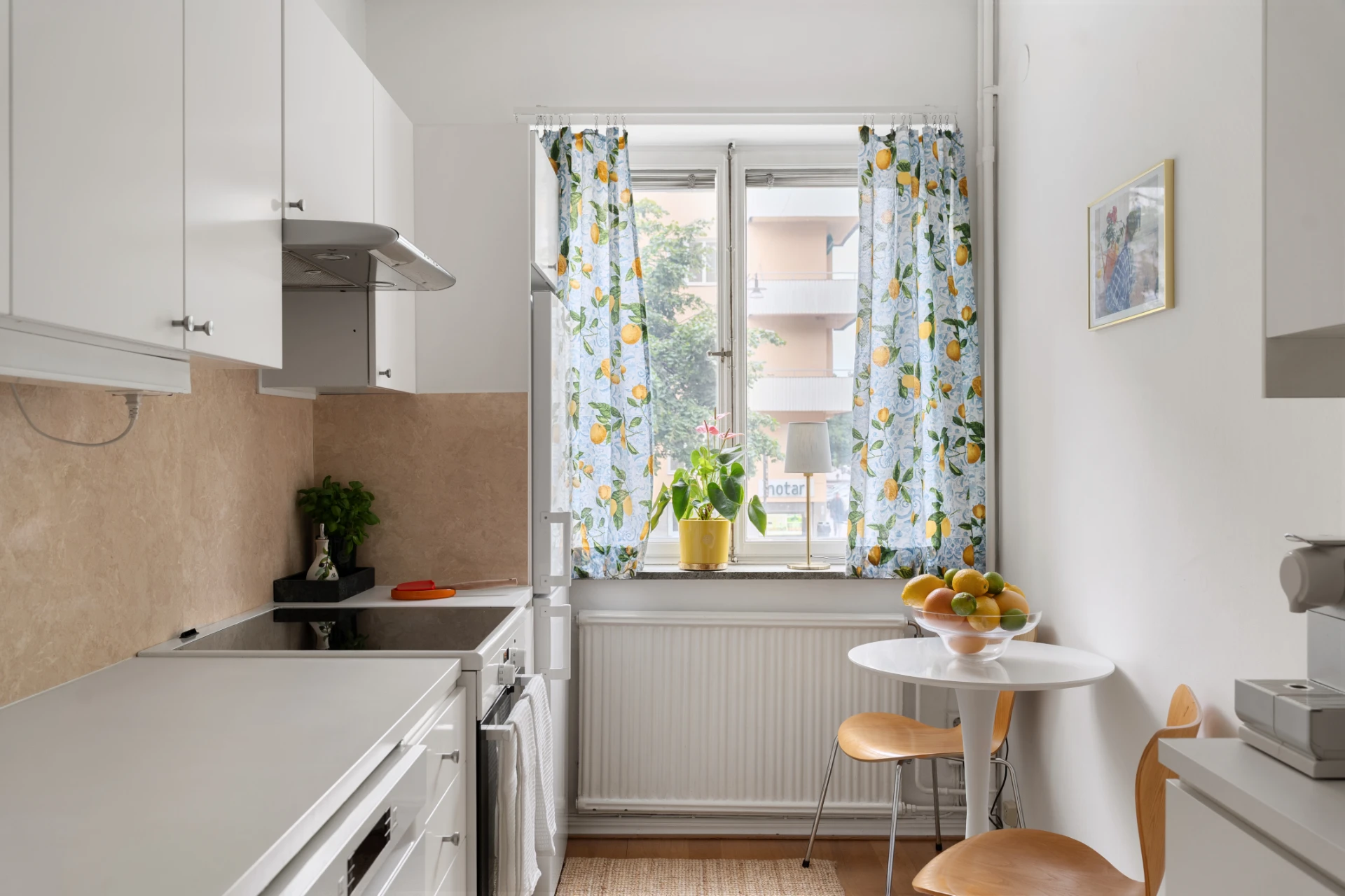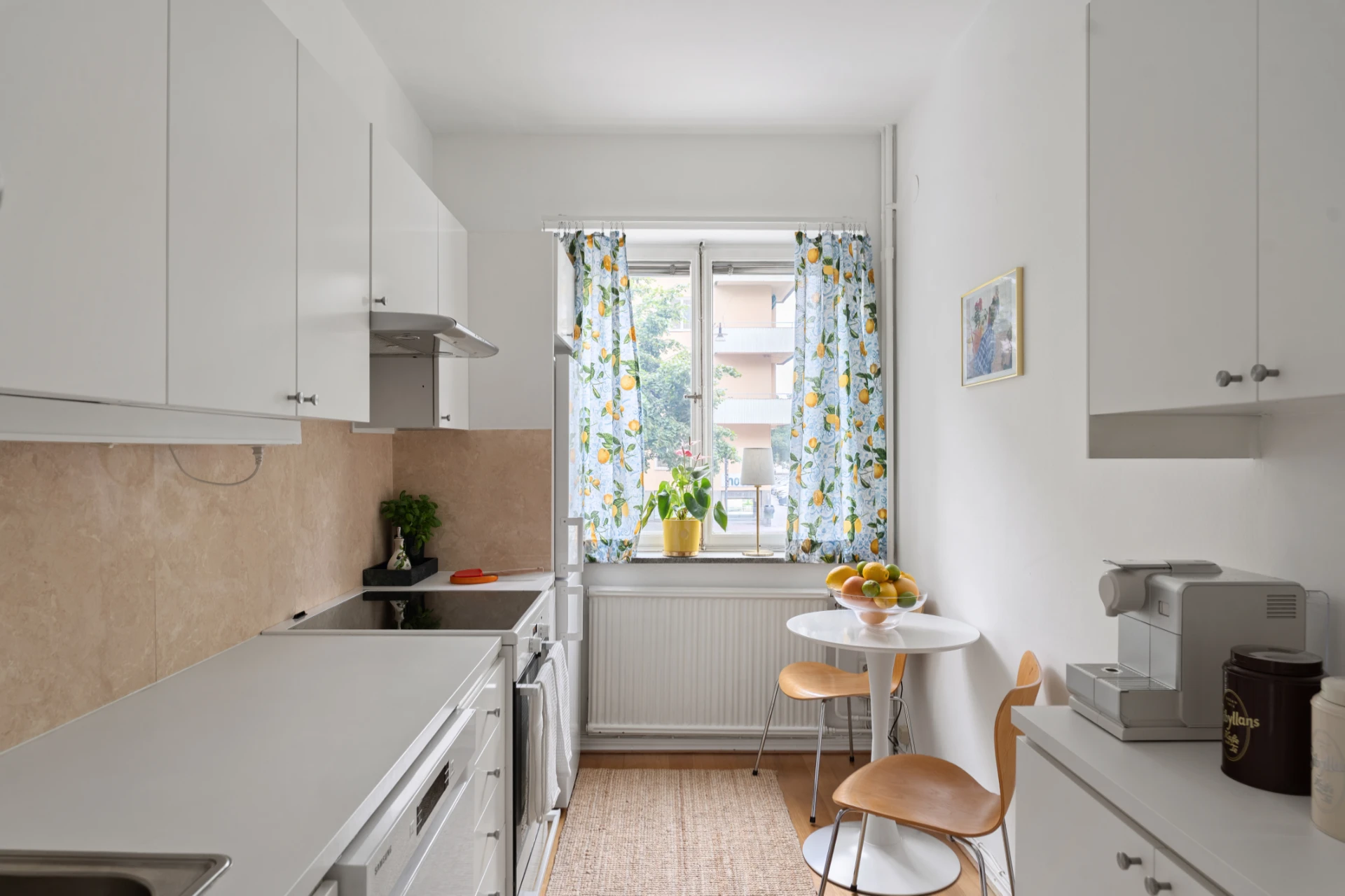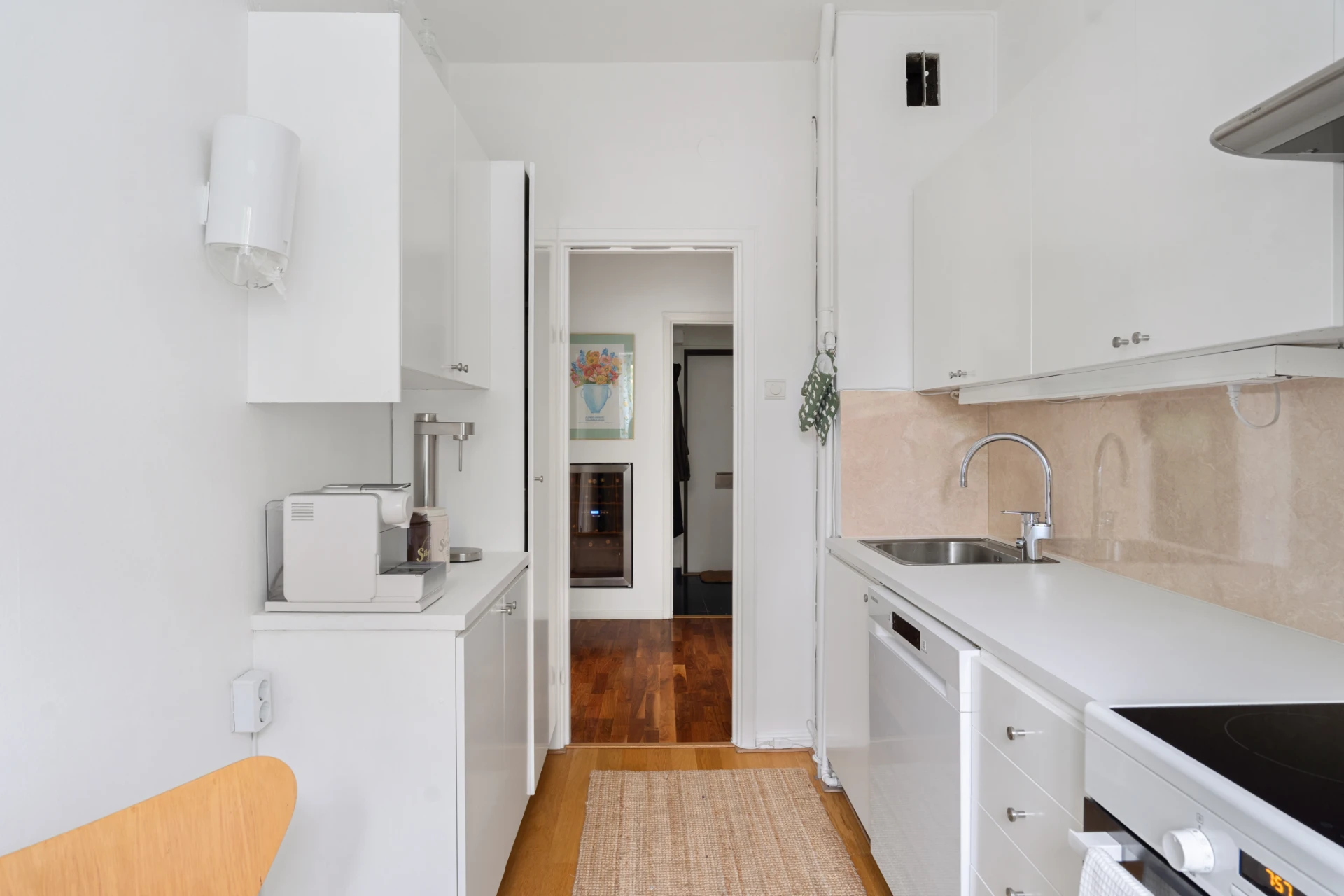 Stilrent kök med god förvaring bakom vita släta fronter, ljus bänkskiva, stänkskydd i sandfärgad stenimitation samt fint ljusinsläpp från fönster. Maskinell utrustning såsom spis/ugn, skåpsfläkt, diskmaskin samt kyl/frys. Här finns även plats för ett mindre matbord.