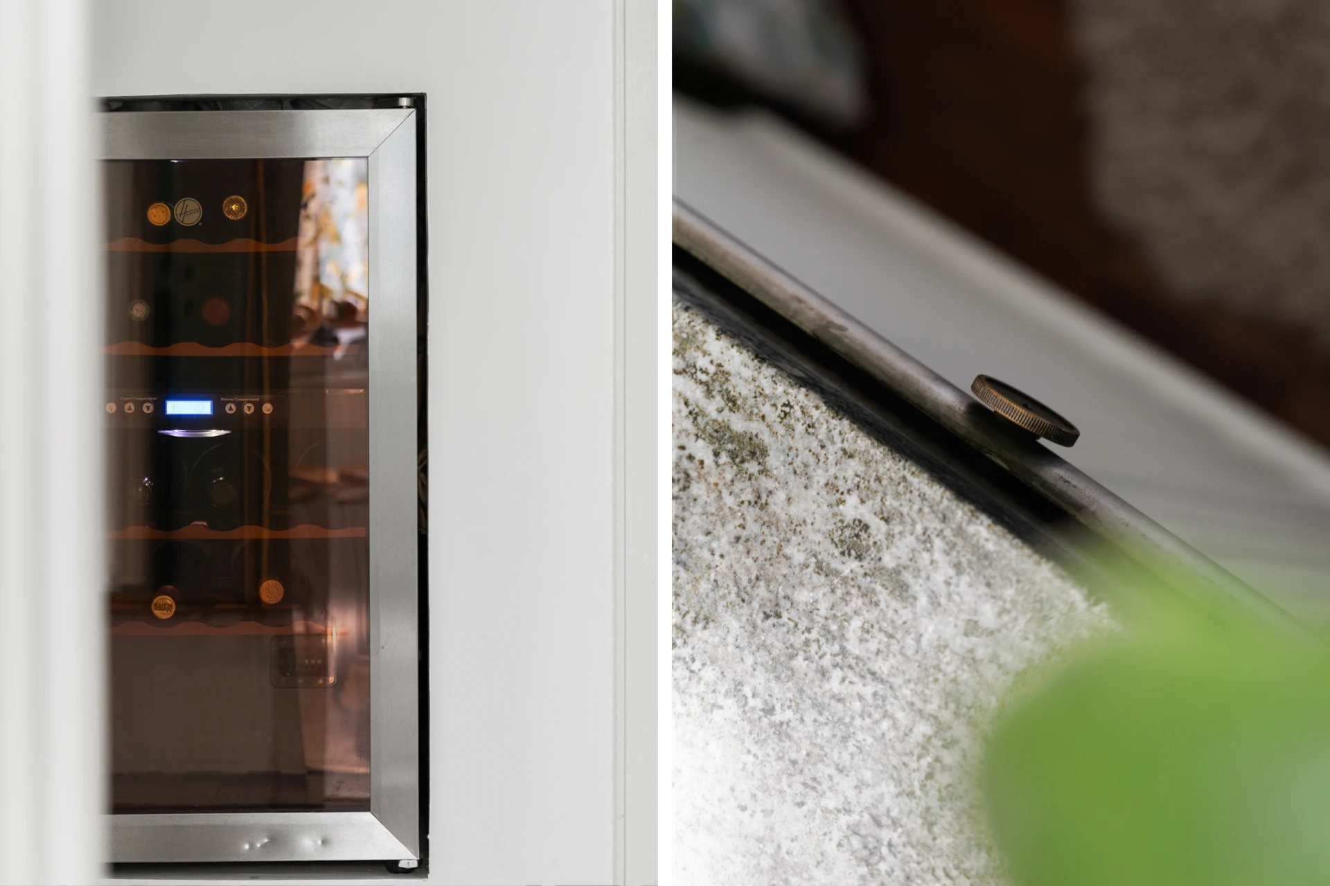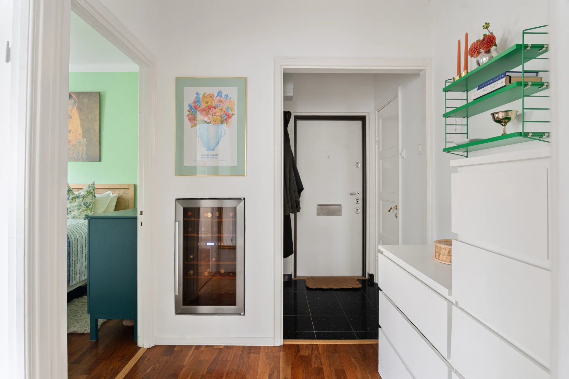 Rymlig inre hall med valnötsparkett, vita väggar och inbyggd vinkyl. Här finns plats för förvaringsmöbel för extra förvaring.