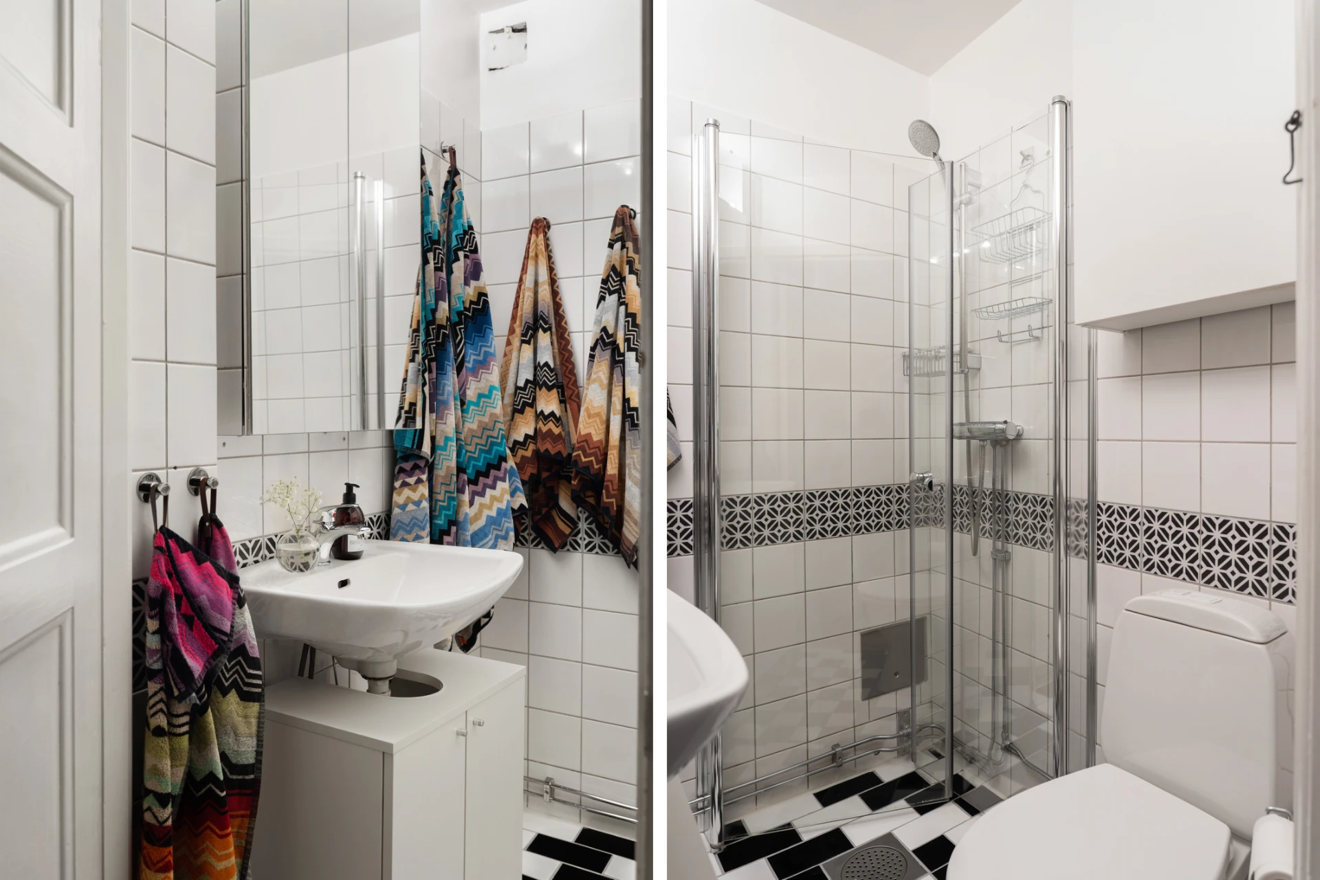 Stilrent helkaklat badrum med svart och vitt kakel på väggar och golv. Utrustat med WC, handfat med kommod och spegelskåp ovan samt dusch med infällbara glasväggar. Badrummet är förberett för tvättmaskin.
