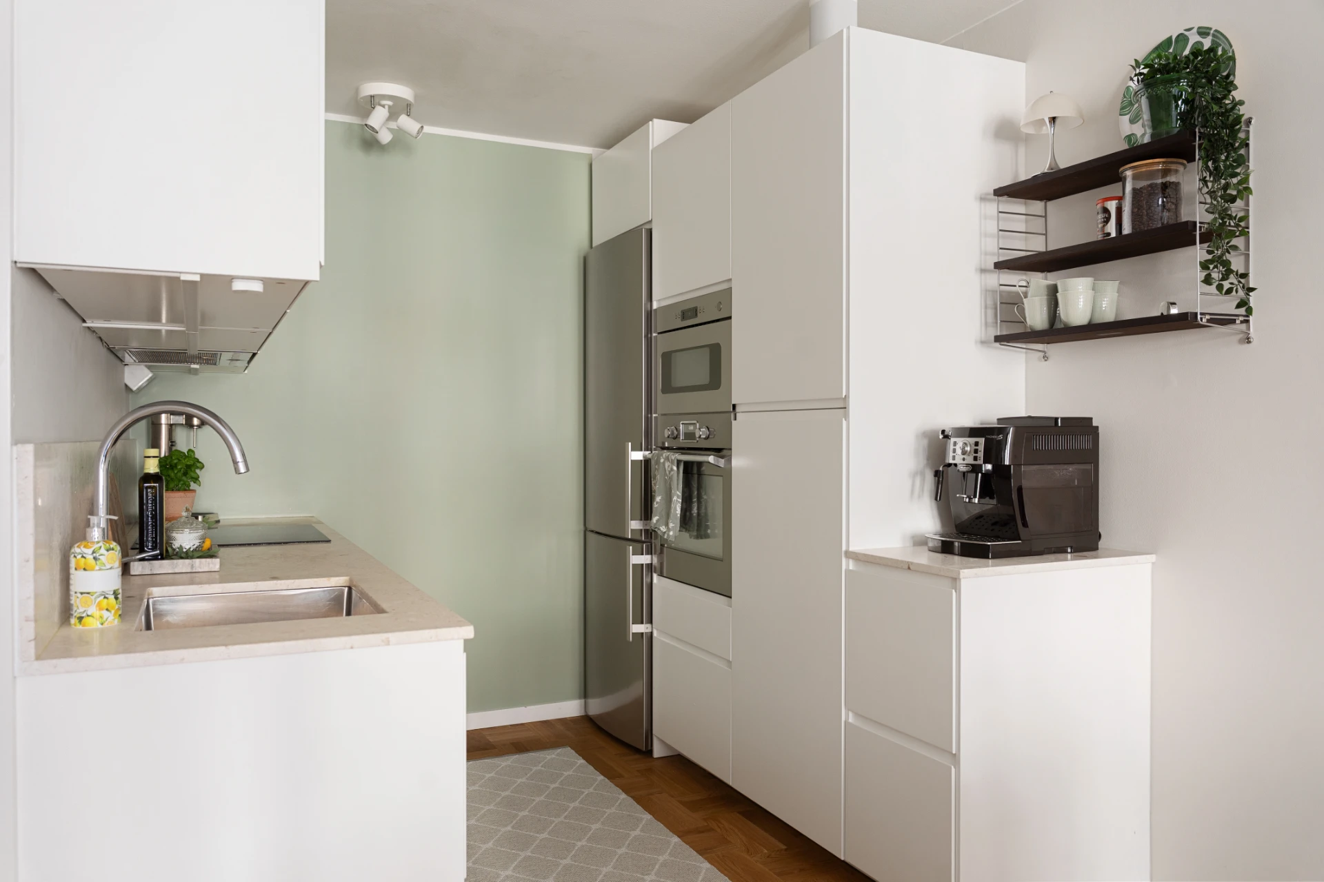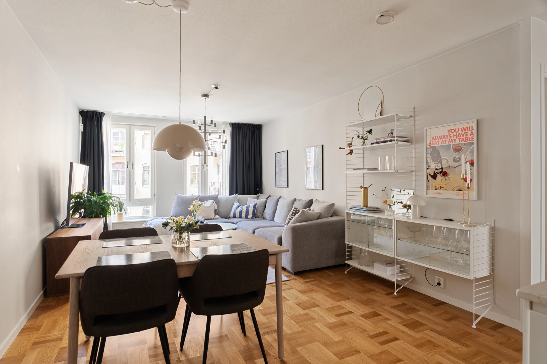 Redan i hallen möts du av ett ljust och välkomnande intryck. Här finns gott om plats för både ytterkläder och skor, samtidigt som flertalet garderober ger en suverän förvaring. Vardagsrummet imponerar med sin rymd och stora fönster som släpper in ett fantastiskt ljus. Här skapas en social och trivsam atmosfär där både soffgrupp, matsalsbord för 4–8 gäster och TV-möbel ryms med lätthet. Det stilrena köket är en dröm för den matlagningsintresserade. Här samsas hög standard med modern maskinell utrustning såsom kyl/frys, induktionshäll, infälld ugn och micro samt integrerad diskmaskin. Stenbänkskivan med matchande stänkskydd ramar in arbetsytorna på ett elegant sätt. Tack vare den öppna planlösningen mot vardagsrummet skapas en social miljö där kök och sällskapsytor smälter samman – perfekt för både vardag och fest. Master bedroom erbjuder ett rofyllt sovrum med plats för dubbelsäng, sidobord och extra förvaringsmöbler. Garderoberna gör det enkelt att hålla ordning, och fönster mot innergården ger ett stillsamt läge som bjuder in till god nattsömn. Det andra sovrummet är lika charmigt – en flexibel yta som med fördel kan användas som barnrum, gästrum eller ett inspirerande arbetsrum. Det helkaklade badrummet är smakfullt inrett i klassiska färgval med ljust kakel och mörkt klinkergolv. Här finns allt du behöver för en bekväm vardag: vägghängd WC, handfat med kommod och spegel ovan, handdukstork, golvvärme samt dusch med infällbara glasväggar. Den praktiska tvättdelen med både tvättmaskin och torktumlare underlättar ytterligare i det moderna hemmet.