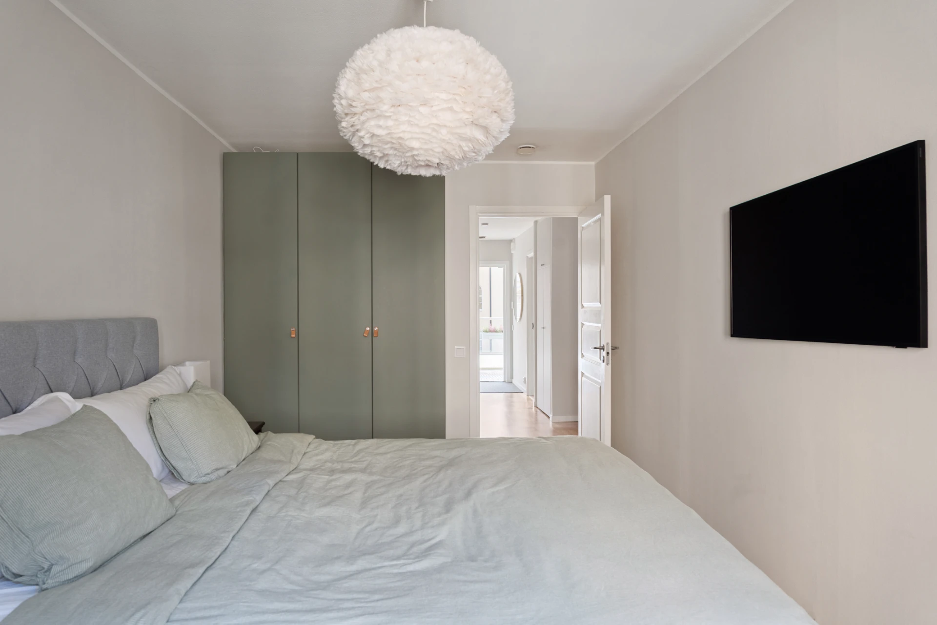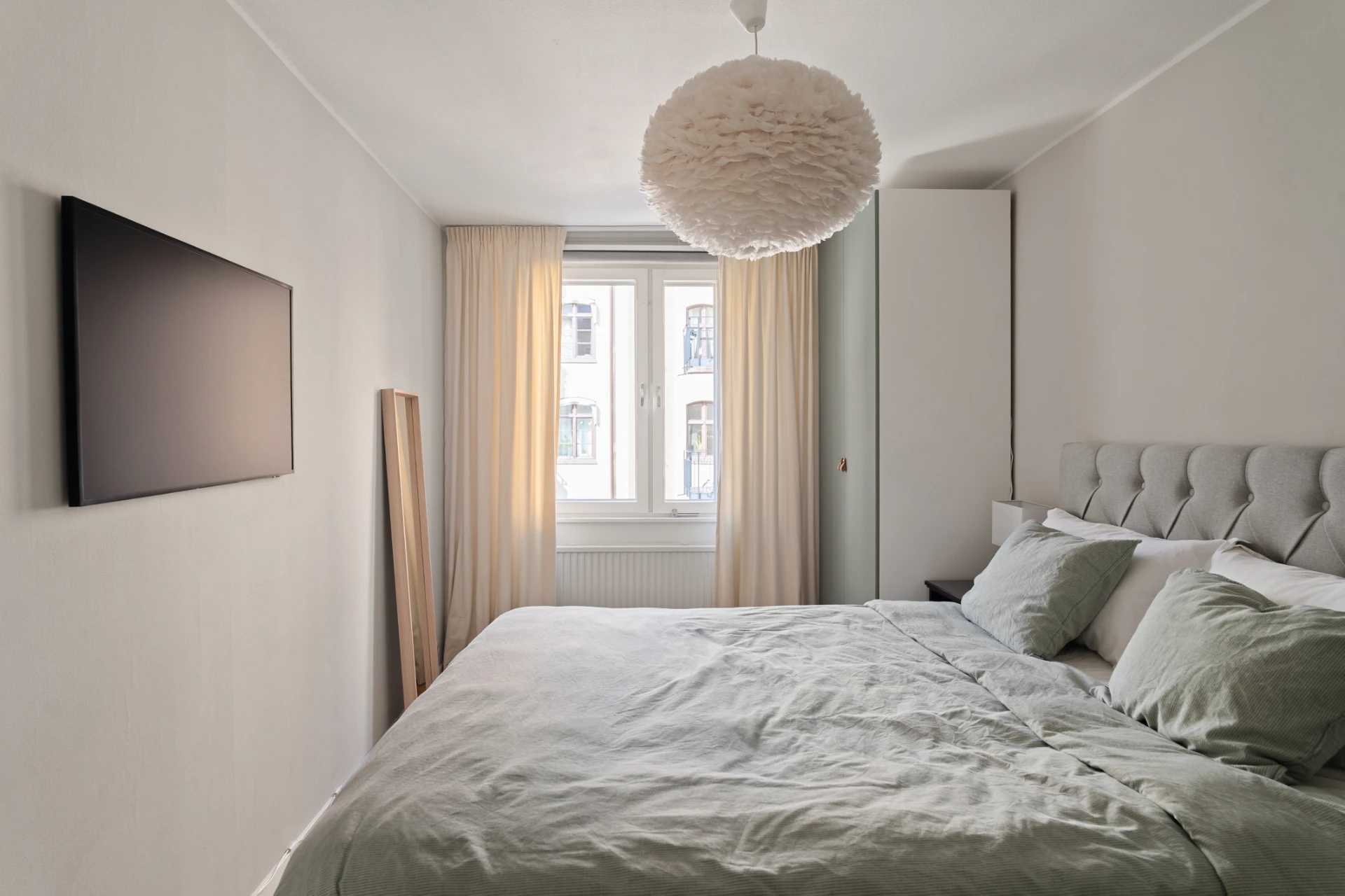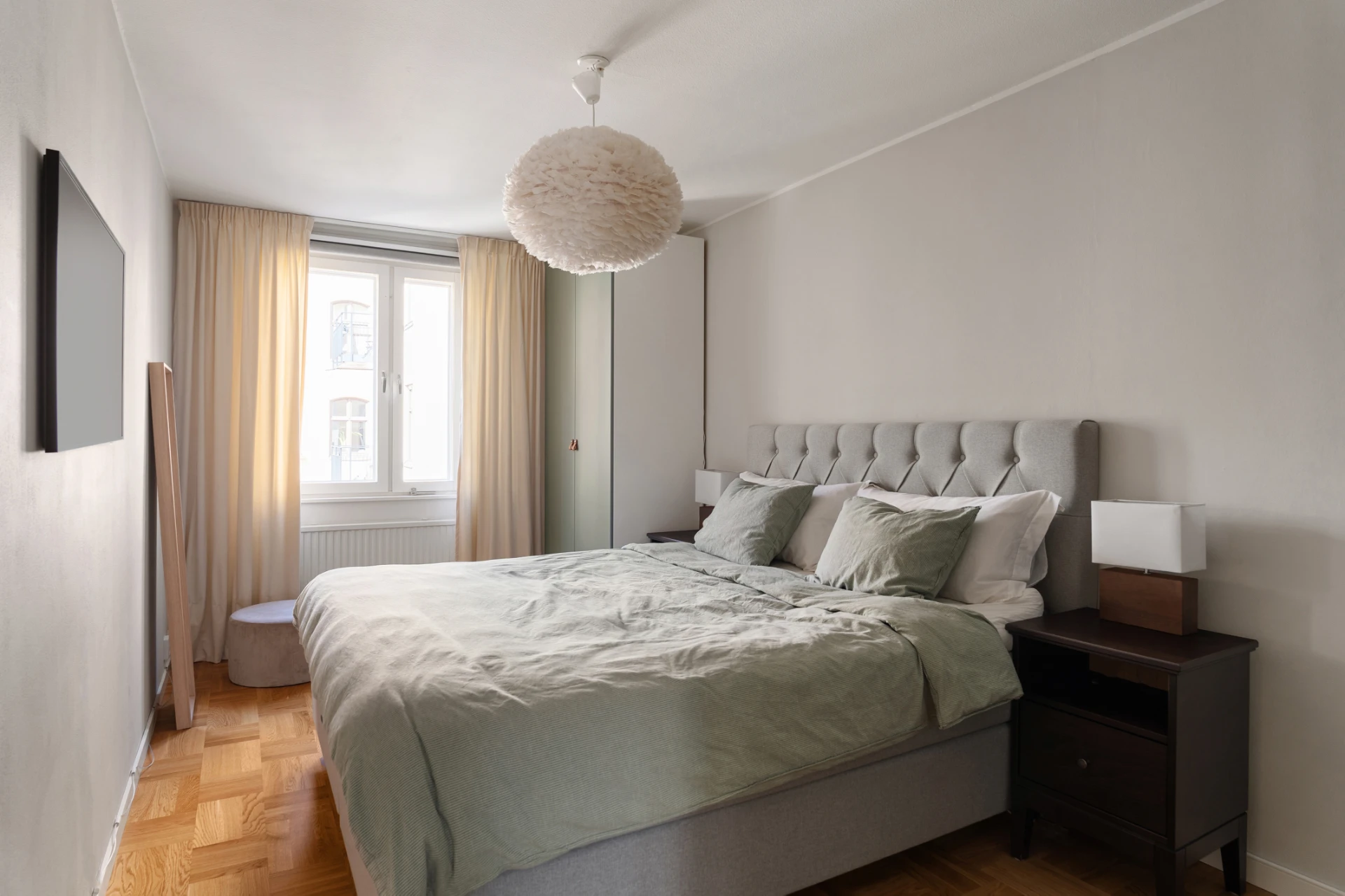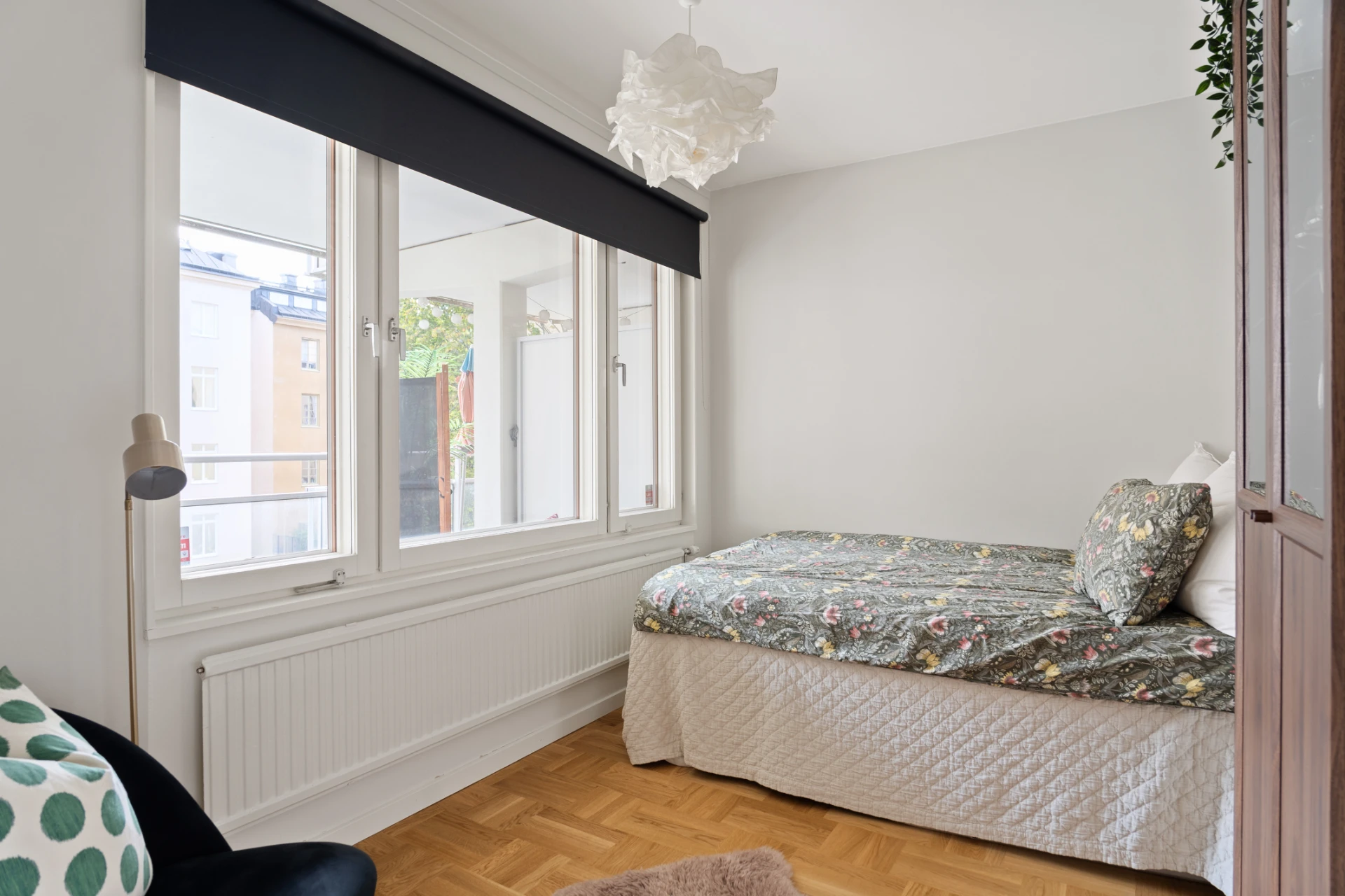 Väldisponerat sovrum med plats för dubbelsäng, sidobord, förvaringsmöbel samt garderober. Lugnt läge med fönster mot innergården.