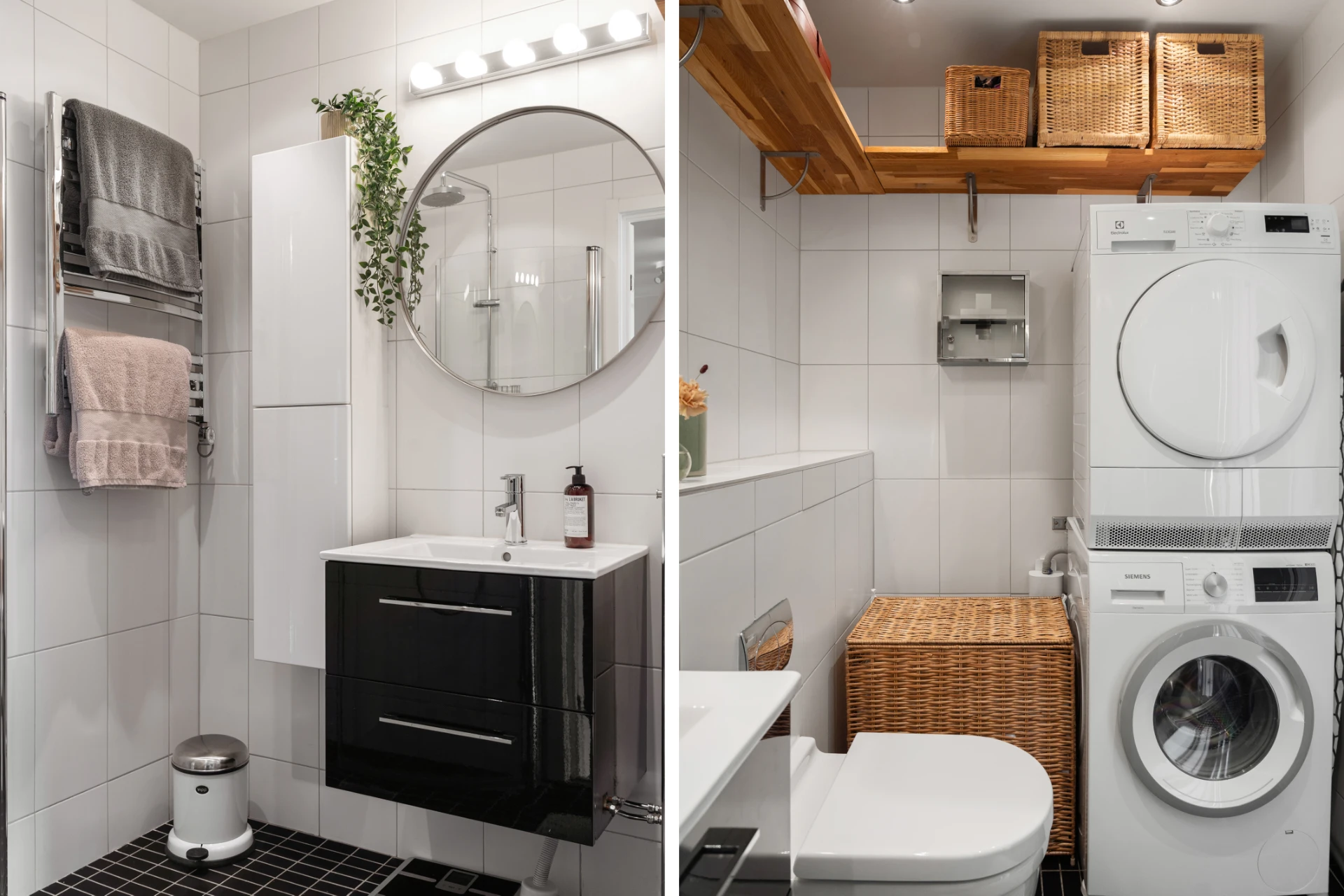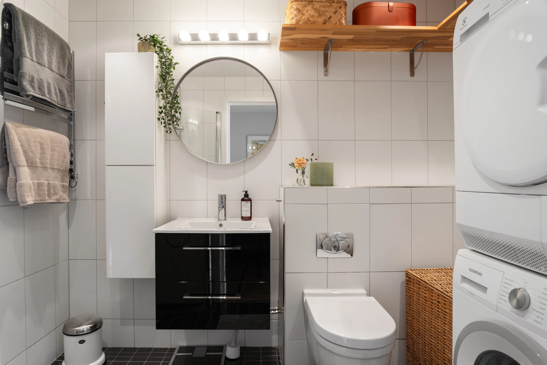Helkaklat badrum med ljust kakel på väggarna samt mörkt klinkergolv. Utrustat med vägghängd WC, handfat med kommod och spegel ovan, praktisk handukstork, golvvärme, tvättmaskin och torktumlare samt dusch med infällbara glasväggar.
