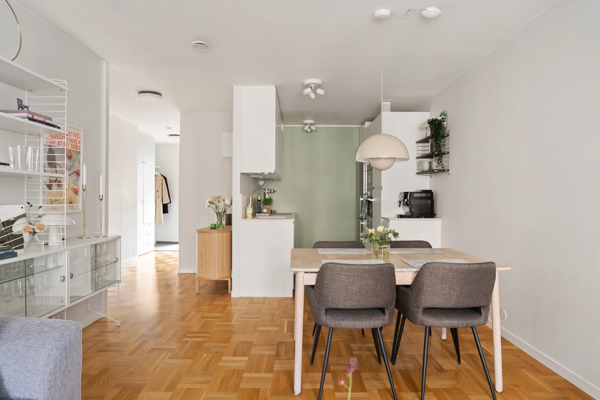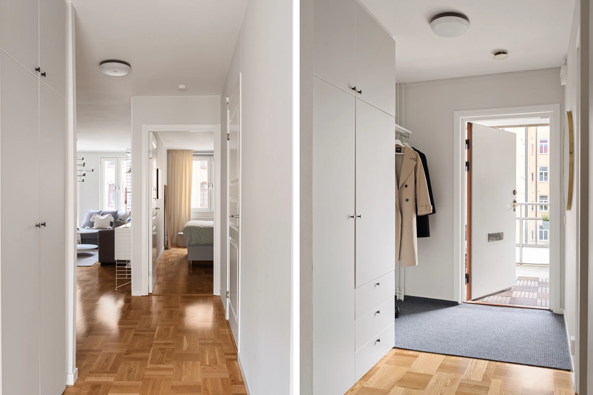 Ljus och inbjudande hall med goda avhängningsmöjligheter av ytterkläder och skor samt flertalet garderober som erbjuder suverän förvaring. Från entrén når ni bostadens loftbalkong mot den lugna innergården.