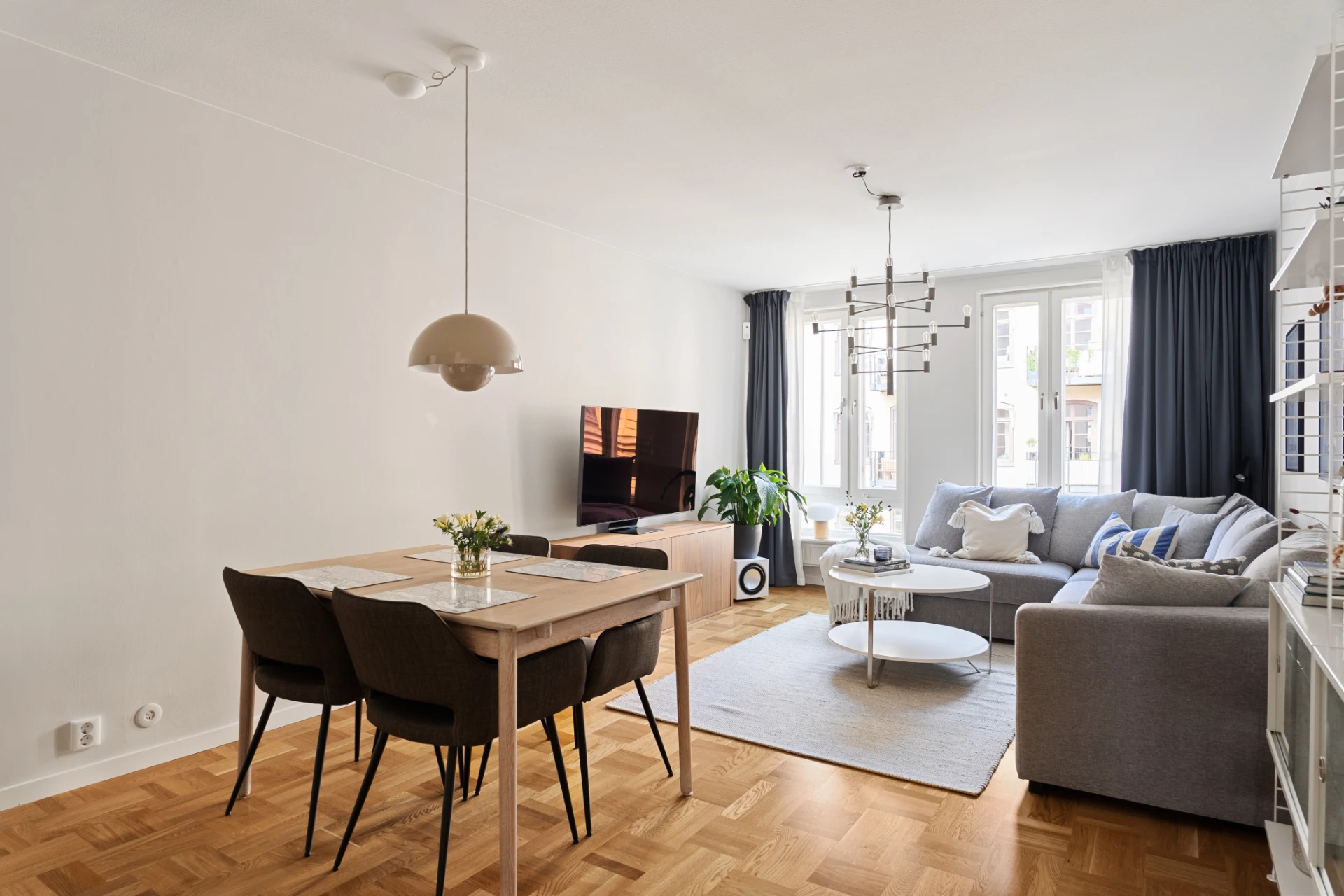 Luftigt vardagsrum med stora fönster som genererar ett härligt ljusinsläpp. Rummet är väl tilltaget och här ryms större soffgrupp, matsalsbord för 4–8 middagsgäster, TV-möbel och annat valfritt möblemang.