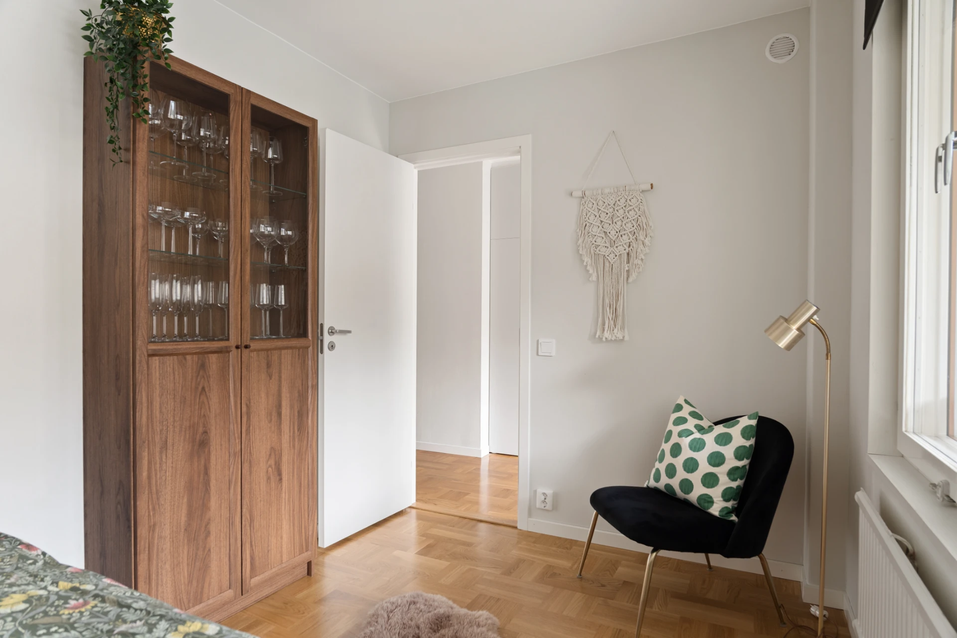 Charmigt sovrum med plats för en säng, sidobord samt förvaringsmöbel. Kan användas som gästrum, barnrum eller arbetsrum.