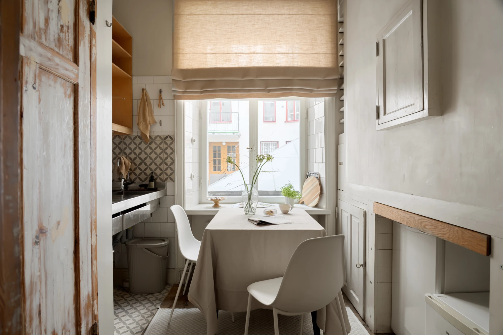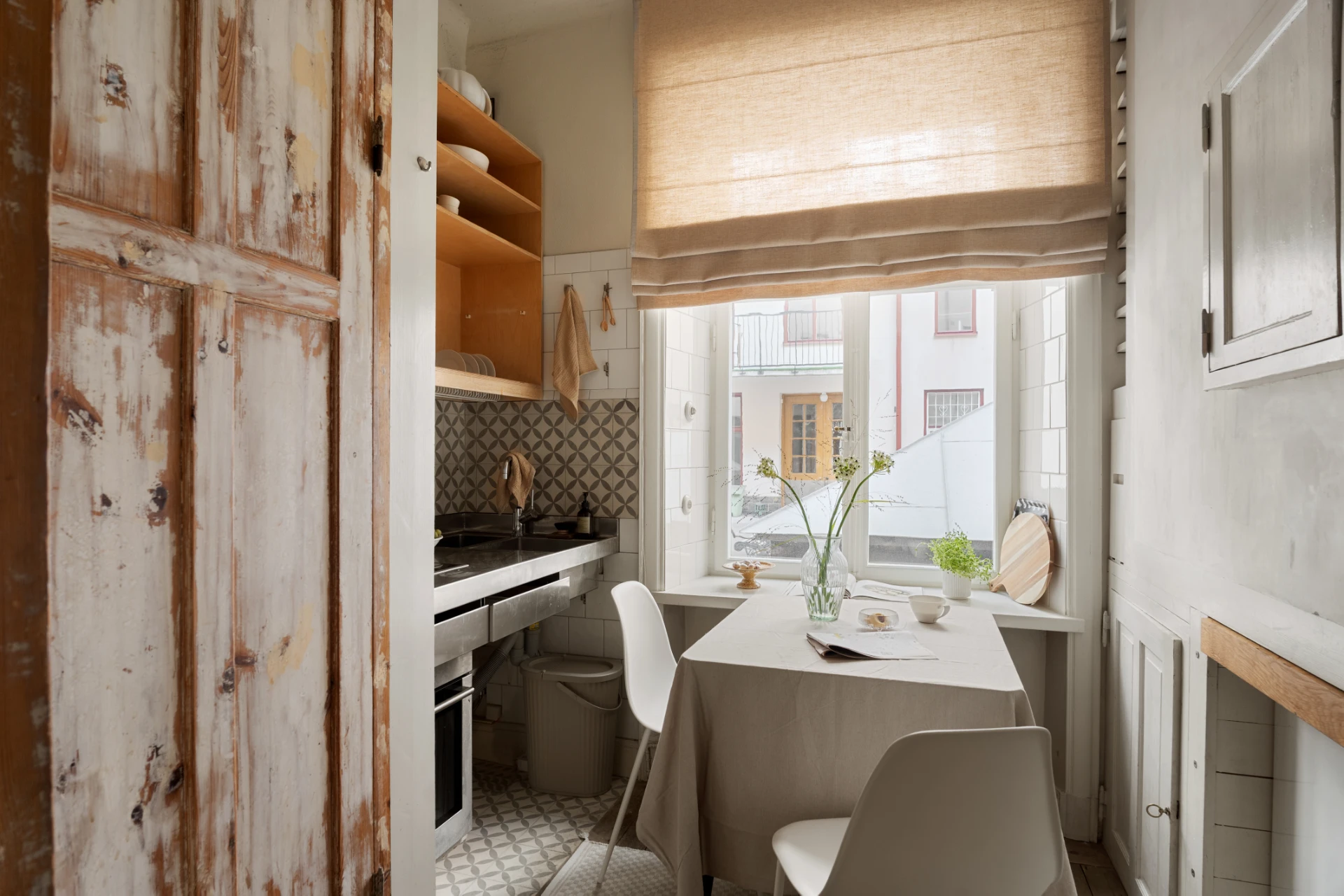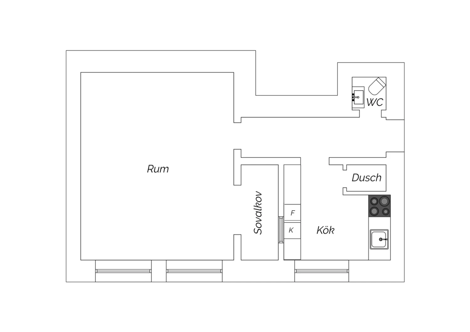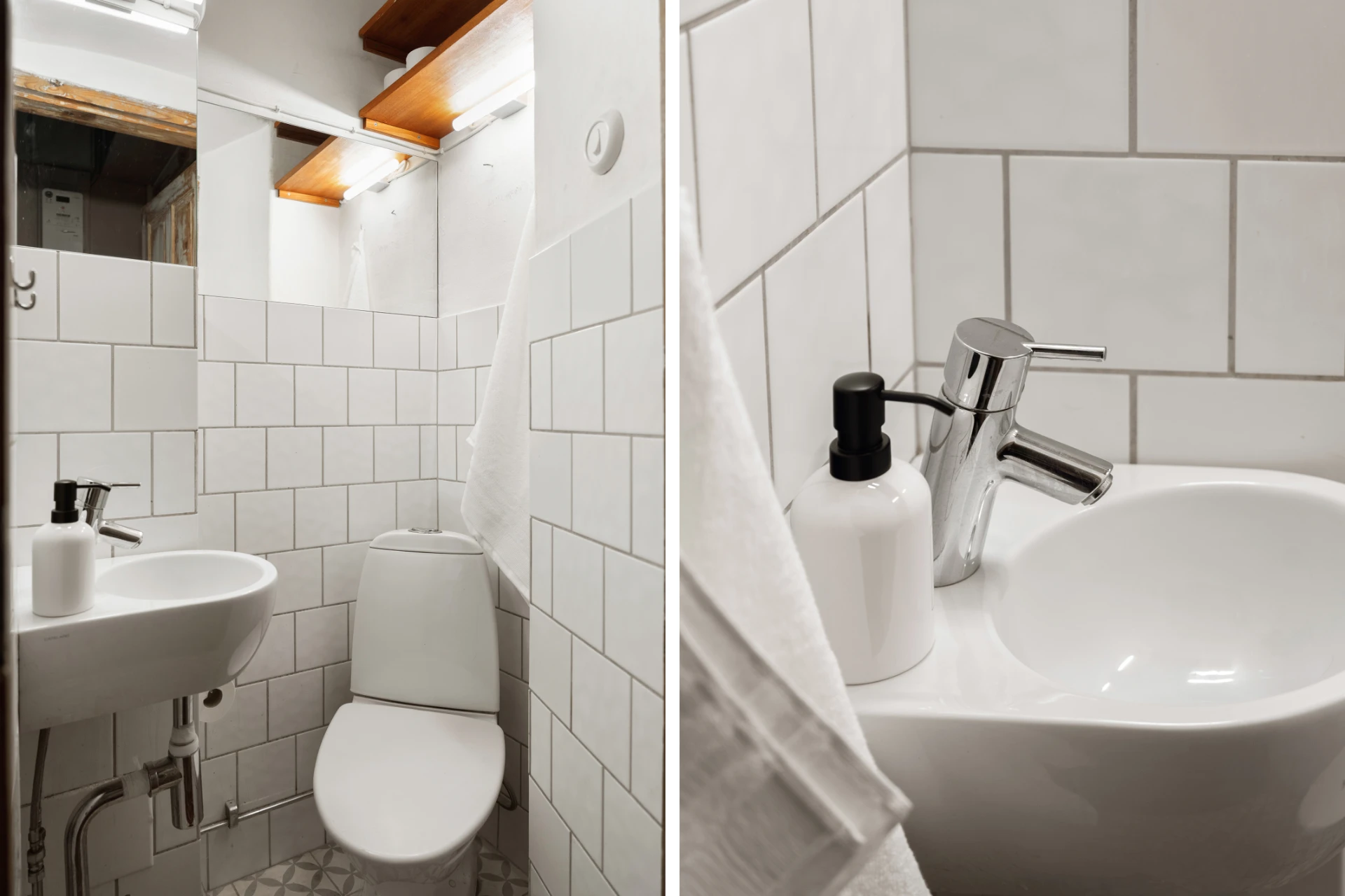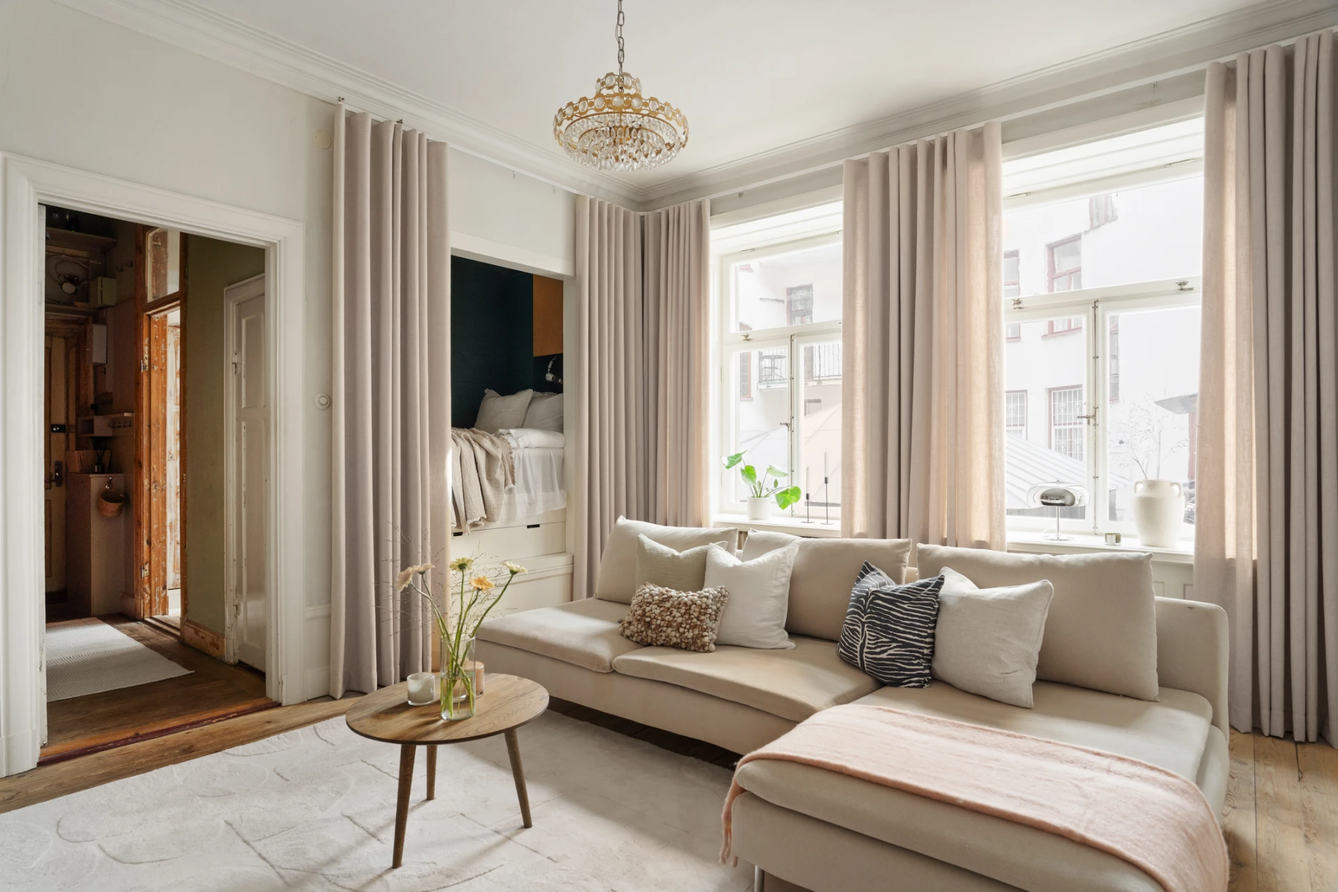 När du kliver in möts du av en trevlig och inbjudande hall med gott om plats för ytterkläder och skor – en välkomnande entré som sätter tonen för resten av bostaden. Direkt från hallen nås en helkaklad WC, smakfullt inrett med vita kakelväggar och mörkt klinkergolv som ger en tidlös kontrast. Utrustad med wc, handfat med spegel ovan och hyllor för extra förvaring. Vidare leds du in i det klassiska köket där vita fronter och en rostfri ho möter ett fint ljusinsläpp från det stora fönstret. Här finns gott om förvaring och all maskinell utrustning du behöver – kyl/frys och spis/ugn – samtidigt som det finns plats för ett matbord. Som en charmig detalj öppnar en liten serveringslucka upp mot sovalkoven. Bakom en elegant spegeldörr gömmer sig det separata duschrummet – helkaklat och praktiskt planerat för att optimera ytan. Det ljuvliga vardagsrummet blir hemmets självklara samlingspunkt, med ljusa väggar, vackra trägolv och två stora fönster i fil som släpper in ett generöst ljusflöde. Rummet är väl tilltaget och rymmer med lätthet både soffgrupp, tv-möbel och annat möblemang du vill omge dig med. Intill vardagsrummet väntar den mysiga sovalkoven – en avskild oas med målade mörka väggar och smart platsbyggd förvaring under sängen. En perfekt plats för rofyllda nätter och en härlig kontrast till bostadens ljusa sociala ytor.