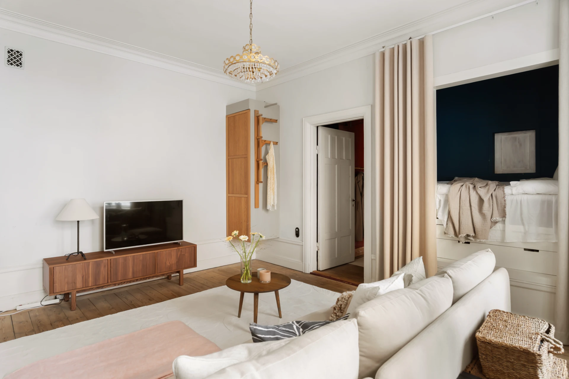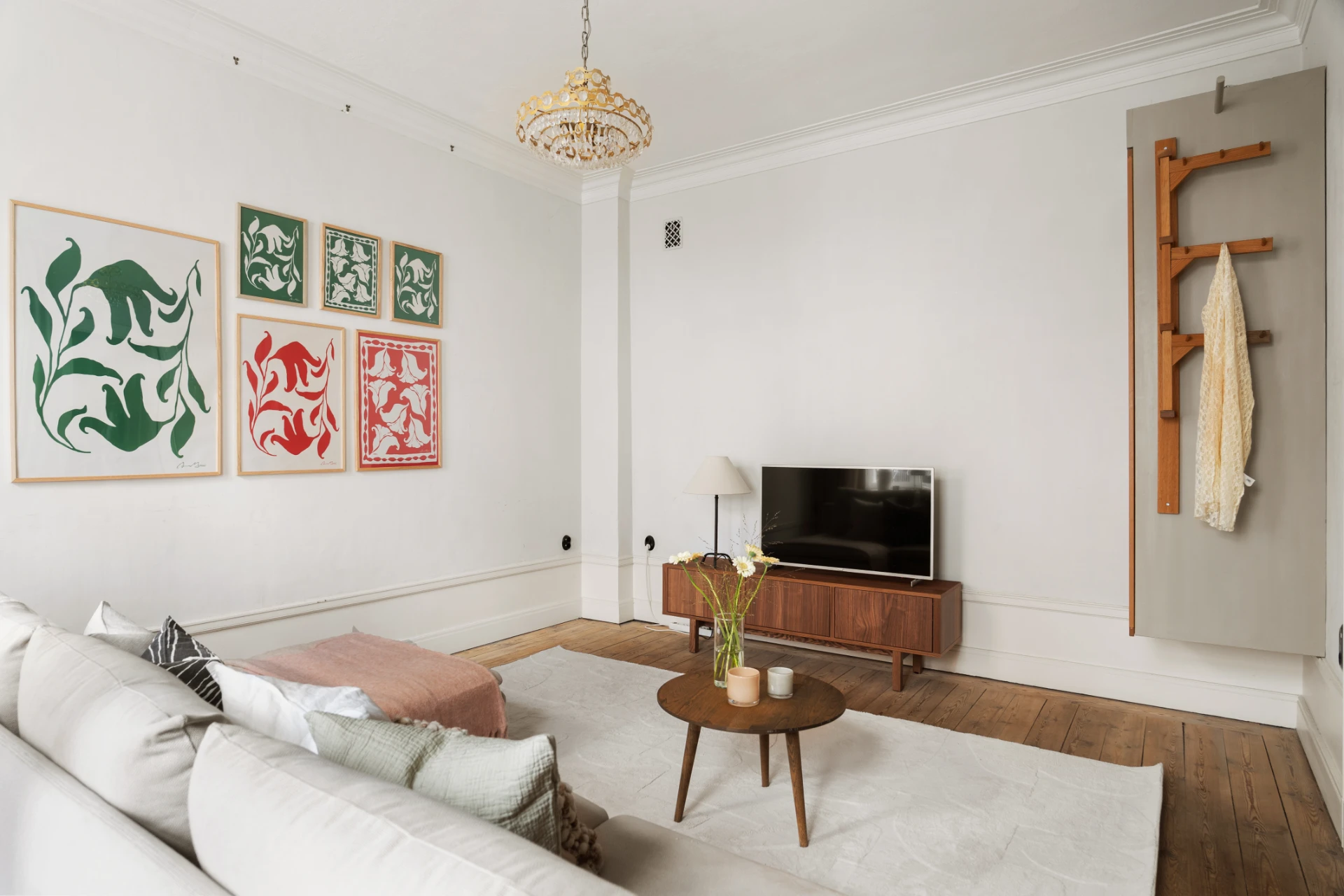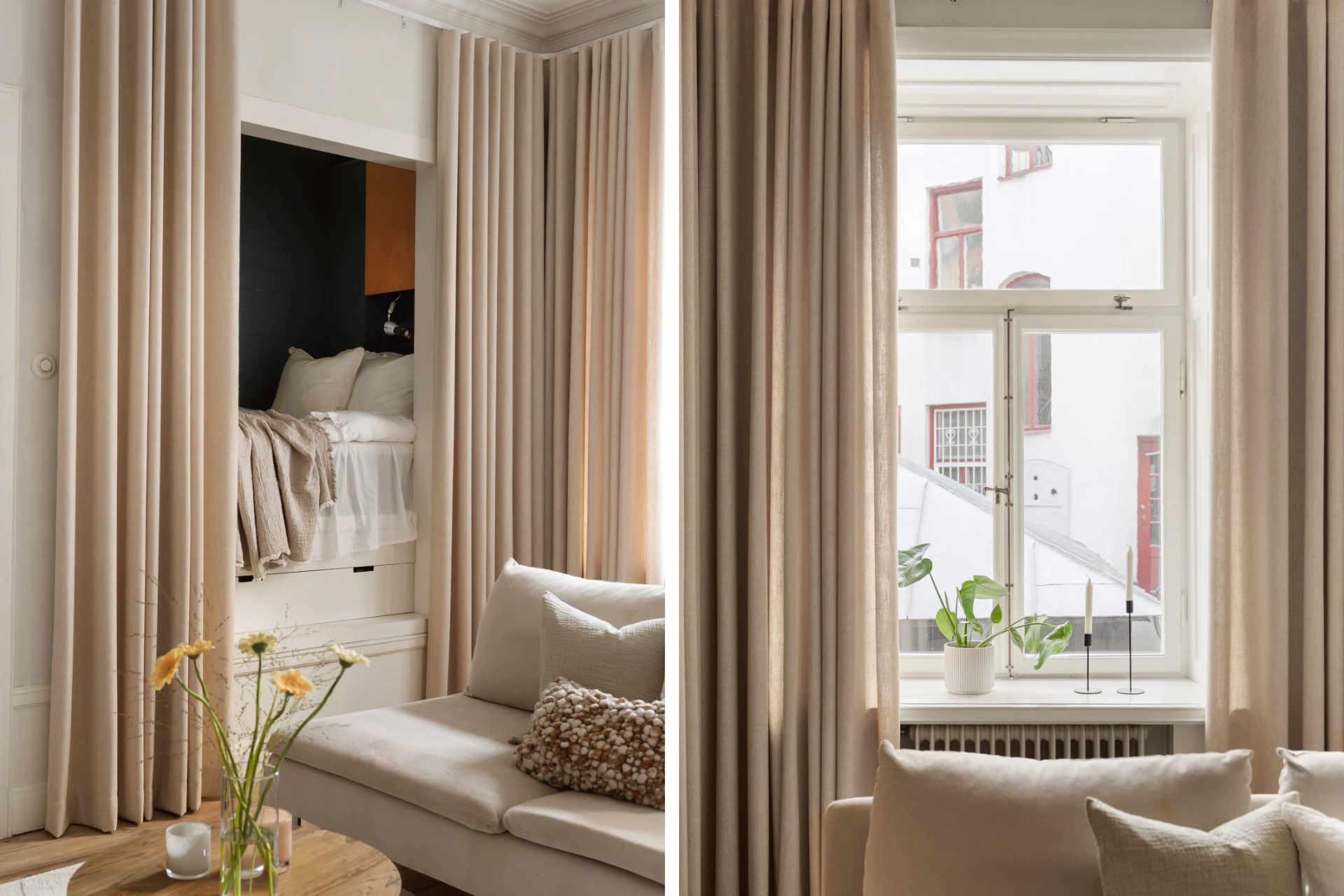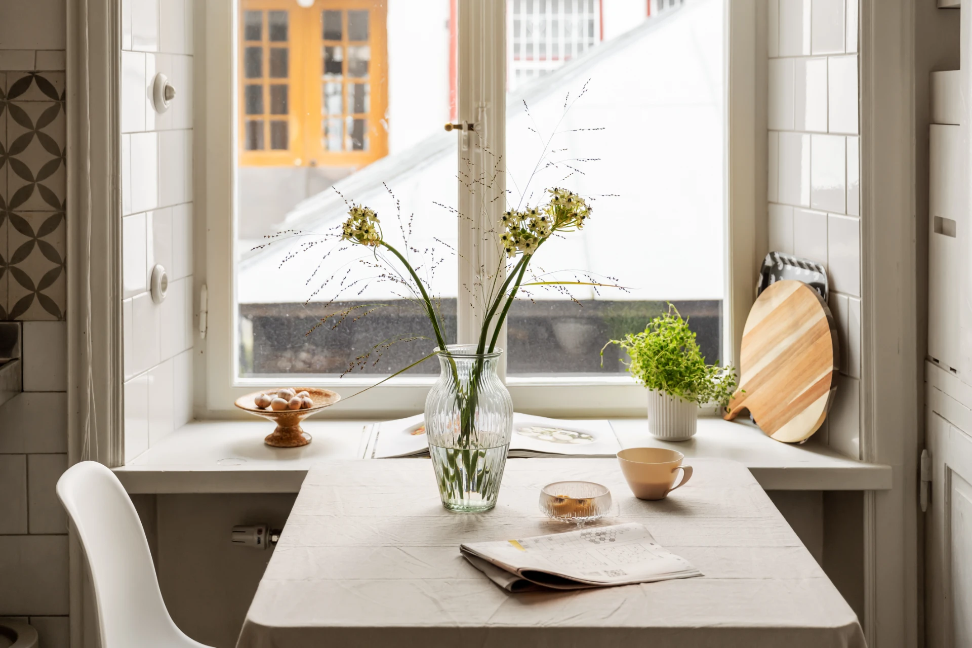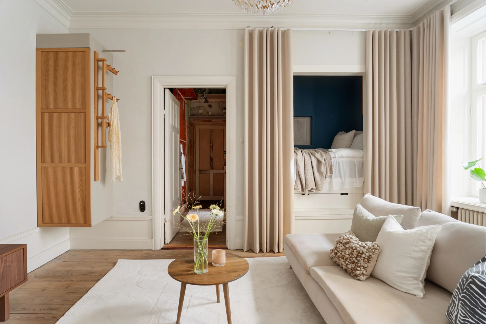 När du kliver in möts du av en trevlig och inbjudande hall med gott om plats för ytterkläder och skor – en välkomnande entré som sätter tonen för resten av bostaden. Direkt från hallen nås en helkaklad WC, smakfullt inrett med vita kakelväggar och mörkt klinkergolv som ger en tidlös kontrast. Utrustad med wc, handfat med spegel ovan och hyllor för extra förvaring. Vidare leds du in i det klassiska köket där vita fronter och en rostfri ho möter ett fint ljusinsläpp från det stora fönstret. Här finns gott om förvaring och all maskinell utrustning du behöver – kyl/frys och spis/ugn – samtidigt som det finns plats för ett matbord. Som en charmig detalj öppnar en liten serveringslucka upp mot sovalkoven. Bakom en elegant spegeldörr gömmer sig det separata duschrummet – helkaklat och praktiskt planerat för att optimera ytan. Det ljuvliga vardagsrummet blir hemmets självklara samlingspunkt, med ljusa väggar, vackra trägolv och två stora fönster i fil som släpper in ett generöst ljusflöde. Rummet är väl tilltaget och rymmer med lätthet både soffgrupp, tv-möbel och annat möblemang du vill omge dig med. Intill vardagsrummet väntar den mysiga sovalkoven – en avskild oas med målade mörka väggar och smart platsbyggd förvaring under sängen. En perfekt plats för rofyllda nätter och en härlig kontrast till bostadens ljusa sociala ytor.