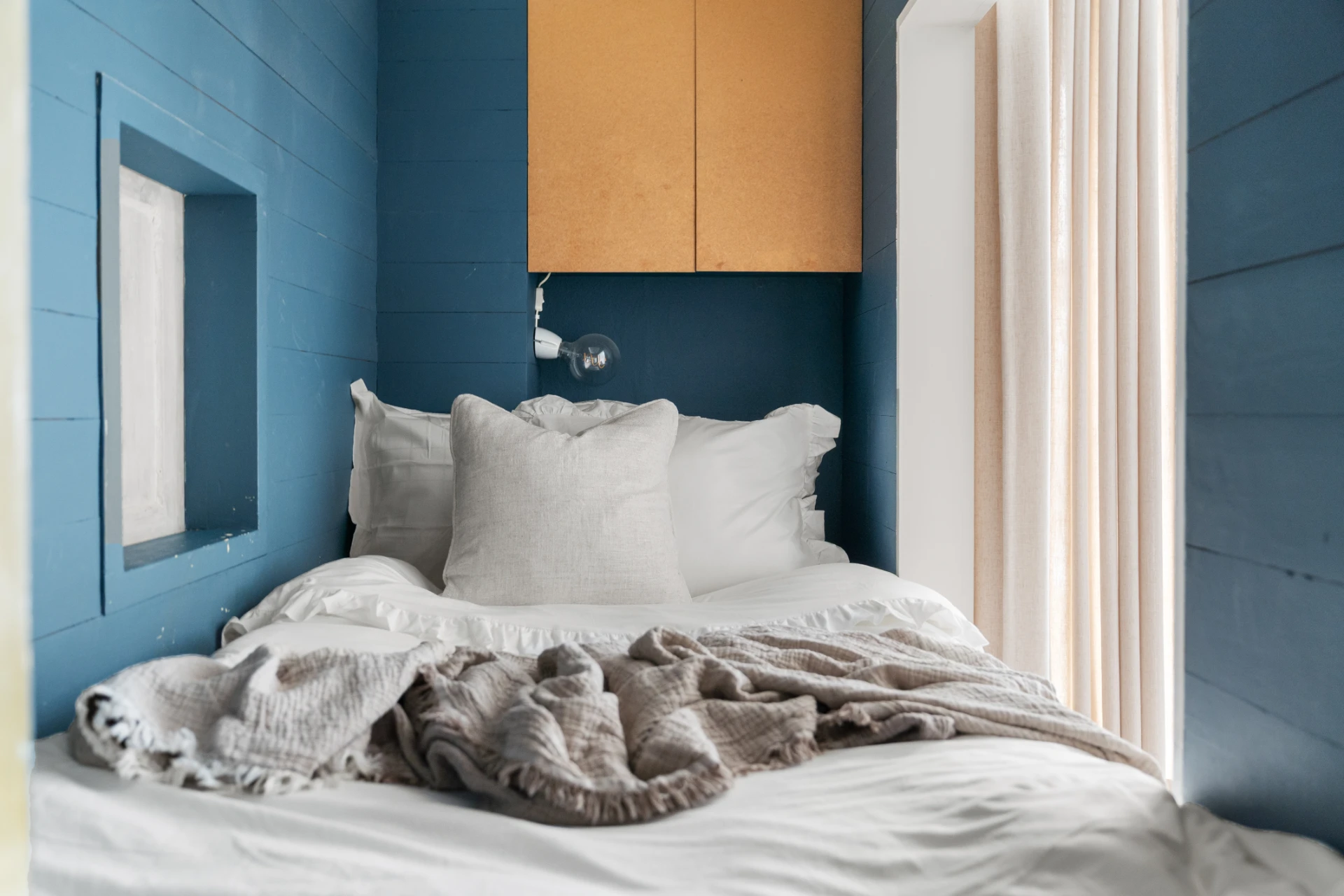 Charmig avskild sovalkov med målade mörka väggar och platsbyggd förvaring under sängen.