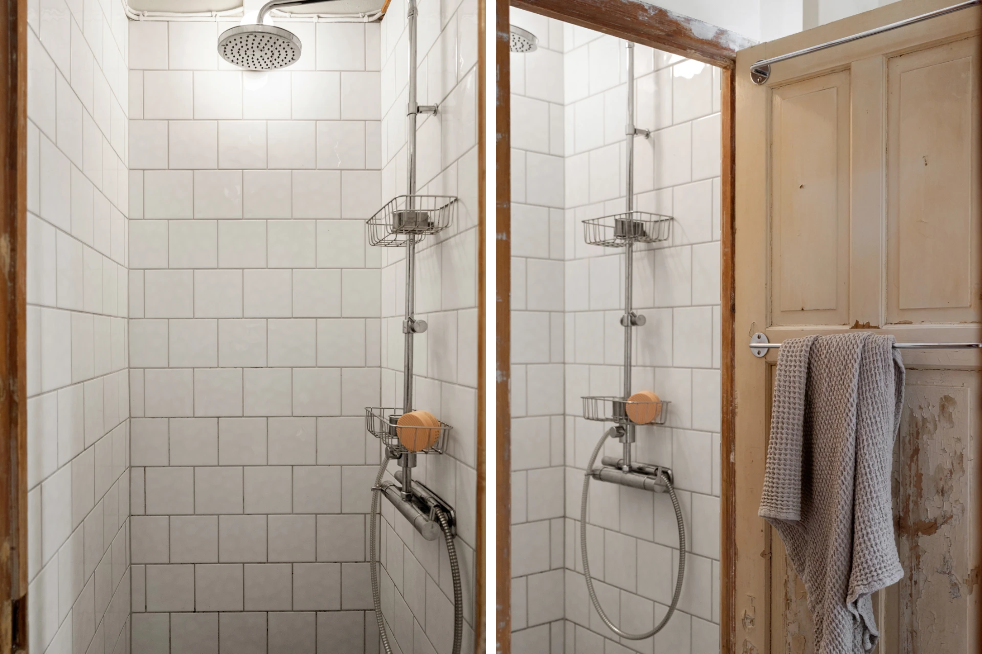 Bakom speglad dörr nås de separata helkaklade duschrummet.