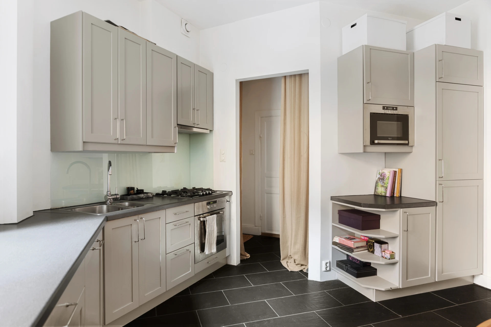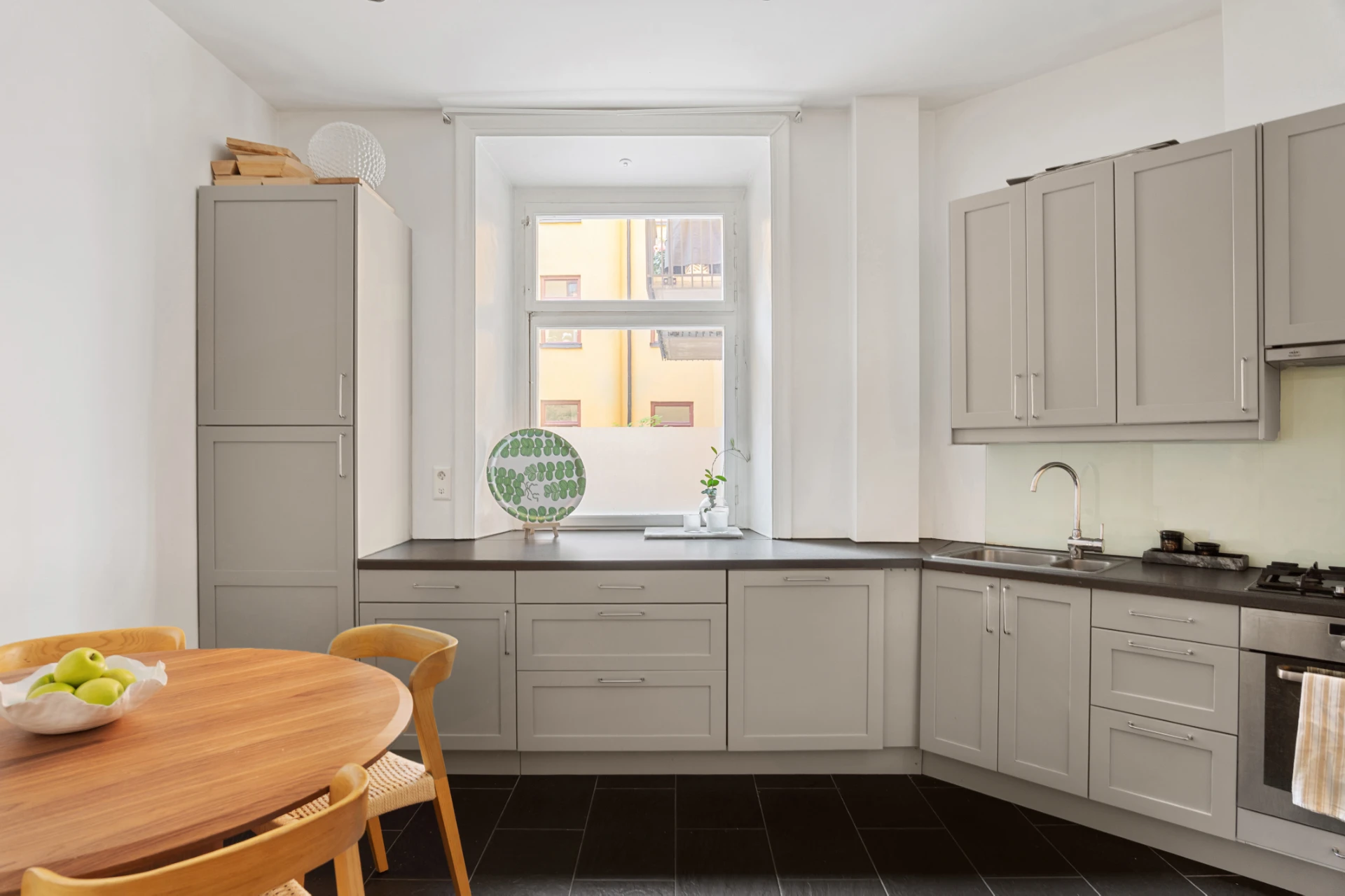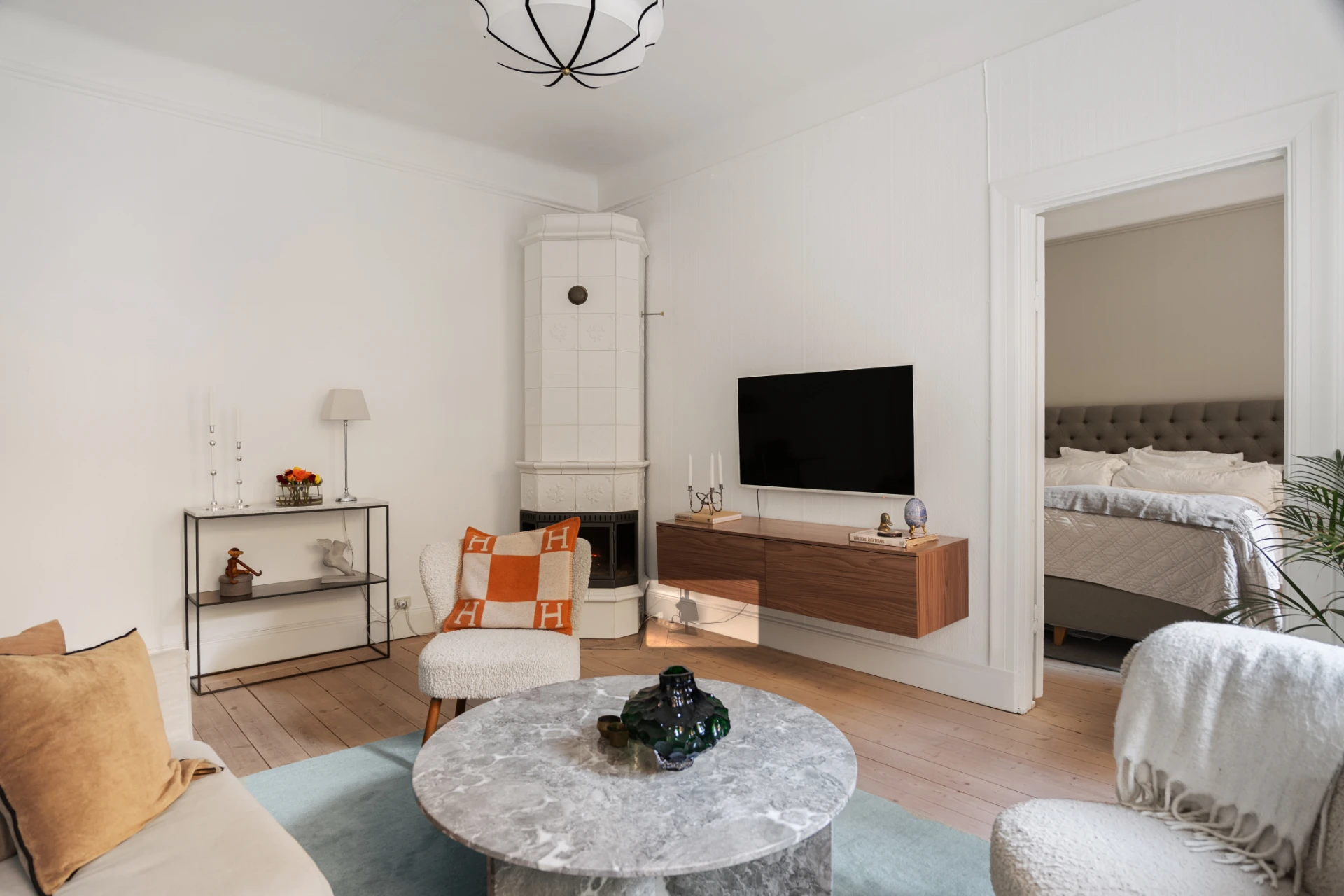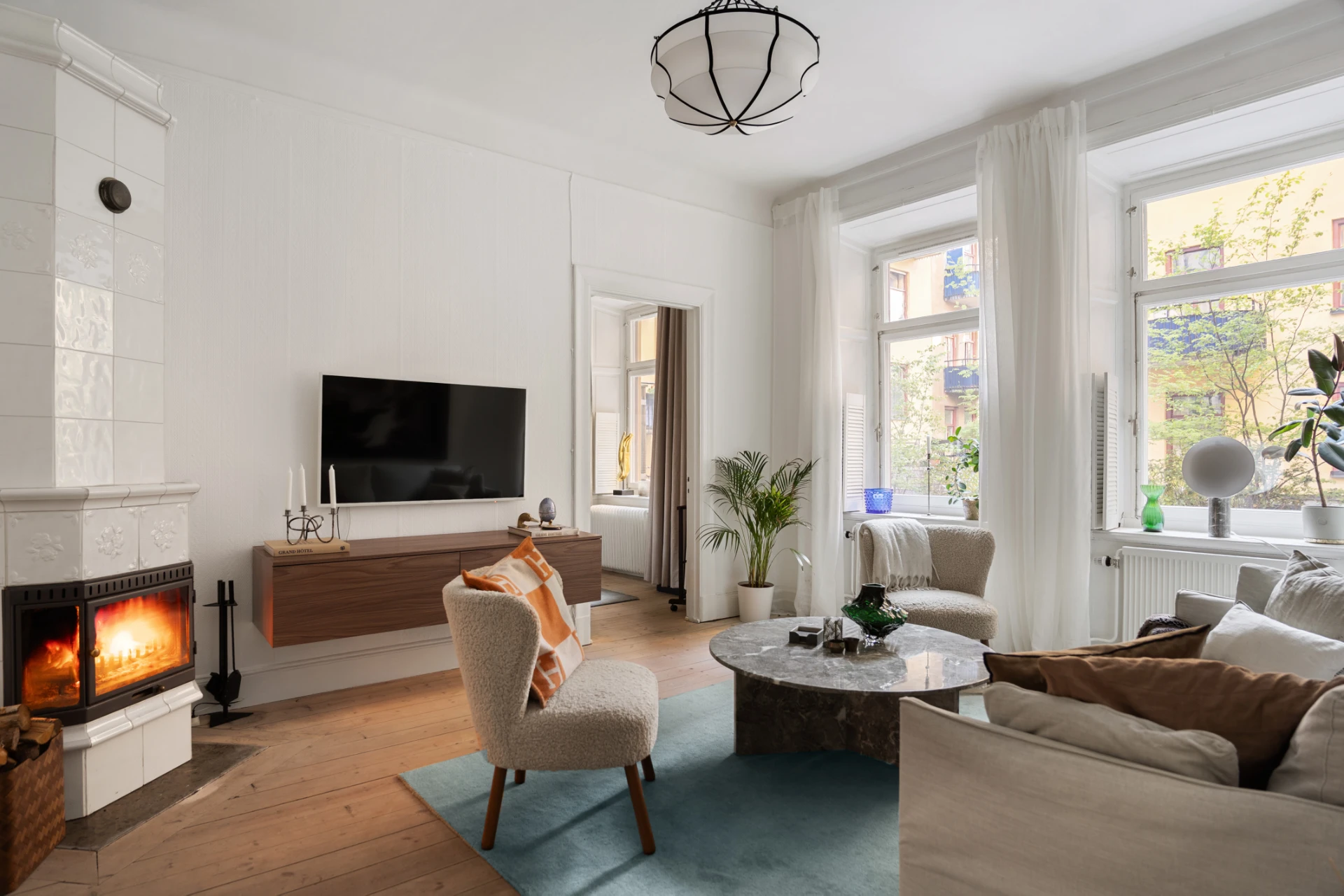Redan i hallen möts du av en välkomnande atmosfär med ljusa väggar och stilrent mörkt klinkergolv. Här finns gott om plats för avhängning av ytterkläder och skor, vilket gör entrén både praktisk och inbjudande. Det moderna köket bjuder på en harmonisk kombination av ljusgrå fronter och mörk bänkskiva. Här finns bra arbetsytor, generös förvaring och full maskinell utrustning med gasspis, ugn, fläkt samt integrerade vitvaror som kyl/frys och diskmaskin. Den sociala planlösningen gör att köket även rymmer ett matbord för fyra personer – perfekt för både vardagsmiddagar och trevliga kvällar med vänner. Vardagsrummet är bostadens hjärta. Ljusa väggar, vackert trägolv och tilltalande takhöjd möter ett fantastiskt ljusflöde från två stora fönster med djupa nischer. Här ryms enkelt en generös soffgrupp, soffbord och mediamöbel. Den tidstypiska kakelugnen ger rummet en extra dimension av karaktär och charm – en vacker detalj att samlas kring. Det rofyllda sovrummet ligger mot den lugna innergården och pryds av väggar i mjuk grå ton, fint trägolv och ett stort fönster som släpper in ljuset på ett behagligt sätt. Här finns gott om förvaring i platsbyggda garderober samt plats för dubbelsäng och sidobord. Badrummet är helkaklat i tidlös design med vita väggar och mörkt klinkergolv. Här finns WC, handfat med kommod och spegelskåp ovan, dusch samt en praktisk handdukstork.