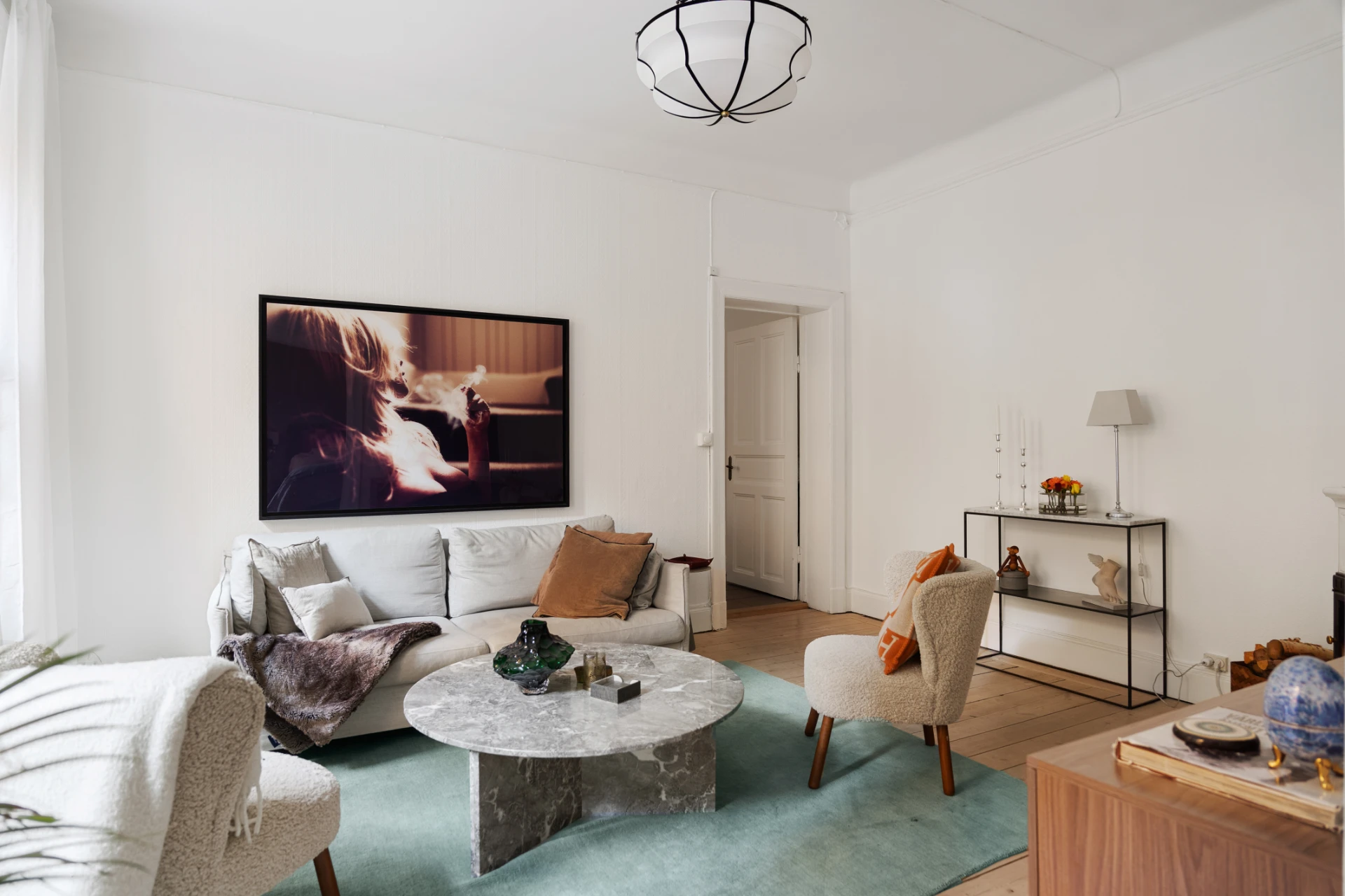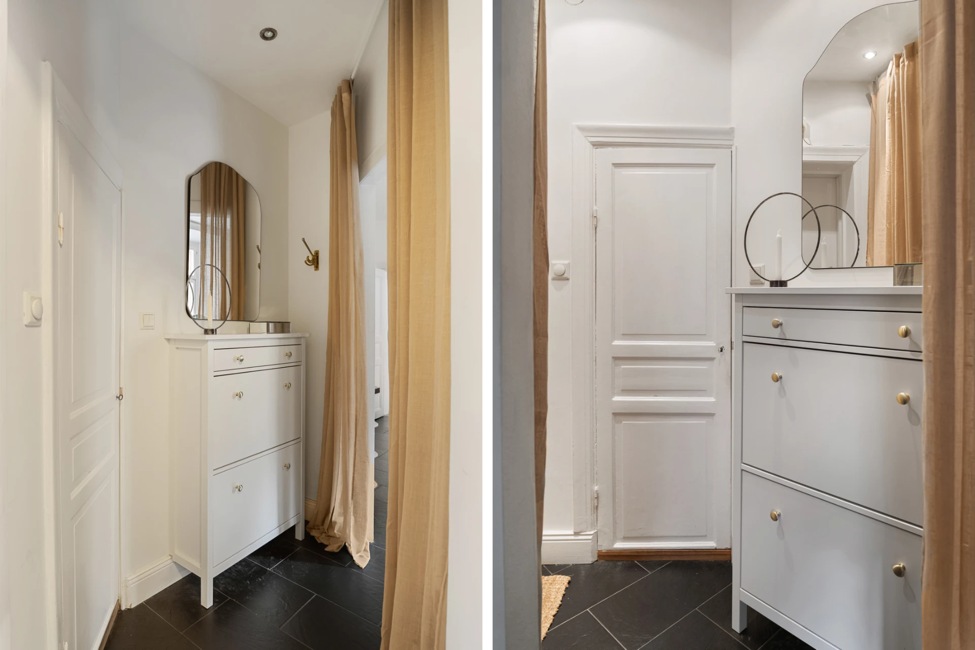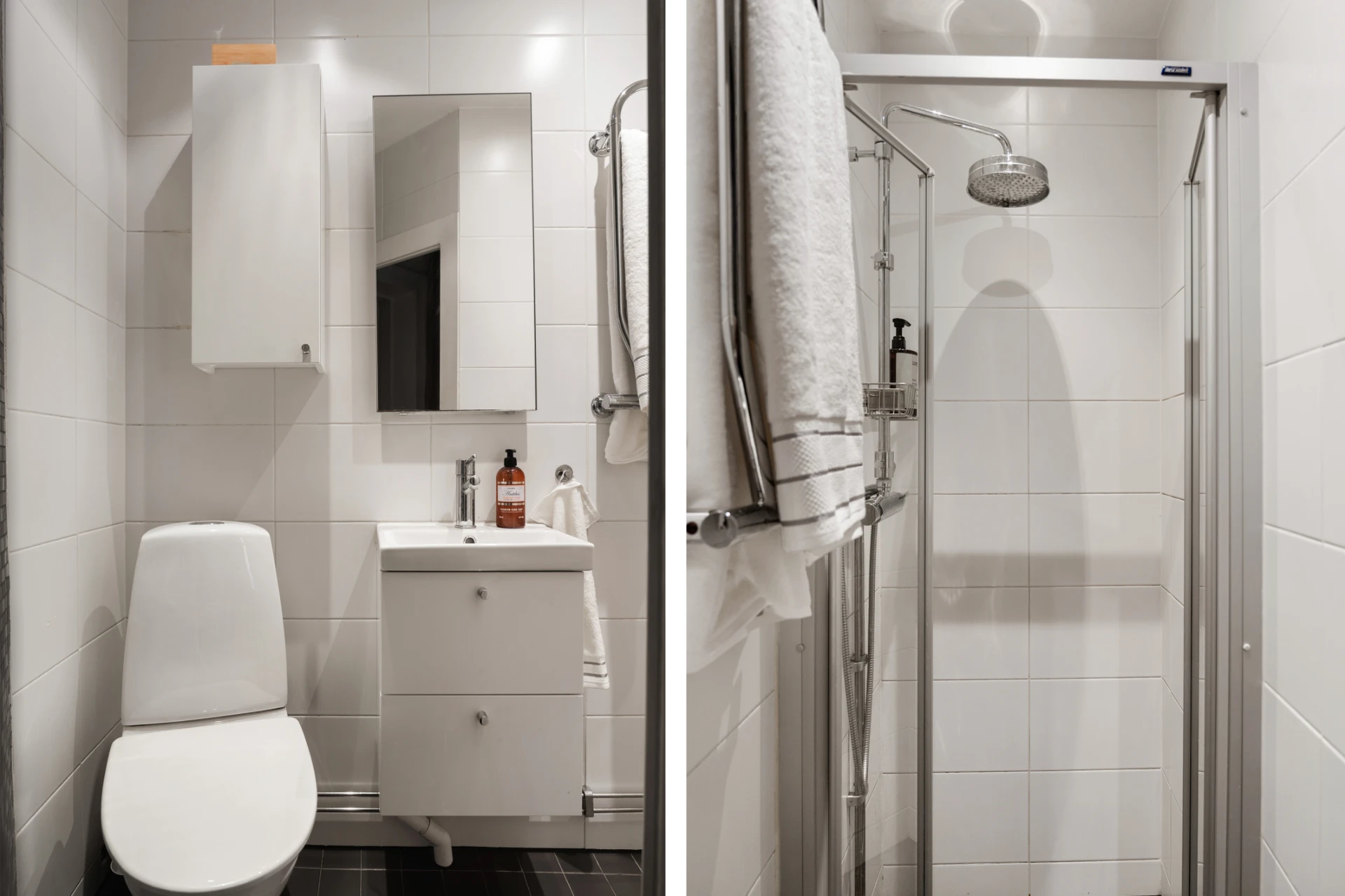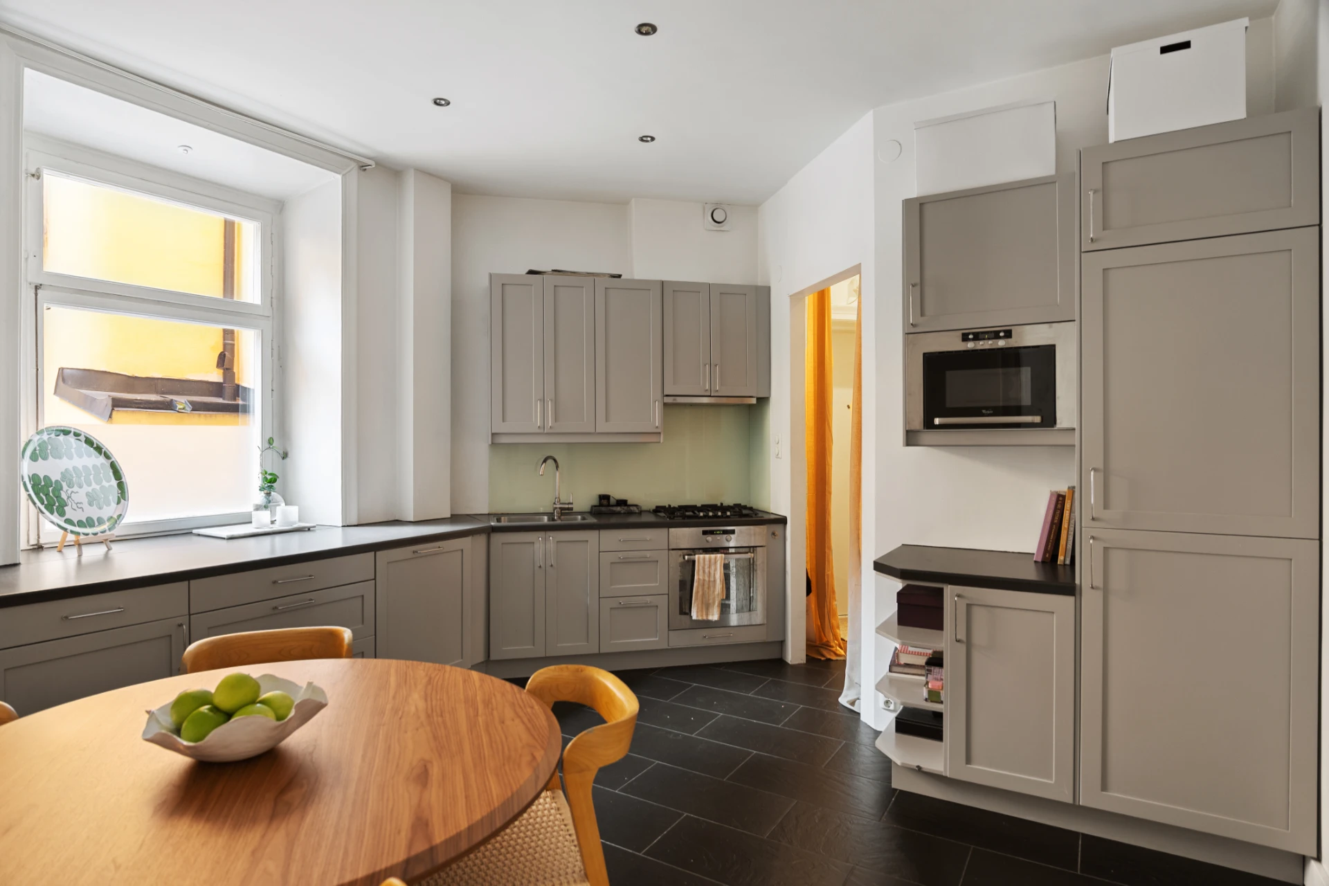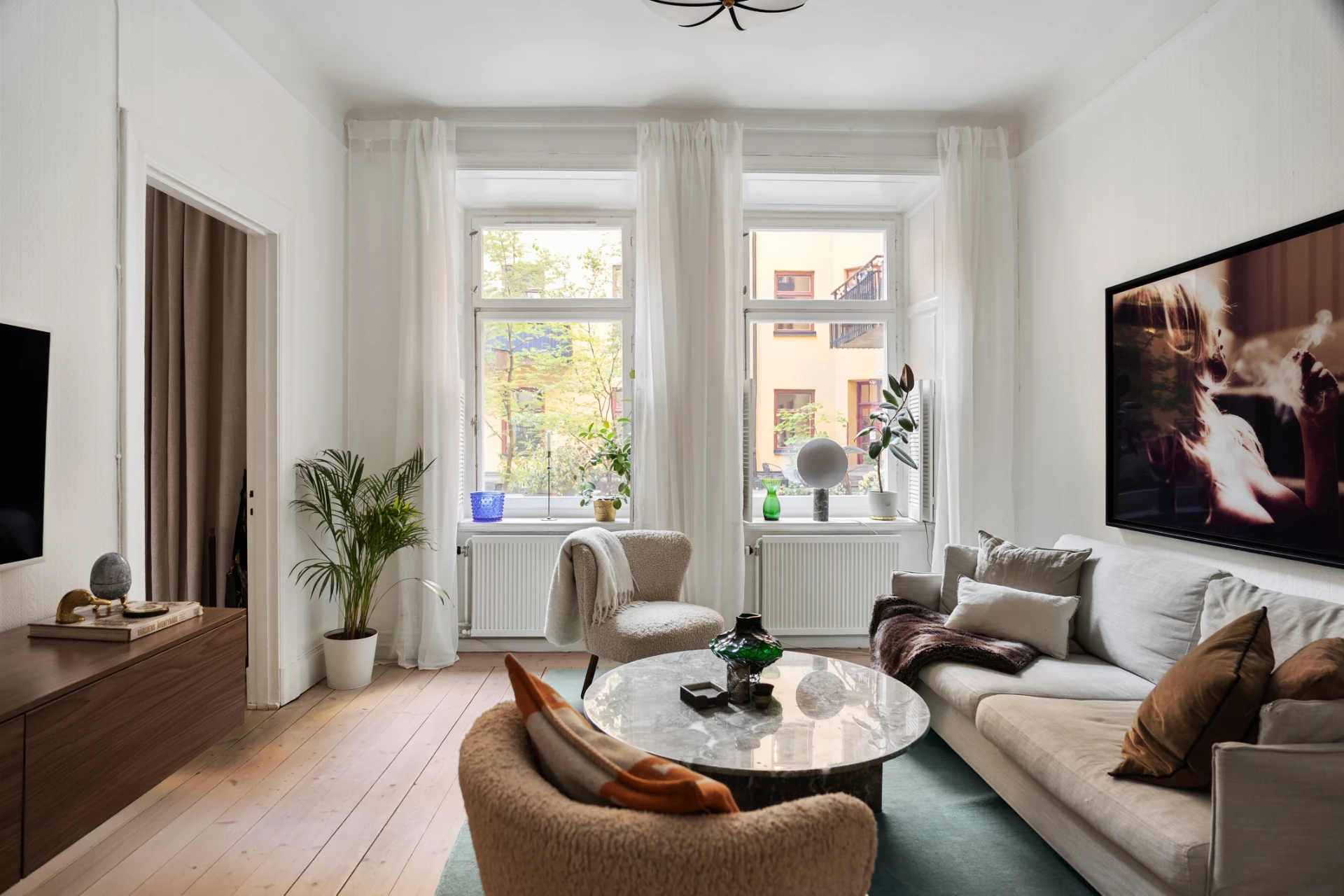 Redan i hallen möts du av en välkomnande atmosfär med ljusa väggar och stilrent mörkt klinkergolv. Här finns gott om plats för avhängning av ytterkläder och skor, vilket gör entrén både praktisk och inbjudande. Det moderna köket bjuder på en harmonisk kombination av ljusgrå fronter och mörk bänkskiva. Här finns bra arbetsytor, generös förvaring och full maskinell utrustning med gasspis, ugn, fläkt samt integrerade vitvaror som kyl/frys och diskmaskin. Den sociala planlösningen gör att köket även rymmer ett matbord för fyra personer – perfekt för både vardagsmiddagar och trevliga kvällar med vänner. Vardagsrummet är bostadens hjärta. Ljusa väggar, vackert trägolv och tilltalande takhöjd möter ett fantastiskt ljusflöde från två stora fönster med djupa nischer. Här ryms enkelt en generös soffgrupp, soffbord och mediamöbel. Den tidstypiska kakelugnen ger rummet en extra dimension av karaktär och charm – en vacker detalj att samlas kring. Det rofyllda sovrummet ligger mot den lugna innergården och pryds av väggar i mjuk grå ton, fint trägolv och ett stort fönster som släpper in ljuset på ett behagligt sätt. Här finns gott om förvaring i platsbyggda garderober samt plats för dubbelsäng och sidobord. Badrummet är helkaklat i tidlös design med vita väggar och mörkt klinkergolv. Här finns WC, handfat med kommod och spegelskåp ovan, dusch samt en praktisk handdukstork.