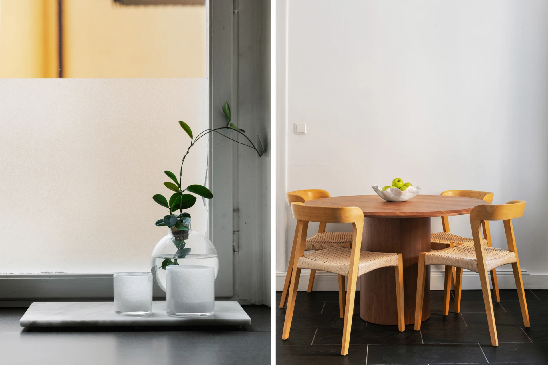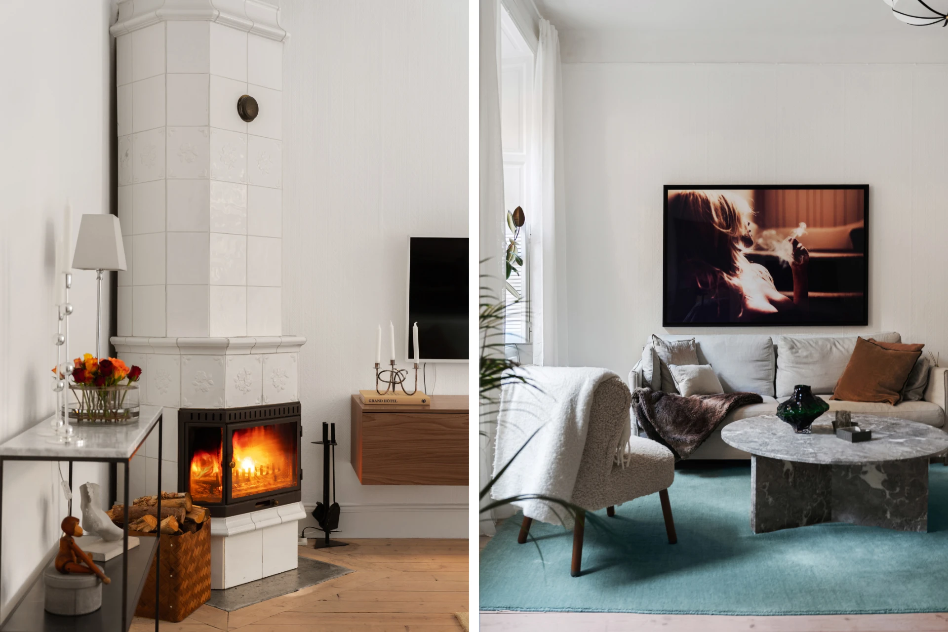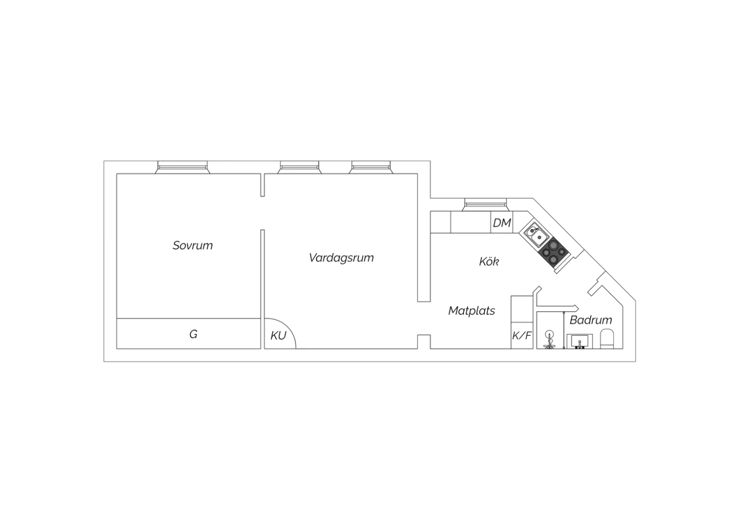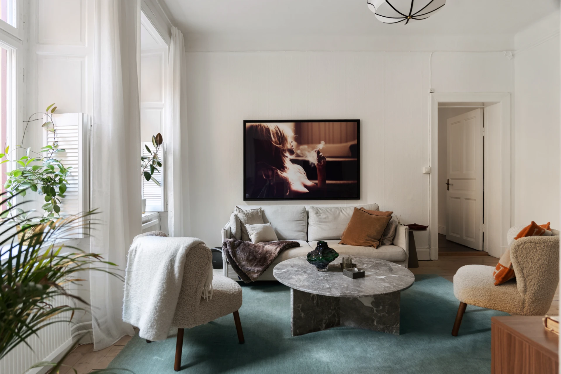 Redan i hallen möts du av en välkomnande atmosfär med ljusa väggar och stilrent mörkt klinkergolv. Här finns gott om plats för avhängning av ytterkläder och skor, vilket gör entrén både praktisk och inbjudande. Det moderna köket bjuder på en harmonisk kombination av ljusgrå fronter och mörk bänkskiva. Här finns bra arbetsytor, generös förvaring och full maskinell utrustning med gasspis, ugn, fläkt samt integrerade vitvaror som kyl/frys och diskmaskin. Den sociala planlösningen gör att köket även rymmer ett matbord för fyra personer – perfekt för både vardagsmiddagar och trevliga kvällar med vänner. Vardagsrummet är bostadens hjärta. Ljusa väggar, vackert trägolv och tilltalande takhöjd möter ett fantastiskt ljusflöde från två stora fönster med djupa nischer. Här ryms enkelt en generös soffgrupp, soffbord och mediamöbel. Den tidstypiska kakelugnen ger rummet en extra dimension av karaktär och charm – en vacker detalj att samlas kring. Det rofyllda sovrummet ligger mot den lugna innergården och pryds av väggar i mjuk grå ton, fint trägolv och ett stort fönster som släpper in ljuset på ett behagligt sätt. Här finns gott om förvaring i platsbyggda garderober samt plats för dubbelsäng och sidobord. Badrummet är helkaklat i tidlös design med vita väggar och mörkt klinkergolv. Här finns WC, handfat med kommod och spegelskåp ovan, dusch samt en praktisk handdukstork.