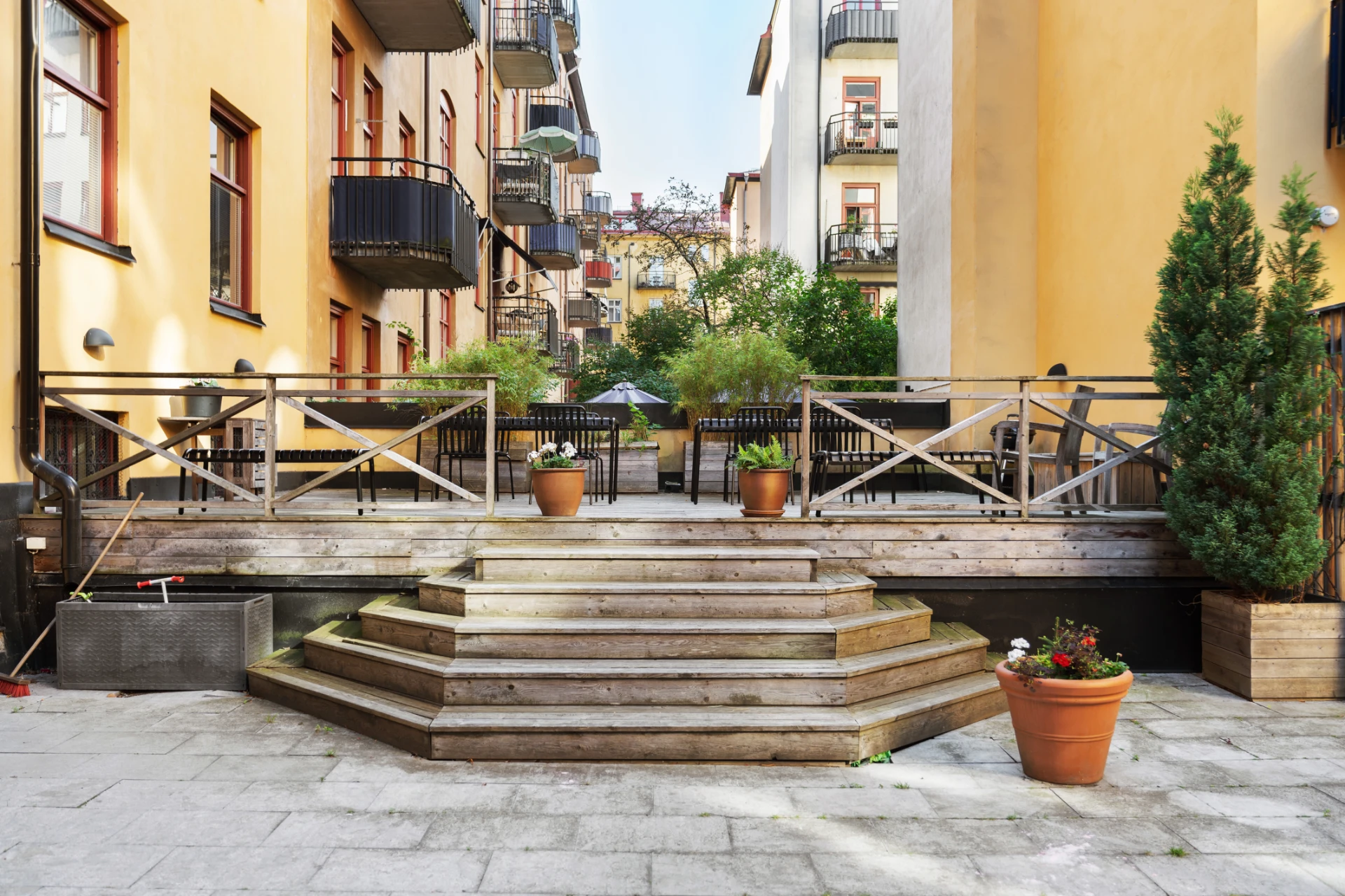 I föreningen finns en stor och lummig innergård med två möblerade uteplatser samt tillgång till grill. Gemensam tvättstuga finns i källarplan och är utrustad med 2 tvättmaskiner, en torktumlare och ett torkskåp. I föreningen finns barnvagnsrum som ligger i gången till C/D och cykelställ på gården.