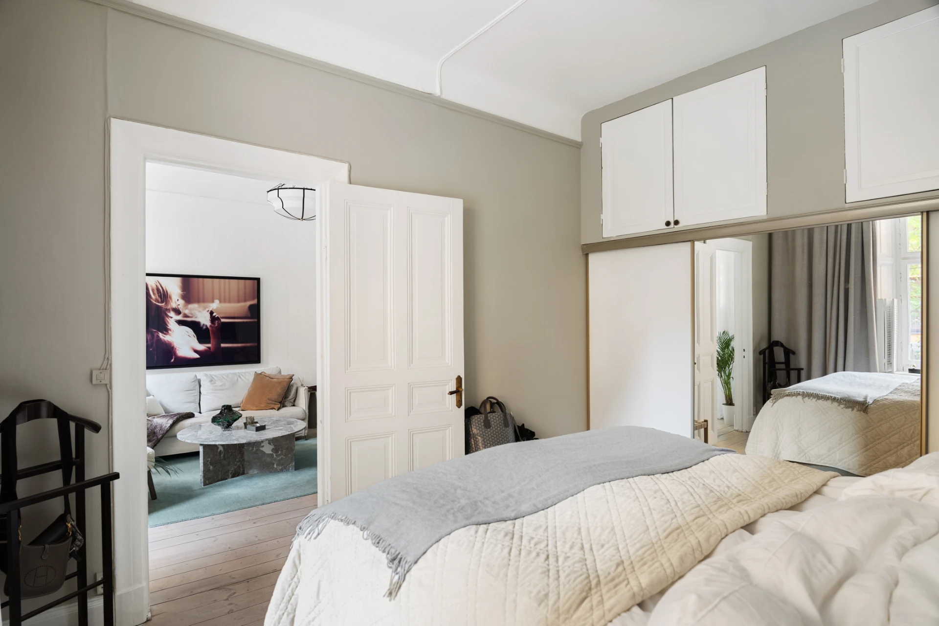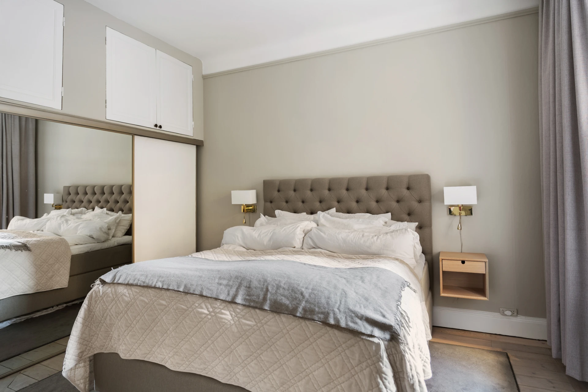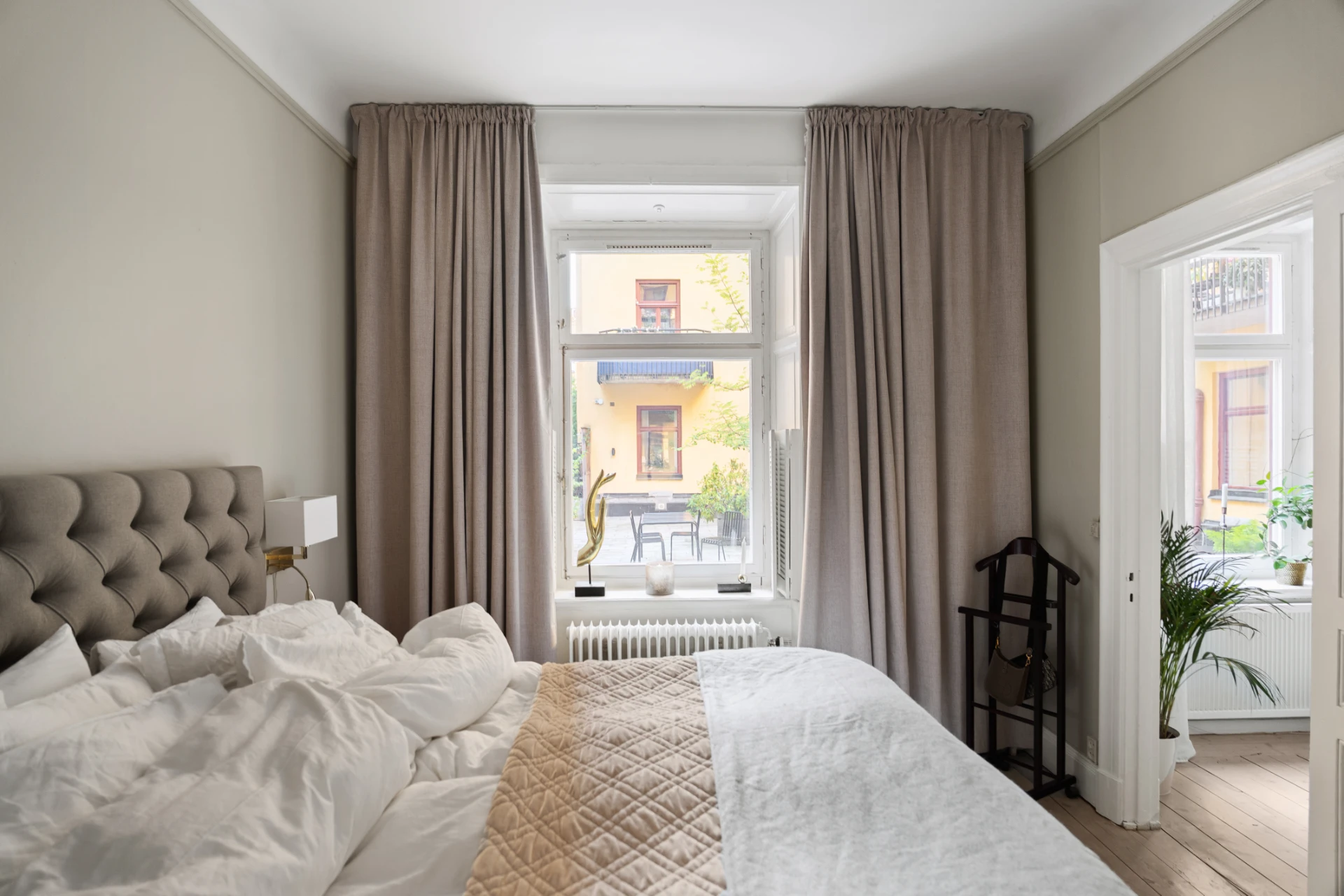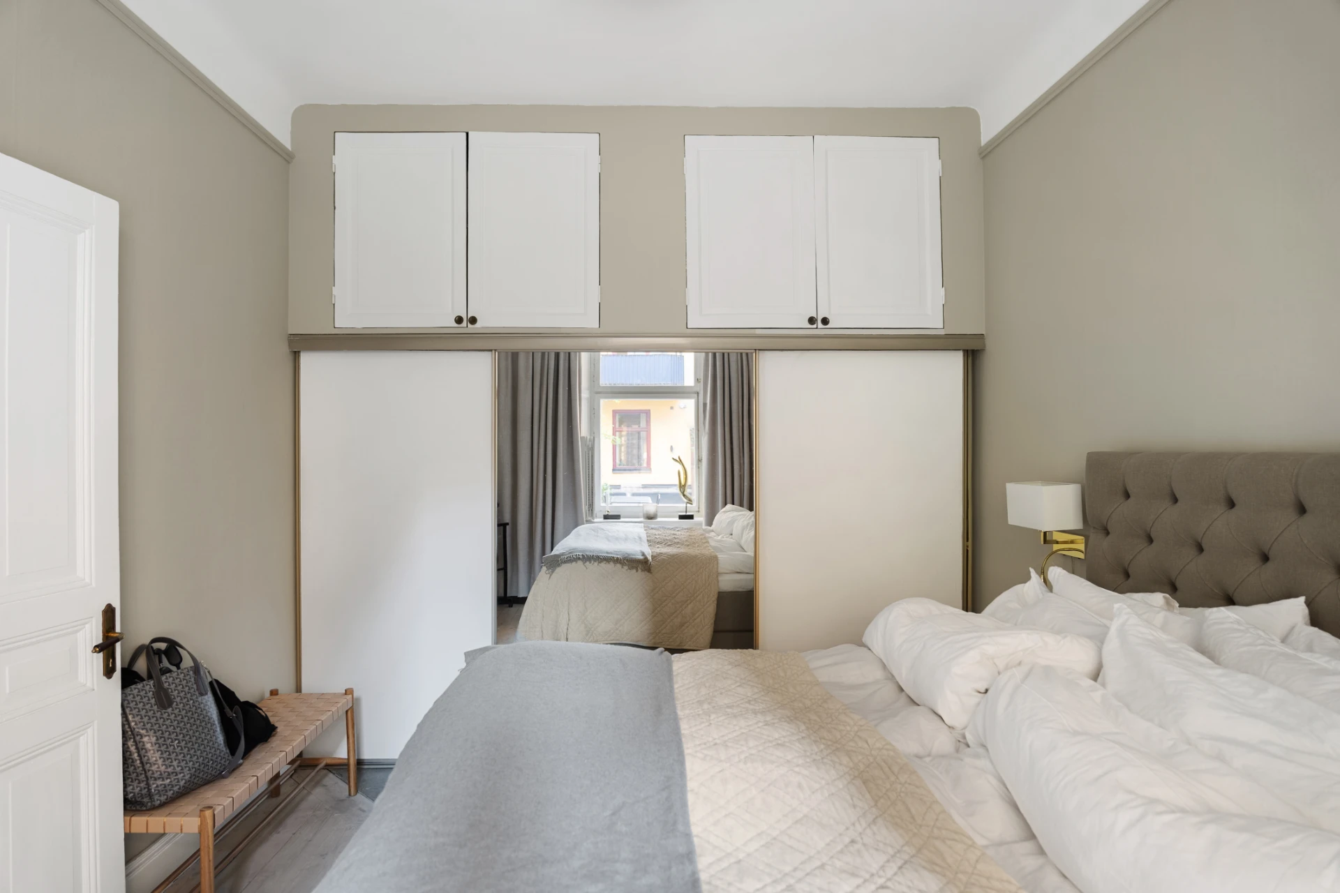 Mysigt sovrum med väggar i ljusgrå, trägolv samt fint ljusinsläpp från stort fönster mot den lugna innergården. God förvaring i platsbyggda garderober. Plats för dubbelsäng samt sidobord.