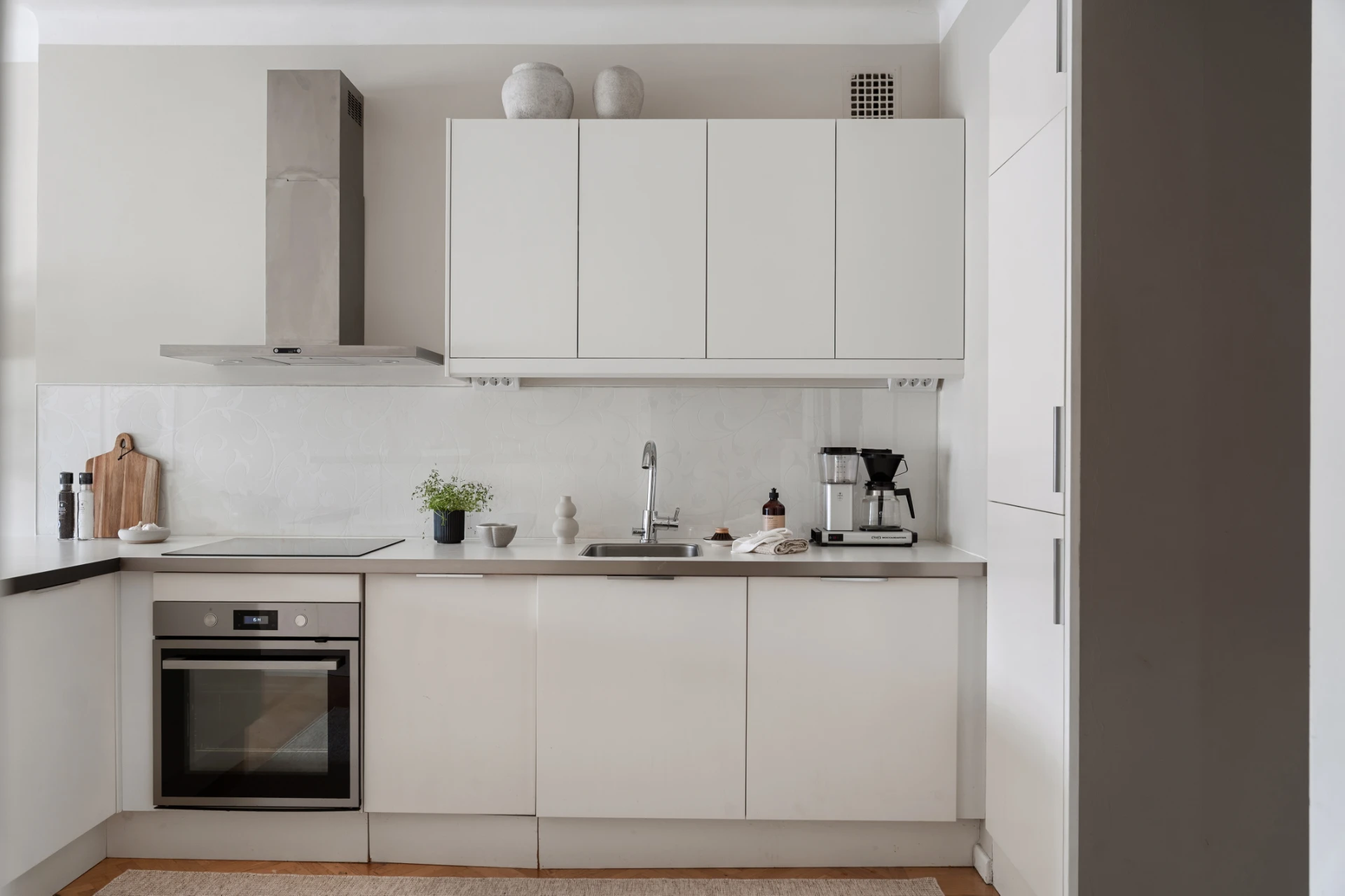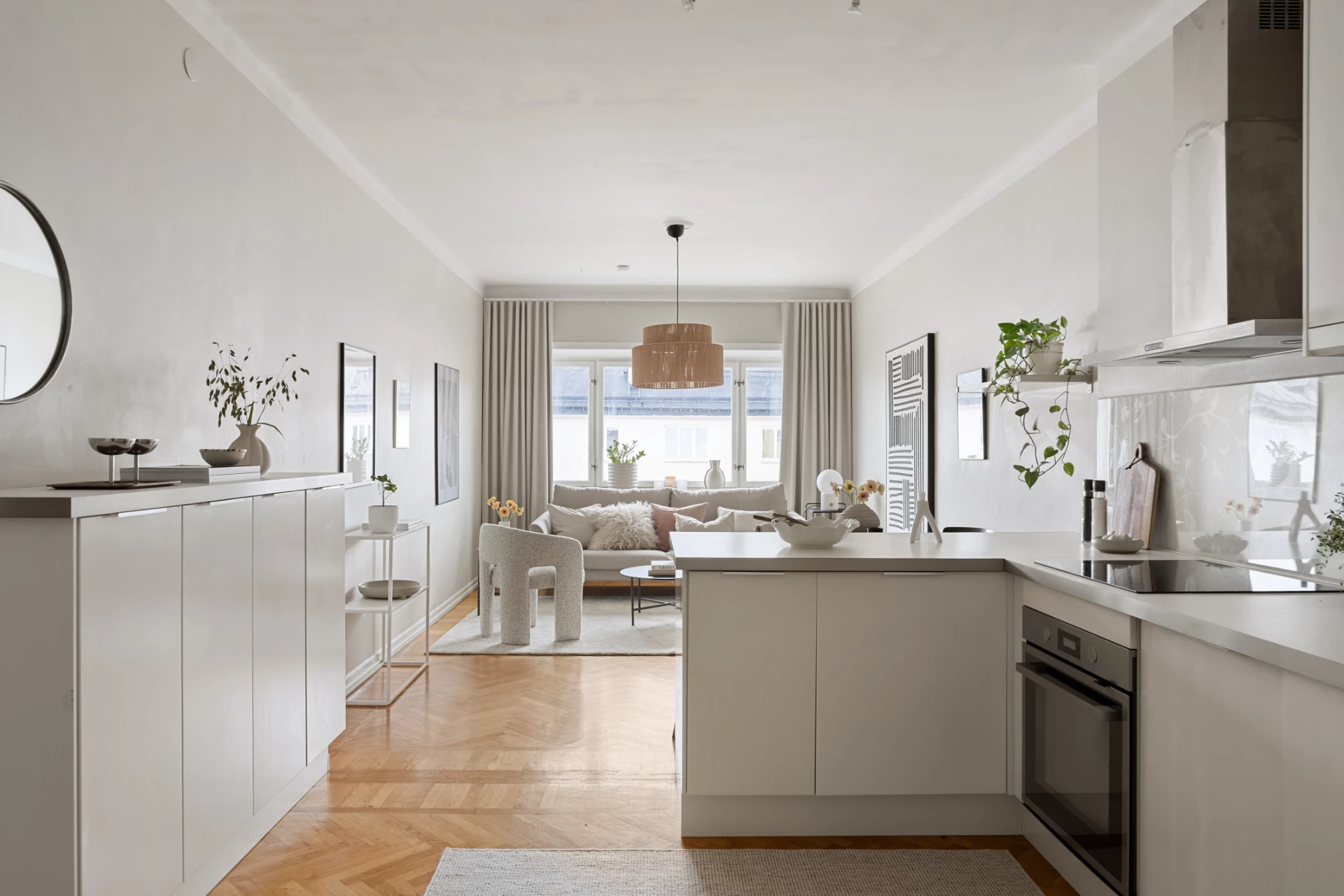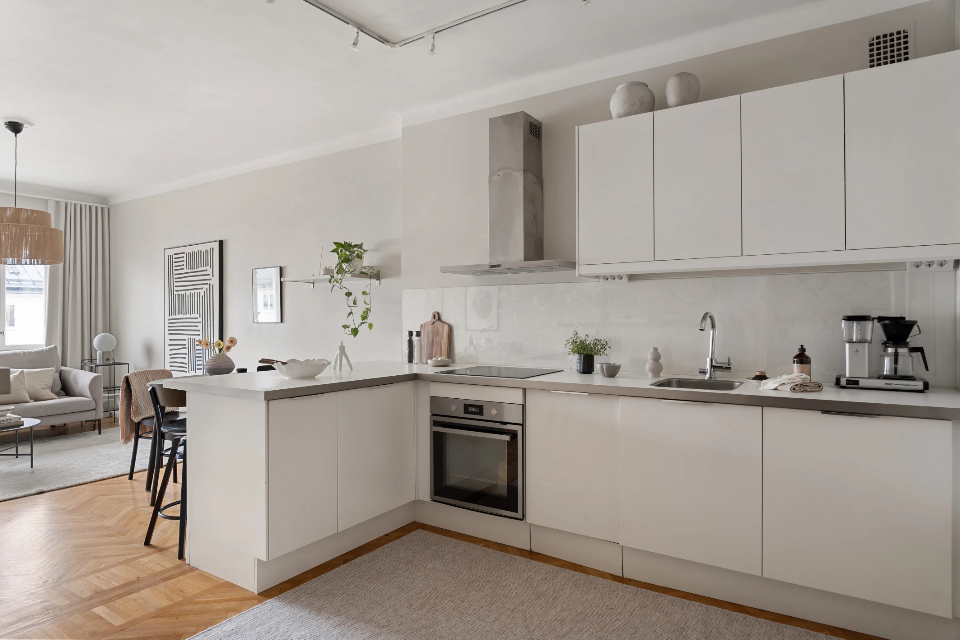 Redan i hallen möts du av ett inbjudande ljus och en harmonisk atmosfär. De genomgående trägolven och de ljusa väggarna sätter tonen för bostadens stilrena helhet, samtidigt som de generösa avhängningsmöjligheterna skapar både ordning och trivsel. Vidare in öppnar det eleganta köket upp sig – en plats där funktion och estetik möts. De vita fronterna och den ljusa bänkskivan ger en tidlös känsla, medan glaspanelen som stänkskydd adderar en modern touch. Här finns gott om förvaring och utrustning i form av spis, ugn, fläkt, integrerad diskmaskin samt kyl och frys. Köksön blir en naturlig samlingspunkt för både vardag och umgänge, med plats för två sittande. Köket övergår sömlöst i vardagsrummet – ett rum som verkligen bjuder in till samvaro. Det stora fönstret släpper in rikligt med ljus och skapar en varm, inbjudande känsla. Här finns gott om utrymme för både soffa, matsalsbord och TV-möbel, vilket gör rummet perfekt för både avslappnade kvällar och middagar med vänner. Sovrummet är rofyllt och vilsamt med ljusgrå väggar som skapar en behaglig kontrast till trägolven. Här finns plats för säng och personlig inredning, och genom den glasade dörren nås bostadens underbara balkong mot den lugna gården. Intill sovrummet finns dessutom en rymlig klädkammare som ger utmärkta förvaringsmöjligheter. Badrummet är stilrent och genomtänkt med vitt kakel, grått klinkergolv och moderna detaljer. Här finns allt du behöver för vardagens bekvämlighet: WC, handfat med svart kommod, spegelskåp, handdukstork, Kombinerad tvätt och torkmaskin , väggskåp för extra förvaring samt en dusch med infällbara glasväggar.