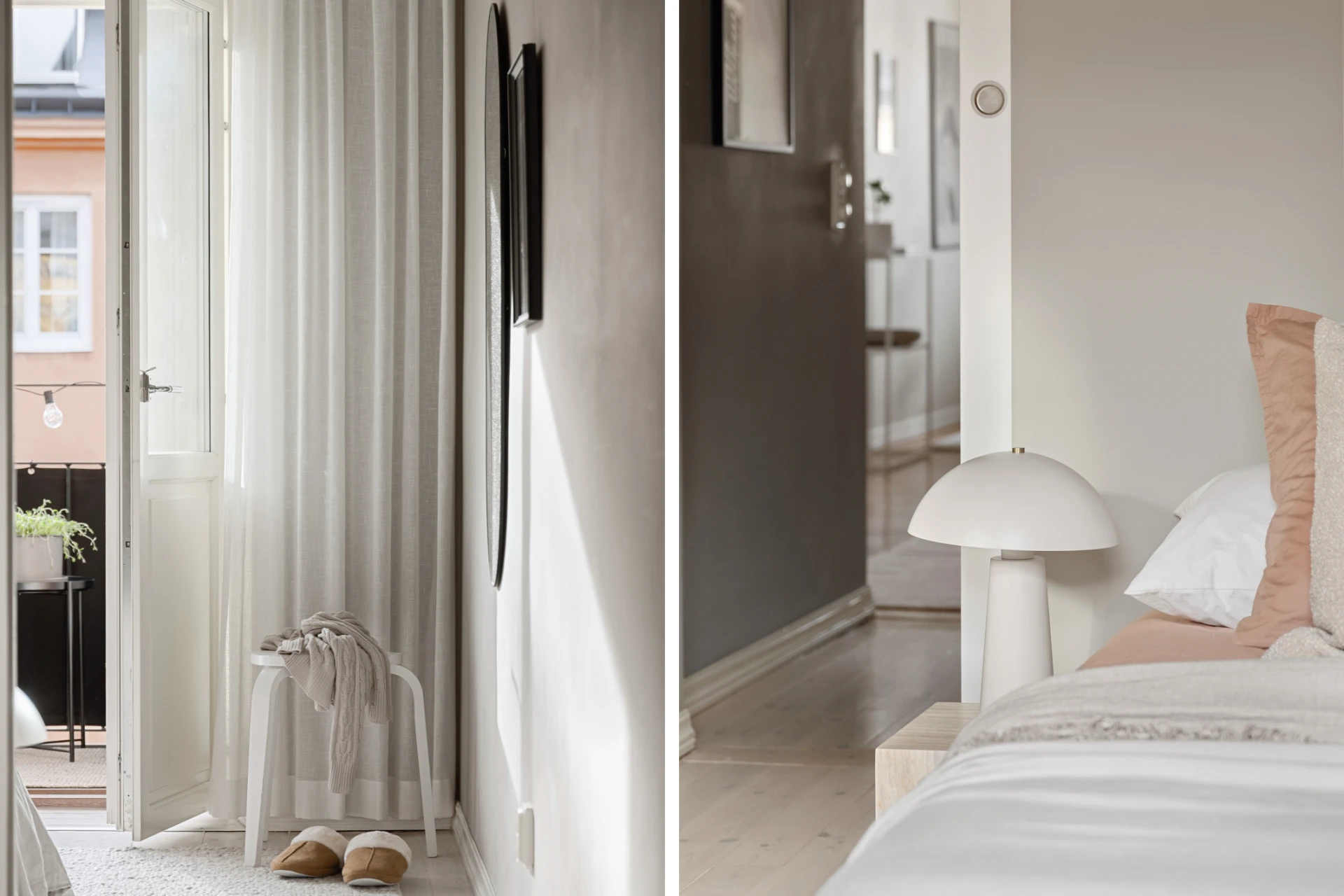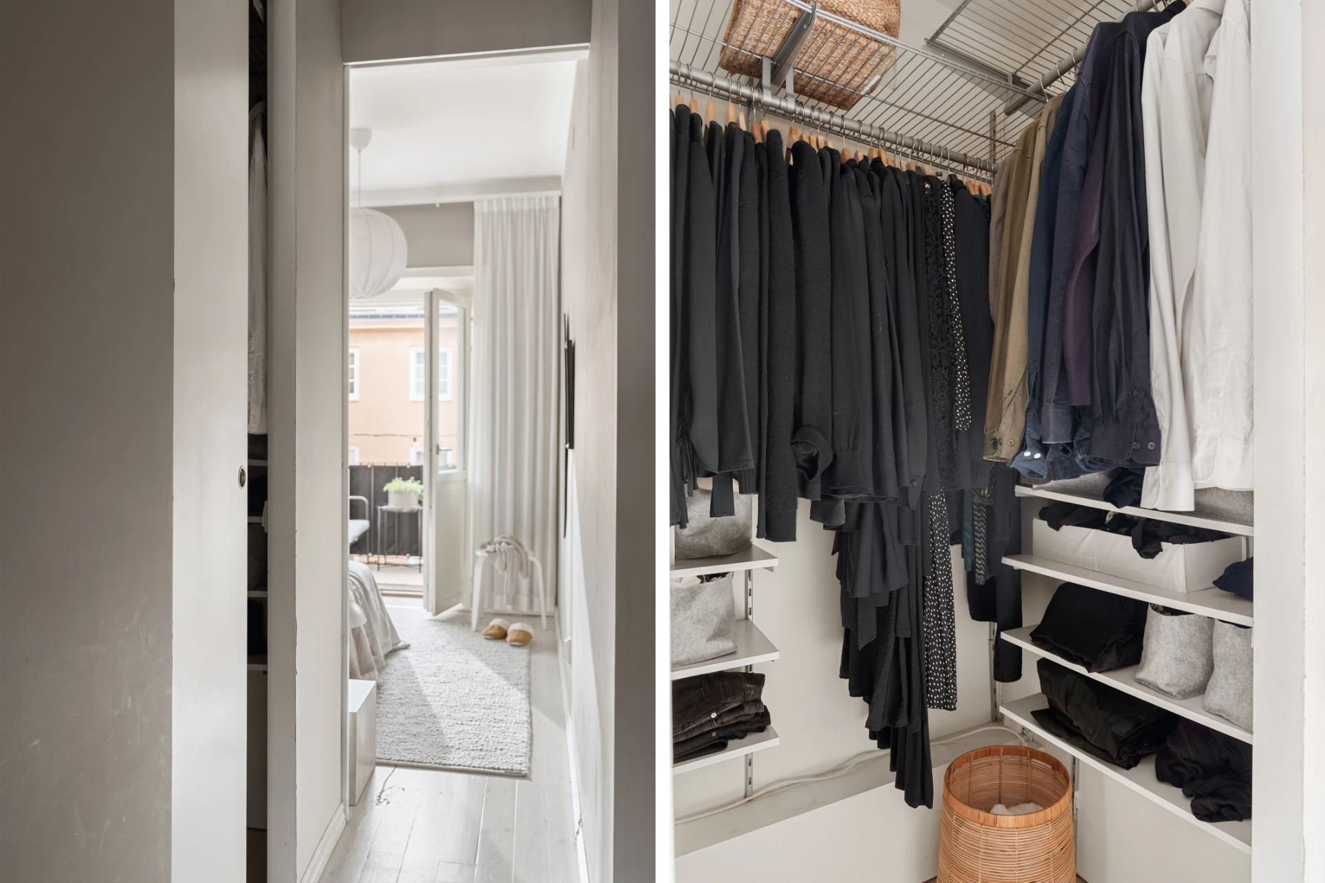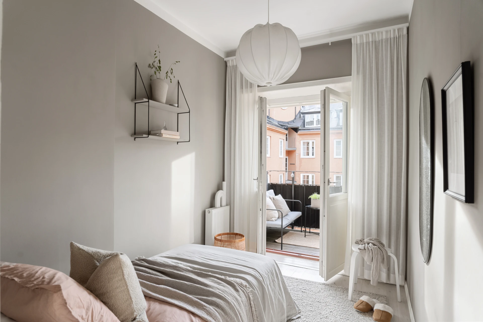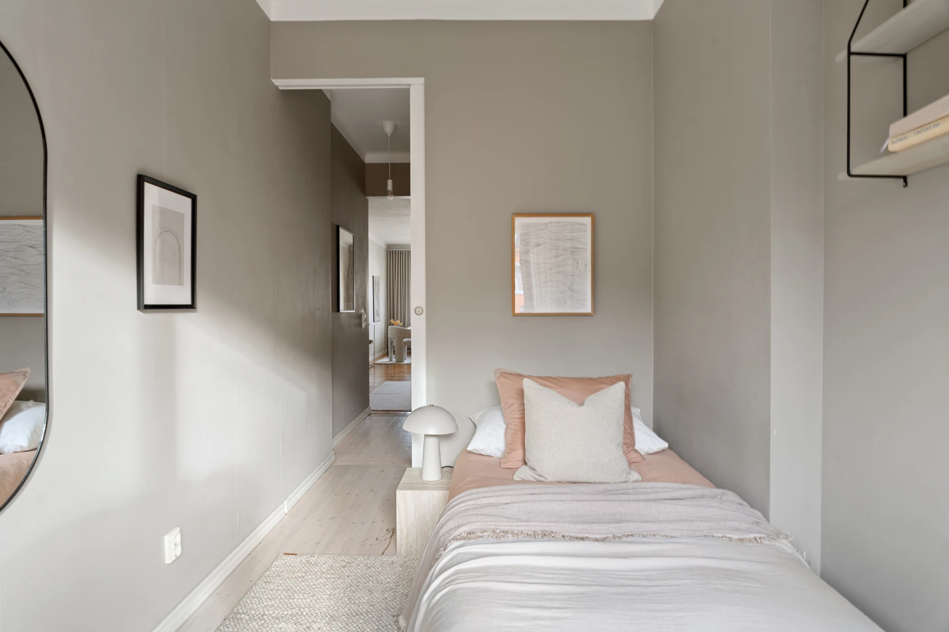 Mysigt sovrum med väggar i ljusgrått och plats för mindre säng. Från sovrummet når ni bostadens fantastiska balkong mot gården. Invid sovrummet finns en rymlig klädkammare.