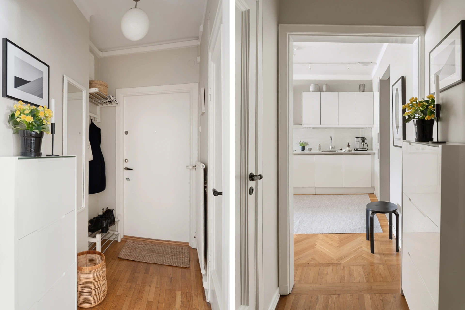Trevlig och inbjudande hall med ljusa väggar och trägolv som är genomgående i hela bostaden. Goda avhängninsmöjligheter för ytterkläder och skor.