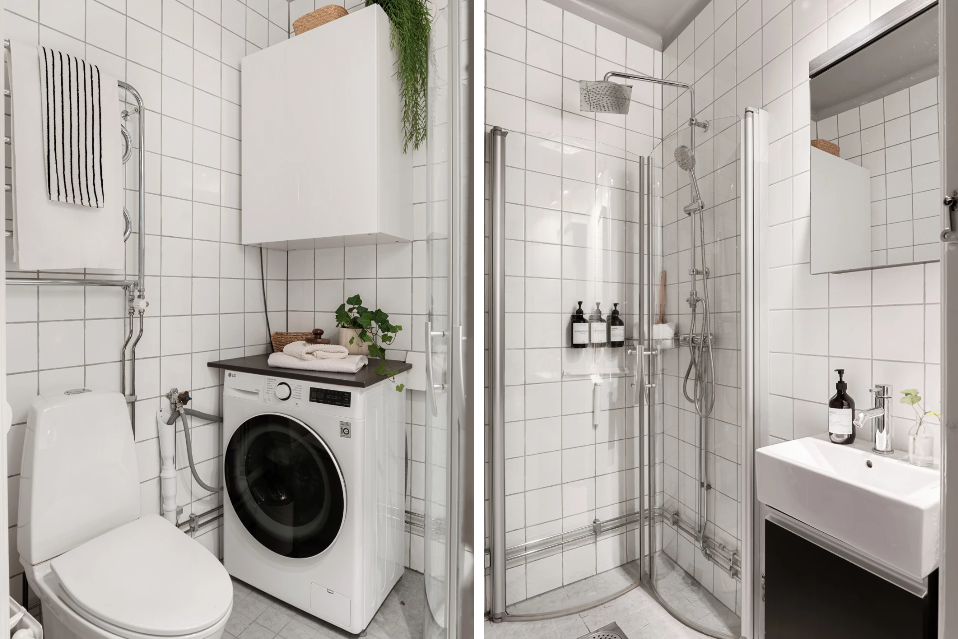 Helkaklad badrum med vitt kakel på väggarna samt grått klinkergolv. Utrustat med WC, handfat med svart kommod och spegelskåp ovan, praktisk handukstork, tvättmaskin, väggskåp för extra förvaring samt dusch med infällbara glasväggar.