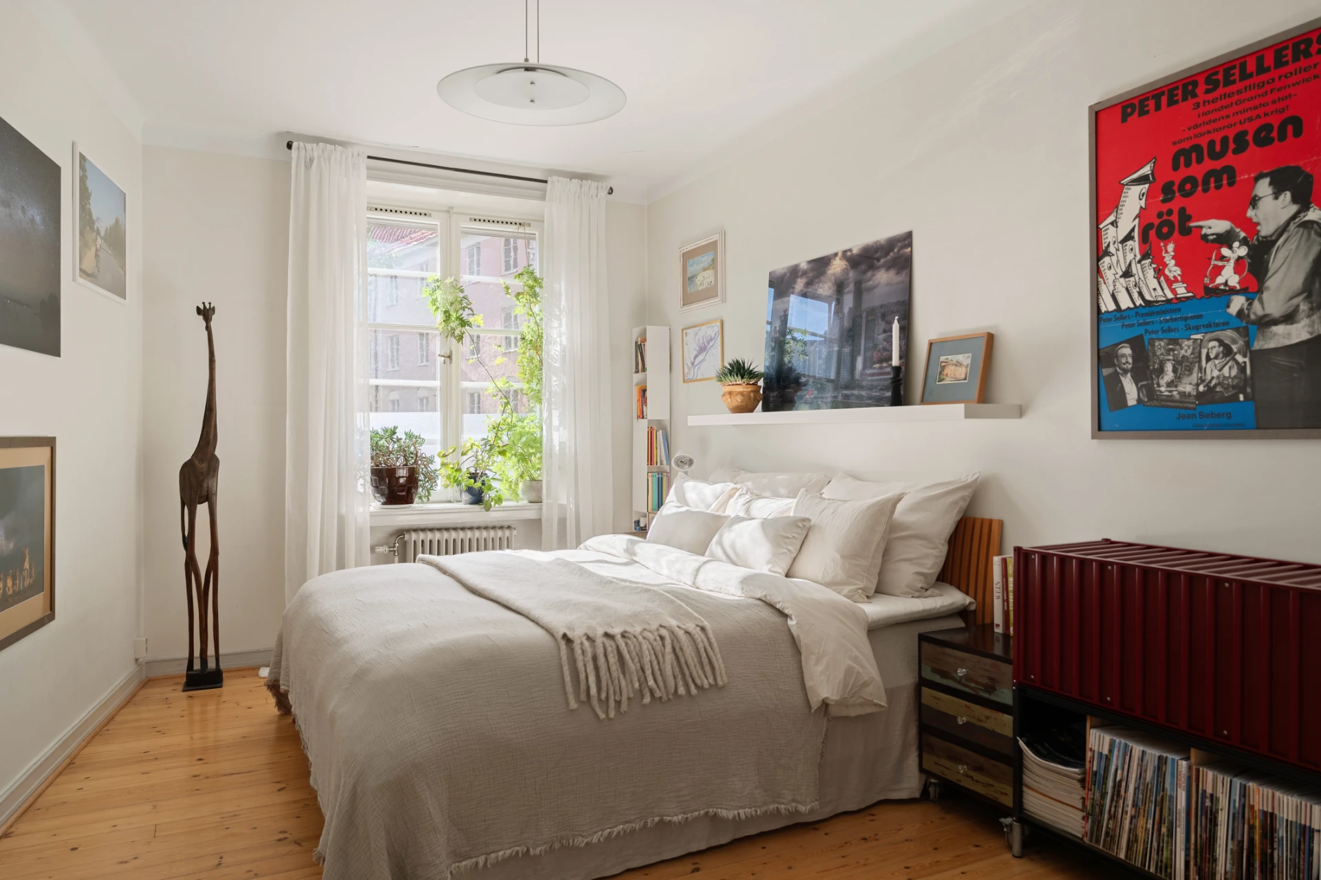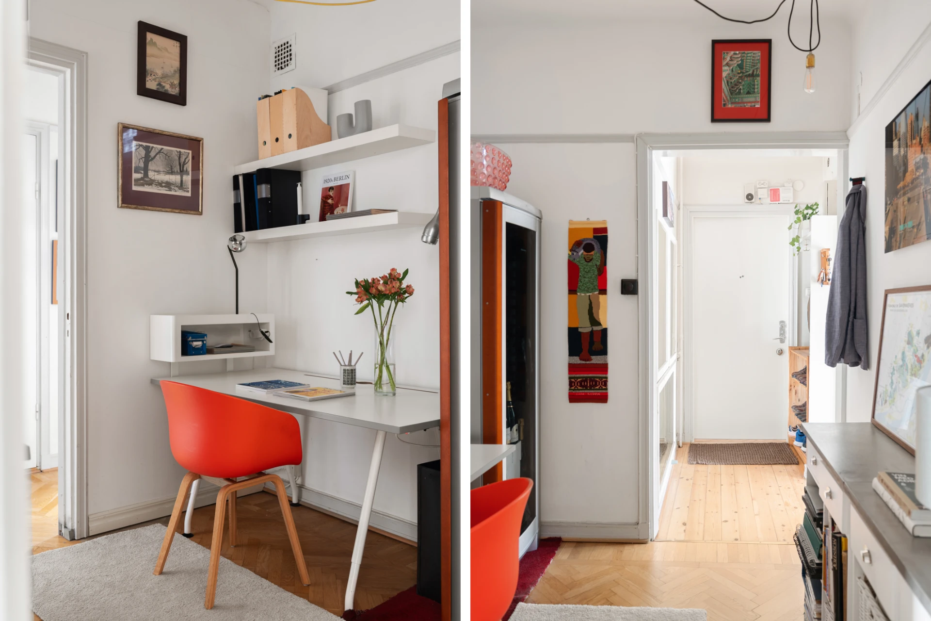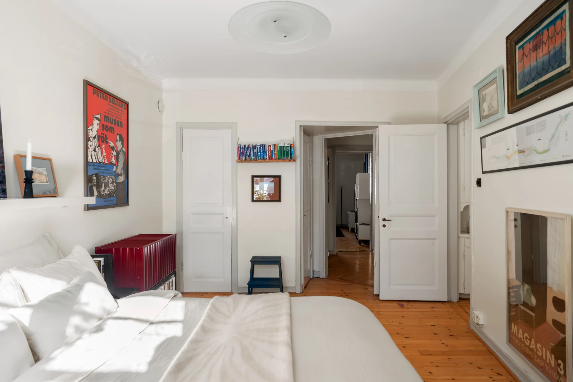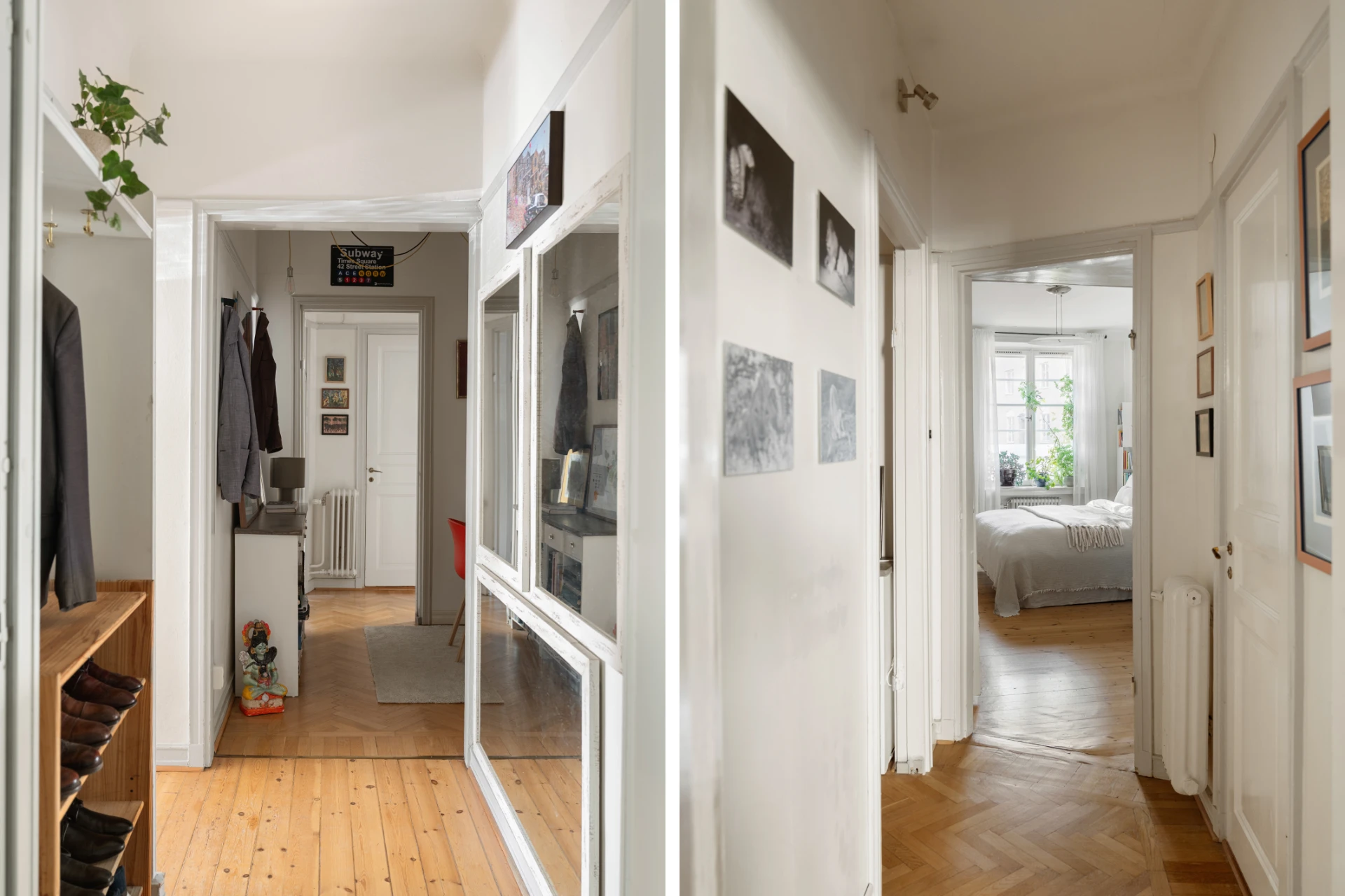 Hallen välkomnar med ett ljust och öppet intryck, där ytterkläder och skor enkelt får sin plats. Från hallen leds du vidare till det extra rummet – en flexibel yta som passar utmärkt som arbetsplats eller för den som vill skapa ett eget utrymme för hobbies. Köket är stort och genomtänkt med gott om förvaring bakom mintgröna fronter från PickyLiving. Här samsas charm och funktion – det tidstypiska serveringsskåpet blir en fin detalj, medan den moderna utrustningen gör vardagen smidig med kyl/frys, diskmaskin, fläkt, ugn och gasspis. Stänkskyddet i klassiskt kakel ramar in arbetsytorna och vid matplatsen finns utrymme för både vardagsmåltider och middagar med familj och vänner. Bostaden erbjuder också ett extra rum, perfekt som arbetsplats eller för den som vill skapa ett eget utrymme för gäster eller hobbies. Sovrummet är rofyllt med fint ljusinsläpp och gott om plats för dubbelsäng, sidobord och förvaring. Ett rum som känns både ombonat och praktiskt. Badrummet, renoverat 2024, bjuder på en stilren och modern känsla med industriell ton. Gröna kaklade väggar möter mörkt klinkergolv och smarta lösningar som dusch med infällbara glasdörrar, handdukstork och infälld hylla för förvaring. Här finns även WC, handfat med kommod och spegelskåp.