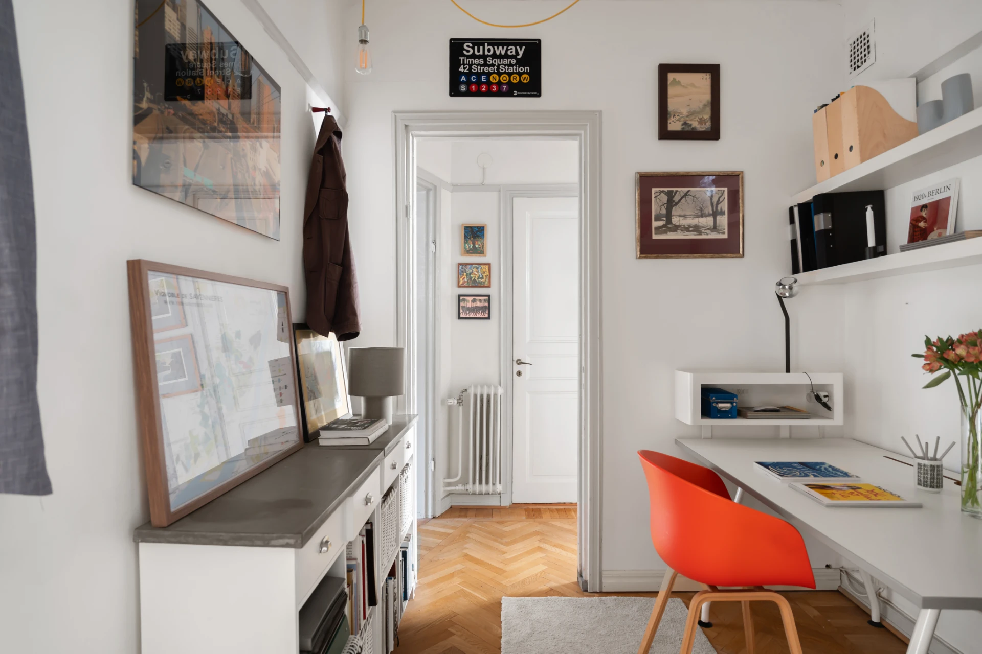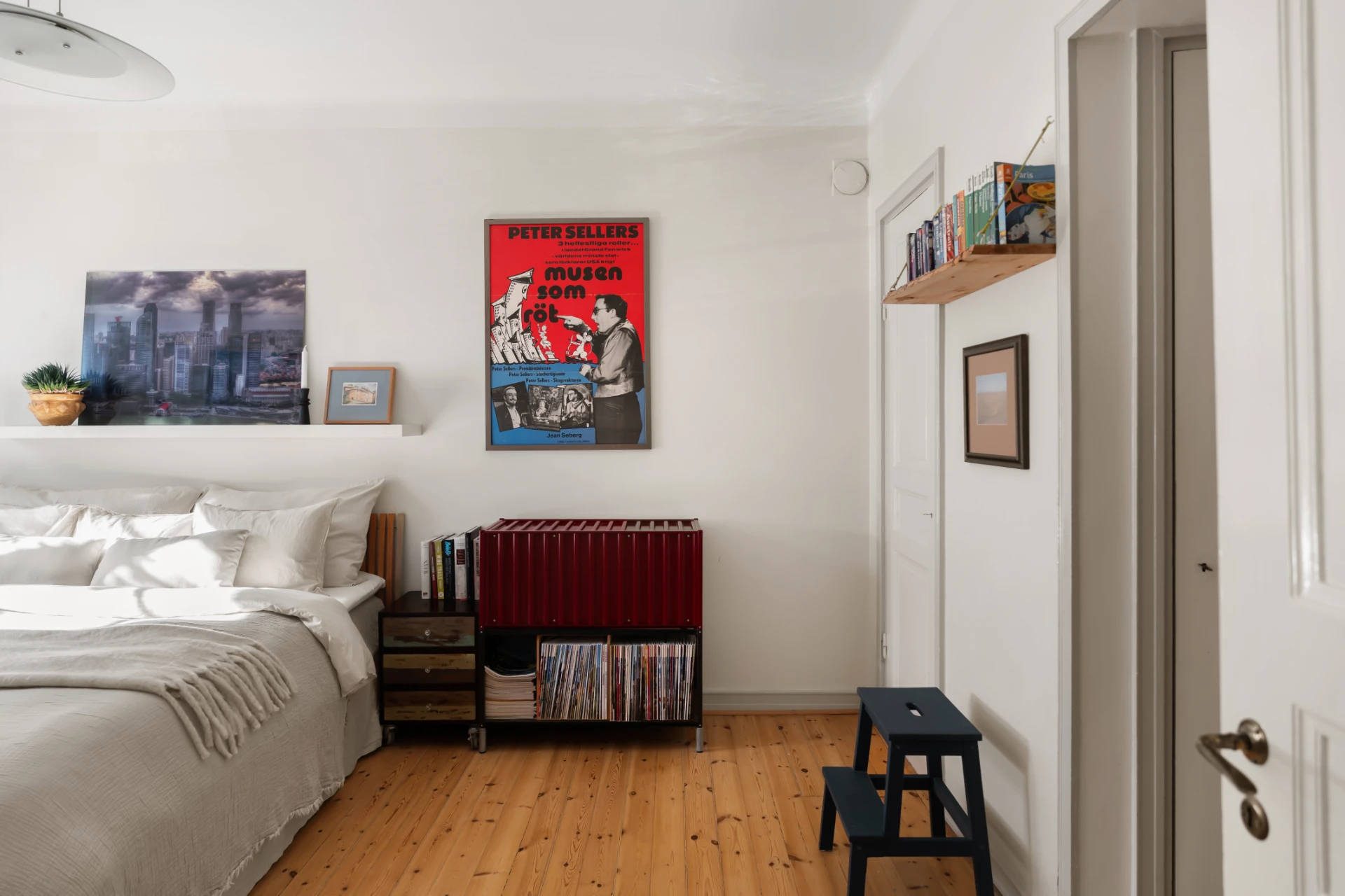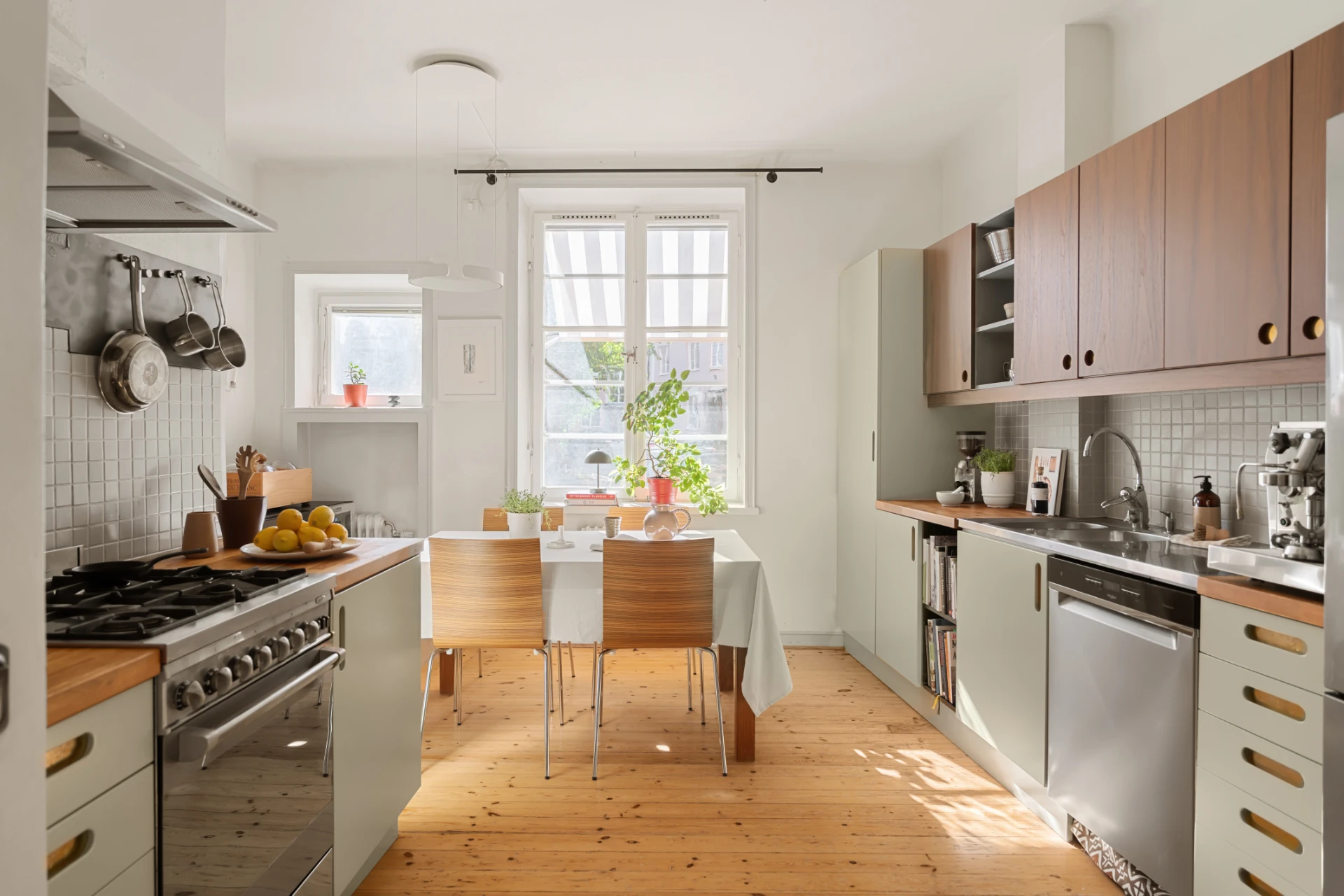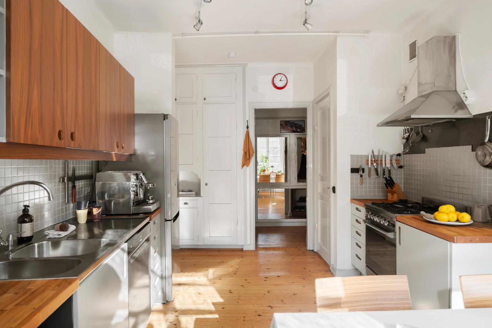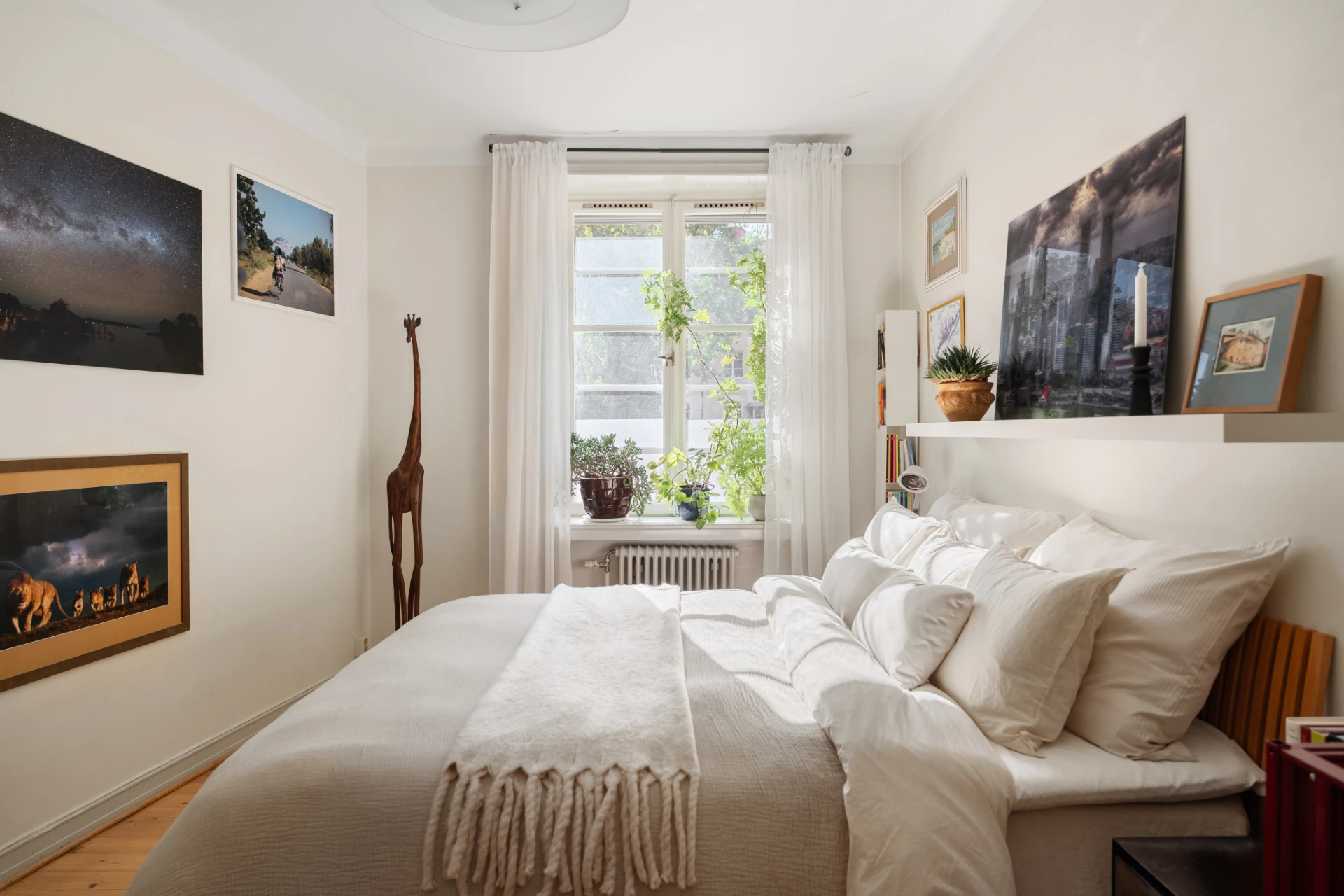 Hallen välkomnar med ett ljust och öppet intryck, där ytterkläder och skor enkelt får sin plats. Från hallen leds du vidare till det extra rummet – en flexibel yta som passar utmärkt som arbetsplats eller för den som vill skapa ett eget utrymme för hobbies. Köket är stort och genomtänkt med gott om förvaring bakom mintgröna fronter från PickyLiving. Här samsas charm och funktion – det tidstypiska serveringsskåpet blir en fin detalj, medan den moderna utrustningen gör vardagen smidig med kyl/frys, diskmaskin, fläkt, ugn och gasspis. Stänkskyddet i klassiskt kakel ramar in arbetsytorna och vid matplatsen finns utrymme för både vardagsmåltider och middagar med familj och vänner. Bostaden erbjuder också ett extra rum, perfekt som arbetsplats eller för den som vill skapa ett eget utrymme för gäster eller hobbies. Sovrummet är rofyllt med fint ljusinsläpp och gott om plats för dubbelsäng, sidobord och förvaring. Ett rum som känns både ombonat och praktiskt. Badrummet, renoverat 2024, bjuder på en stilren och modern känsla med industriell ton. Gröna kaklade väggar möter mörkt klinkergolv och smarta lösningar som dusch med infällbara glasdörrar, handdukstork och infälld hylla för förvaring. Här finns även WC, handfat med kommod och spegelskåp.