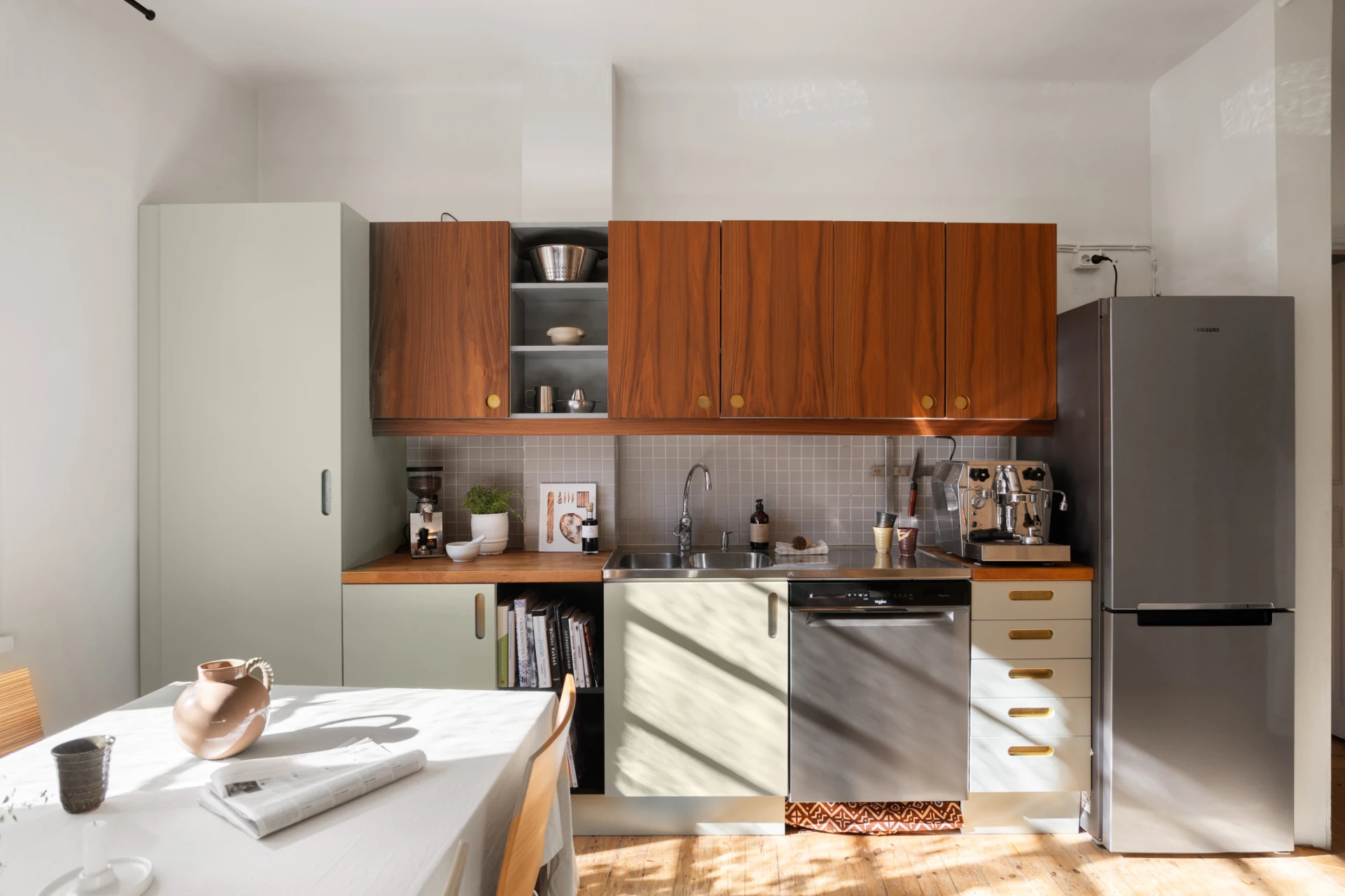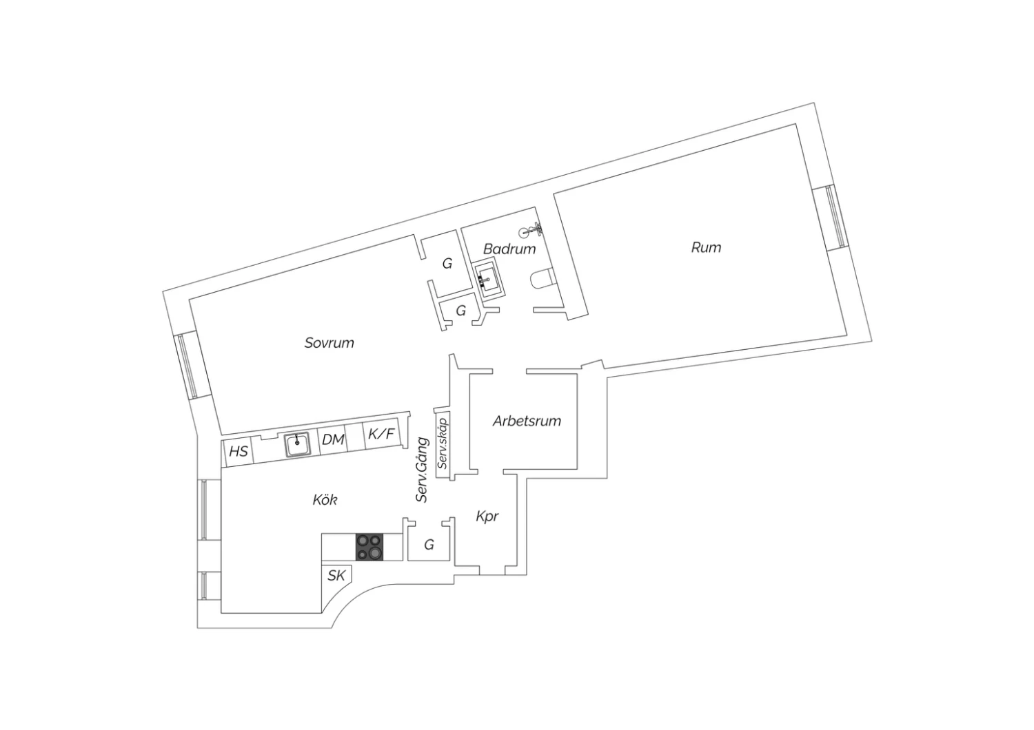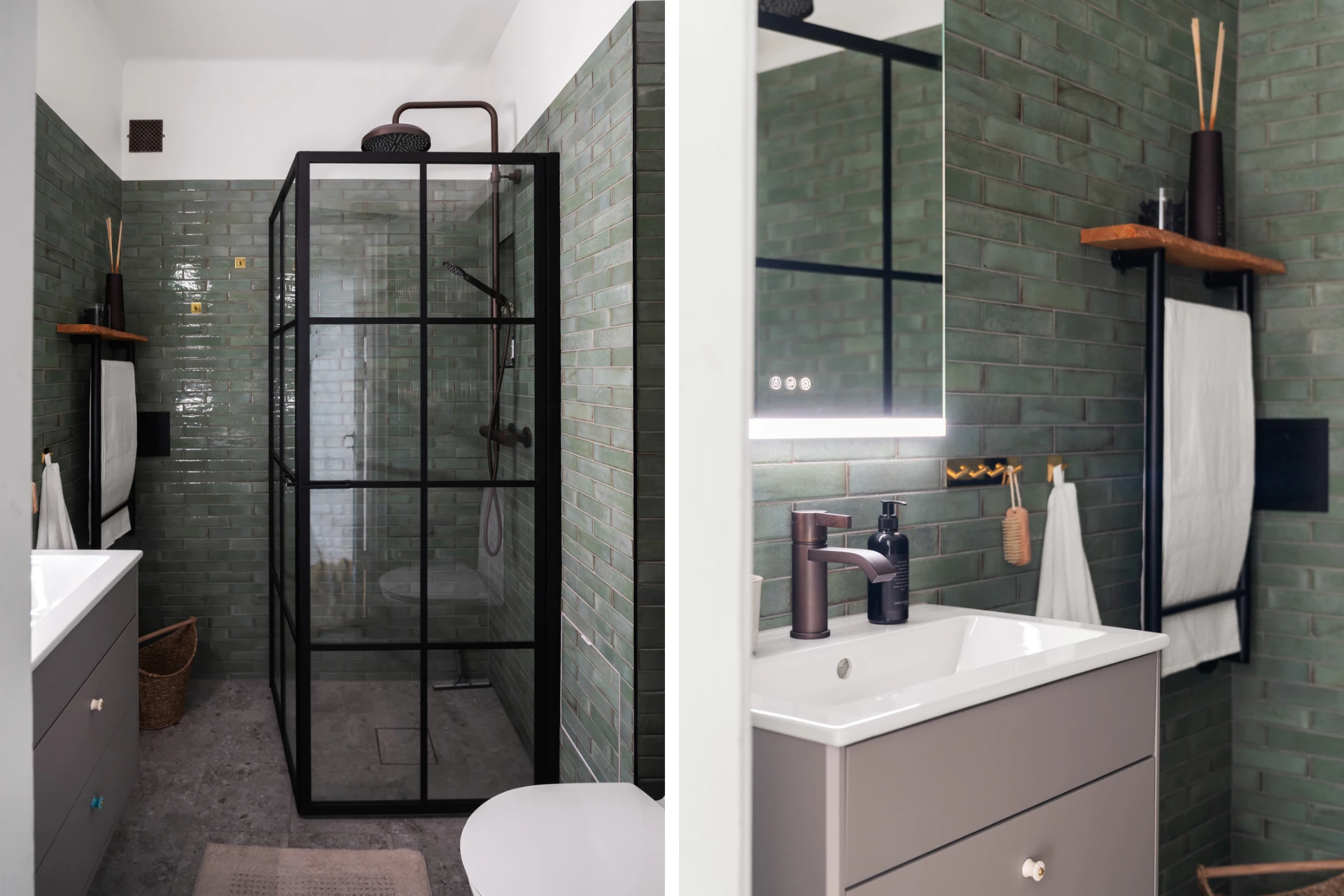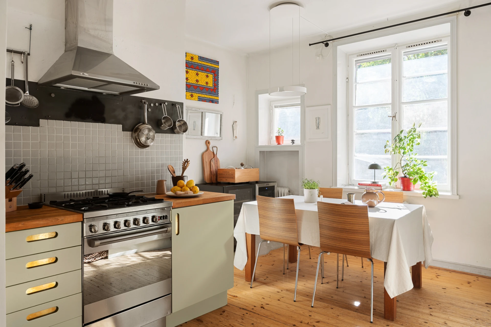 Hallen välkomnar med ett ljust och öppet intryck, där ytterkläder och skor enkelt får sin plats. Från hallen leds du vidare till det extra rummet – en flexibel yta som passar utmärkt som arbetsplats eller för den som vill skapa ett eget utrymme för hobbies. Köket är stort och genomtänkt med gott om förvaring bakom mintgröna fronter från PickyLiving. Här samsas charm och funktion – det tidstypiska serveringsskåpet blir en fin detalj, medan den moderna utrustningen gör vardagen smidig med kyl/frys, diskmaskin, fläkt, ugn och gasspis. Stänkskyddet i klassiskt kakel ramar in arbetsytorna och vid matplatsen finns utrymme för både vardagsmåltider och middagar med familj och vänner. Bostaden erbjuder också ett extra rum, perfekt som arbetsplats eller för den som vill skapa ett eget utrymme för gäster eller hobbies. Sovrummet är rofyllt med fint ljusinsläpp och gott om plats för dubbelsäng, sidobord och förvaring. Ett rum som känns både ombonat och praktiskt. Badrummet, renoverat 2024, bjuder på en stilren och modern känsla med industriell ton. Gröna kaklade väggar möter mörkt klinkergolv och smarta lösningar som dusch med infällbara glasdörrar, handdukstork och infälld hylla för förvaring. Här finns även WC, handfat med kommod och spegelskåp.