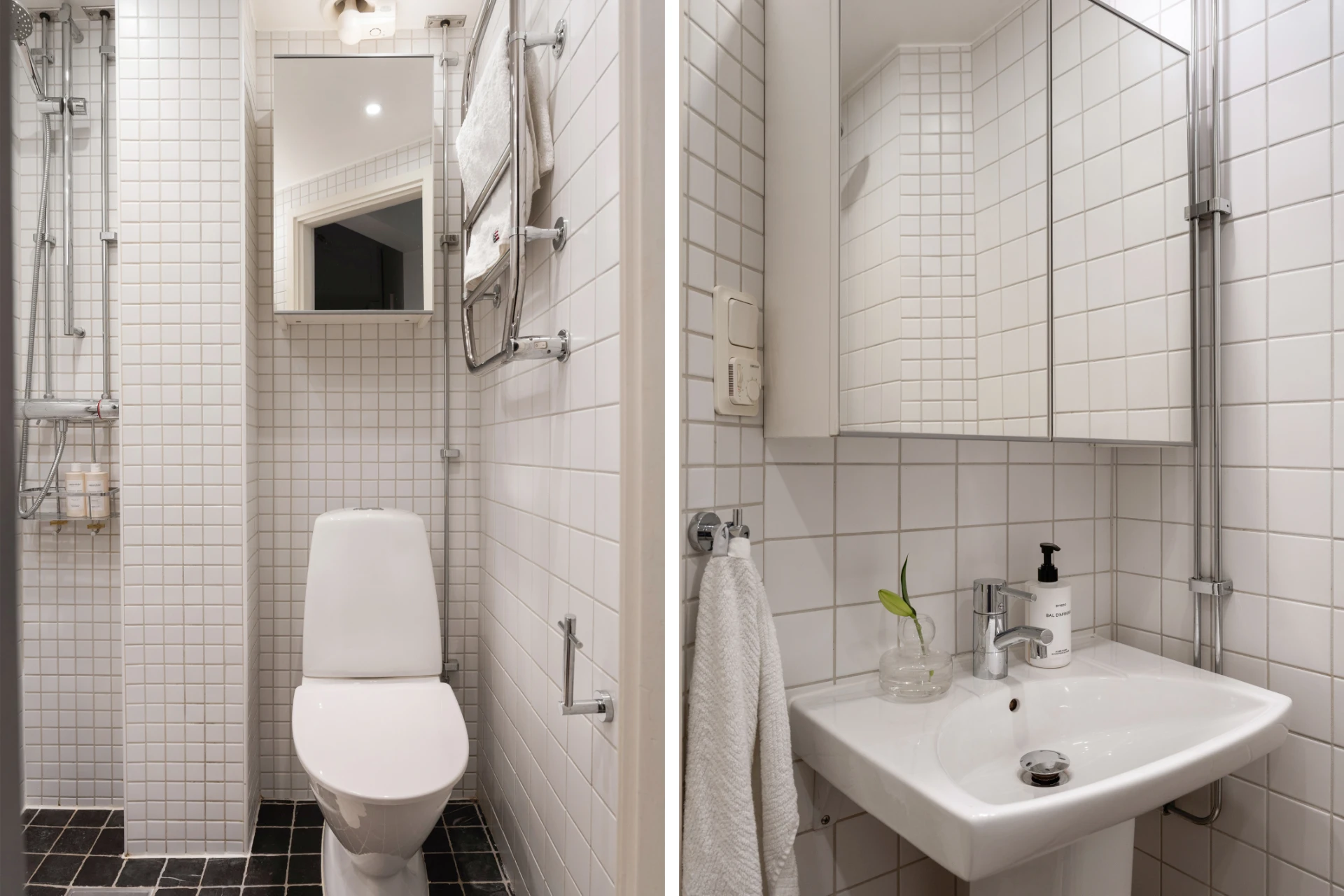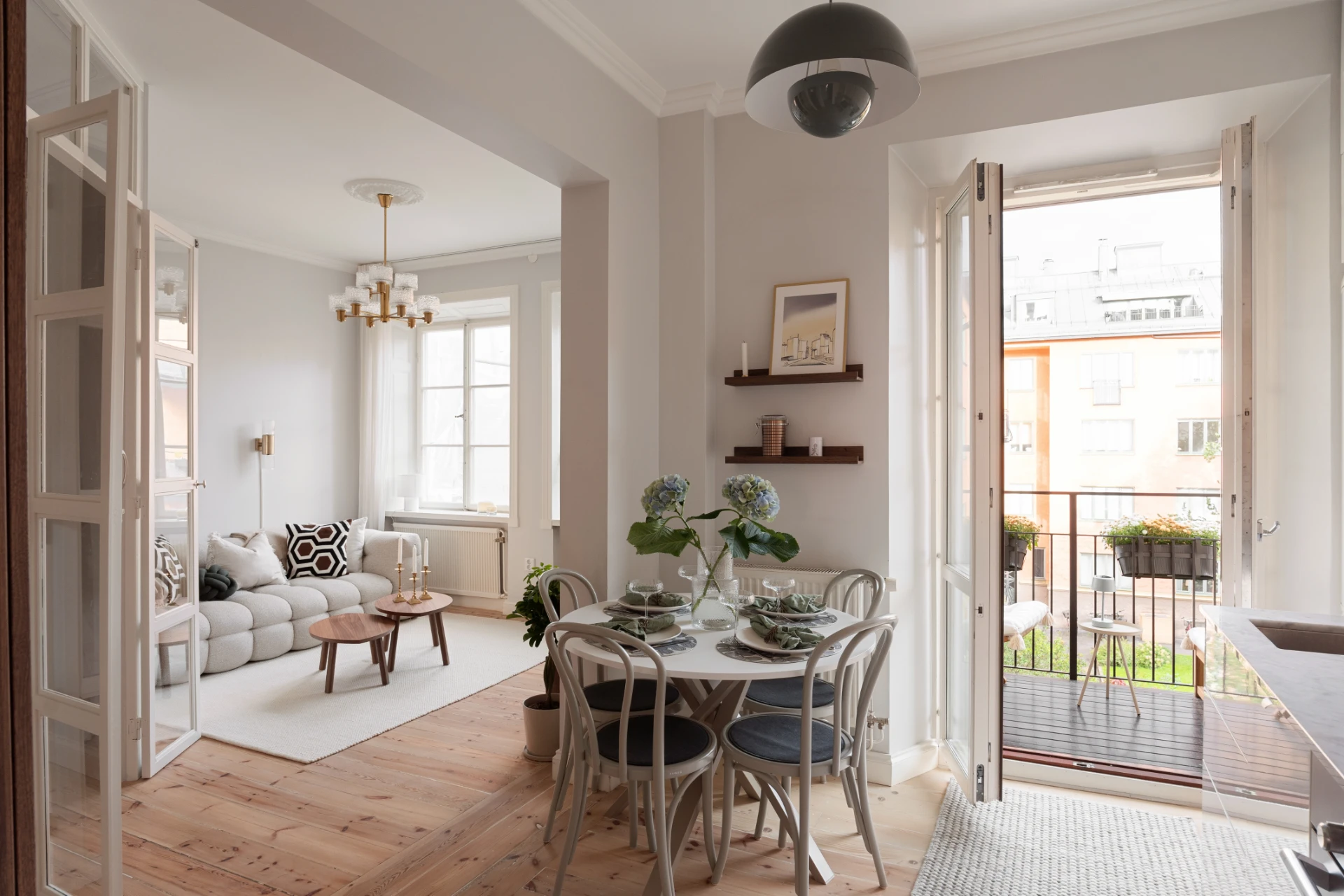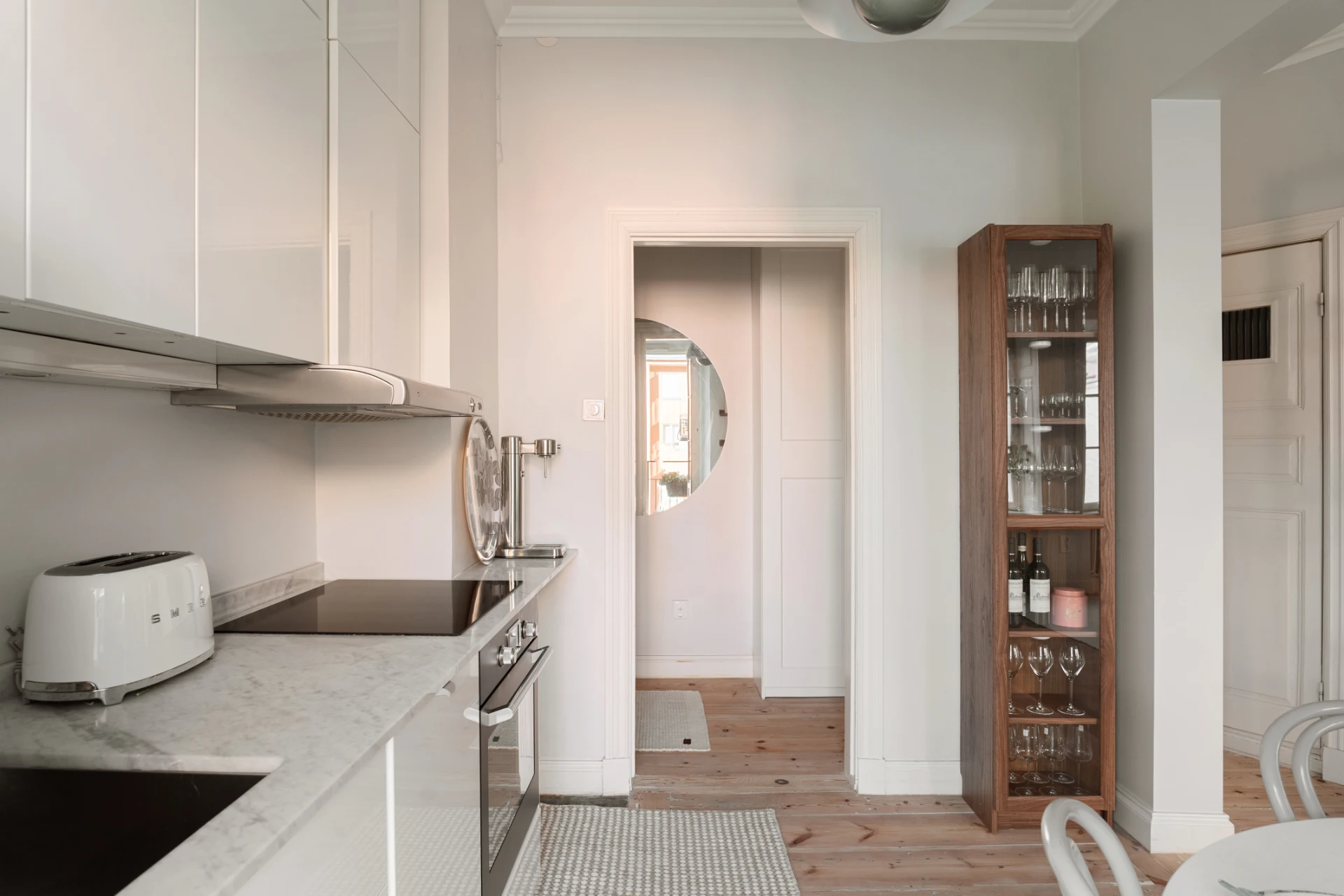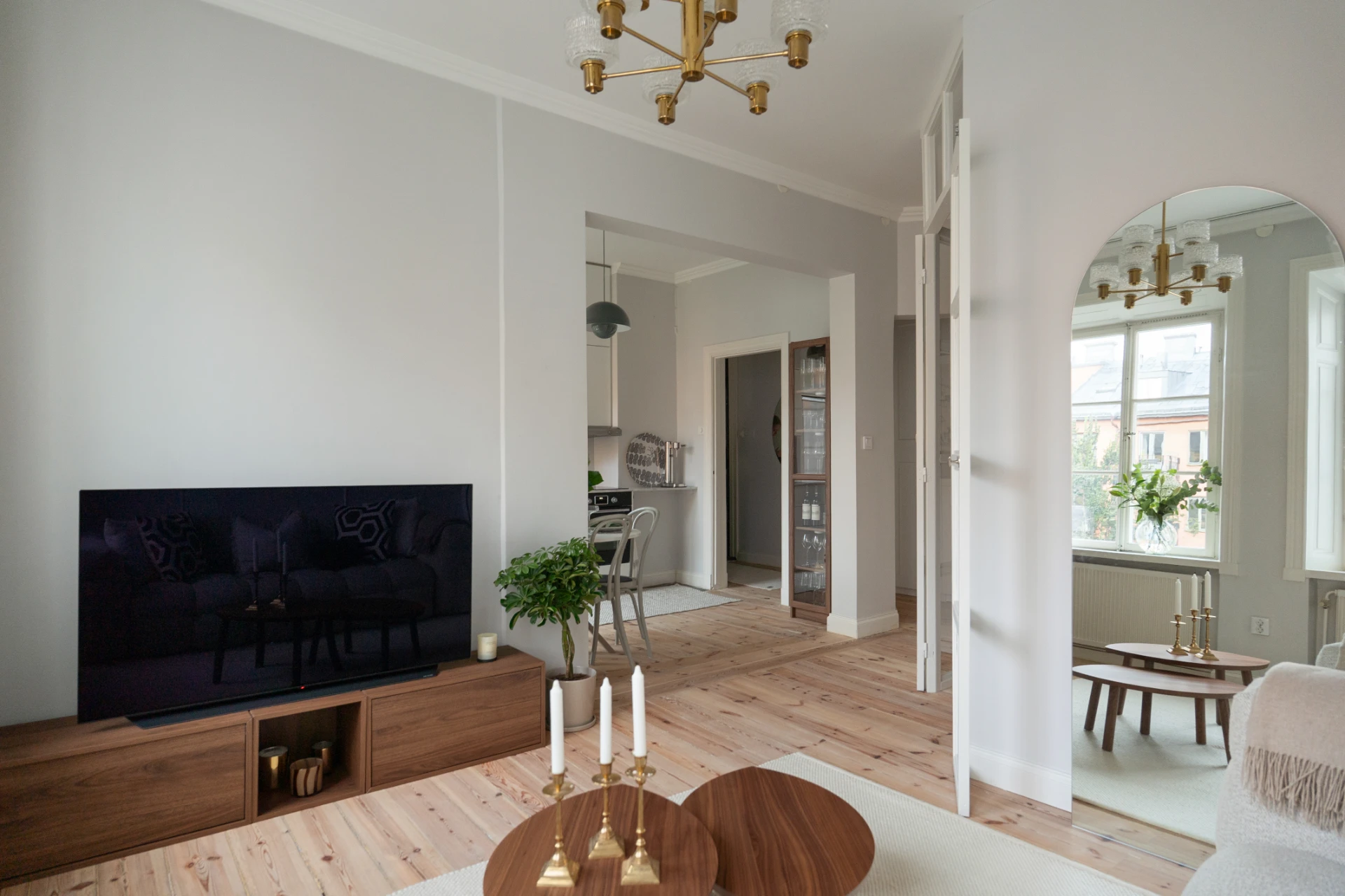 Redan i den inbjudande hallen möts ni av ljusa väggar och vackra trägolv som skapar en välkomnande känsla. Här finns gott om plats för avhängning av ytterkläder och skor, vilket gör vardagen smidig redan från första steget in. Vidare in öppnar sig bostadens hjärta – det smakfulla köket. Ljusa fronter gömmer generös förvaring och på den eleganta marmorbänkskivan erbjuds goda arbetsytor för både vardagsmatlagning och festliga middagar. Den maskinella utrustningen är komplett med spis, ugn, fläkt, integrerad diskmaskin samt kombinerad kyl och frys. Här finns även plats för en matgrupp om 4 personer eller fler, där måltiderna får en naturlig inramning av den öppna planlösningen mot vardagsrummet. Från köket nås dessutom den härliga balkongen, en rofylld plats mot den lugna innergården – perfekt för morgonkaffet eller en stillsam kväll. Vardagsrummet bjuder på en underbar rymd med generöst ljusinsläpp från två stora fönster med djupa nischer. Rummet är väl tilltaget och inbjuder till umgänge och avkoppling, med gott om plats för både soffgrupp, TV-möbel och personliga detaljer. Det vackra trägolvet löper genom hela bostaden och tillsammans med detaljer som takrosetten skapas en känsla av tidlös elegans. Intill vardagsrummet ligger den harmoniska sovrummet, smart avskärmad med glasväggar som låter ljuset flöda in. Här finns plats för säng och kompletterande förvaring – en rogivande vrå för återhämtning. Det helkaklade badrummet fulländar hemmet med sin stilrena design. Vitt kakel möter mörkt klinkergolv och här finns både WC, handfat med spegelskåp, praktisk handdukstork och dusch.