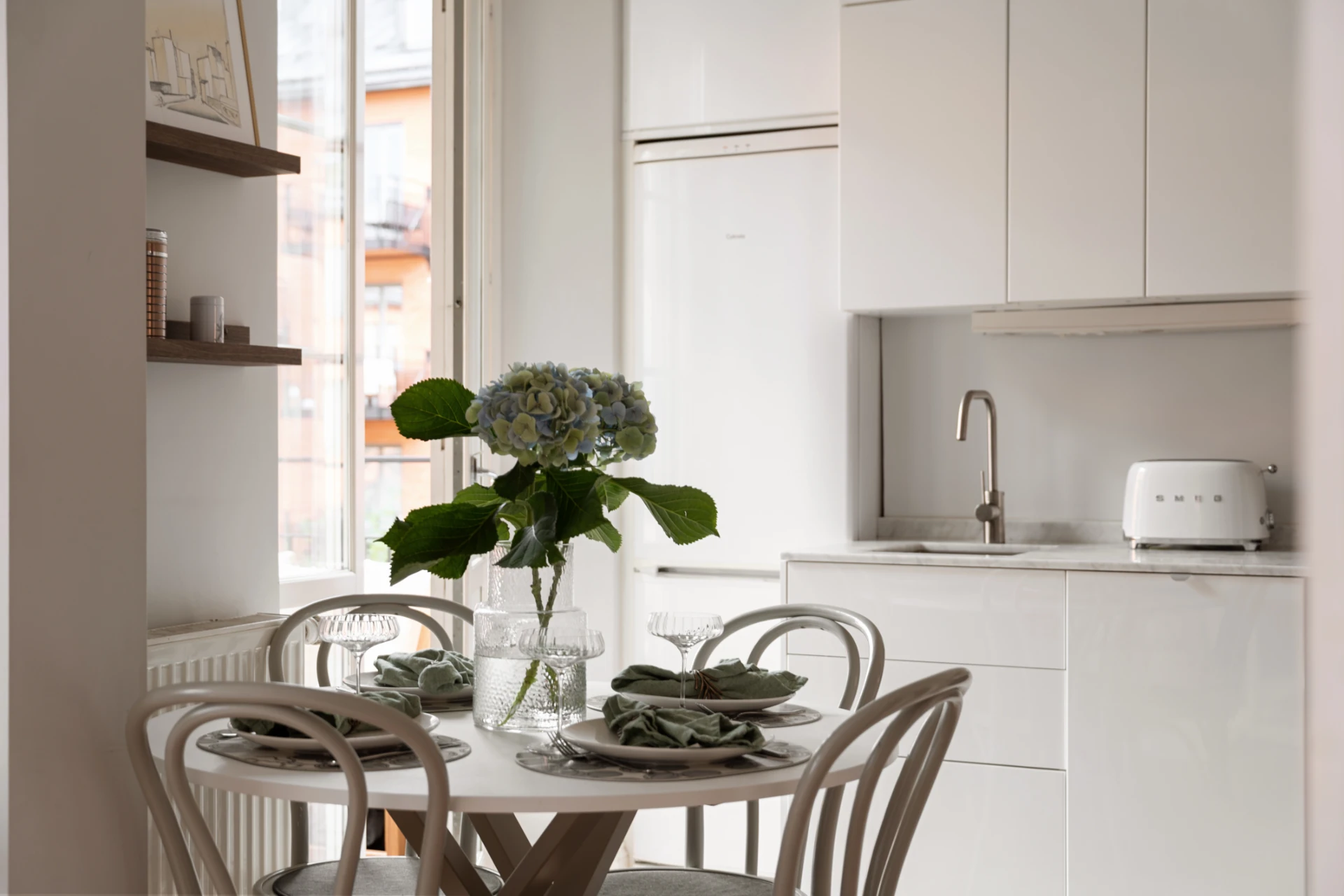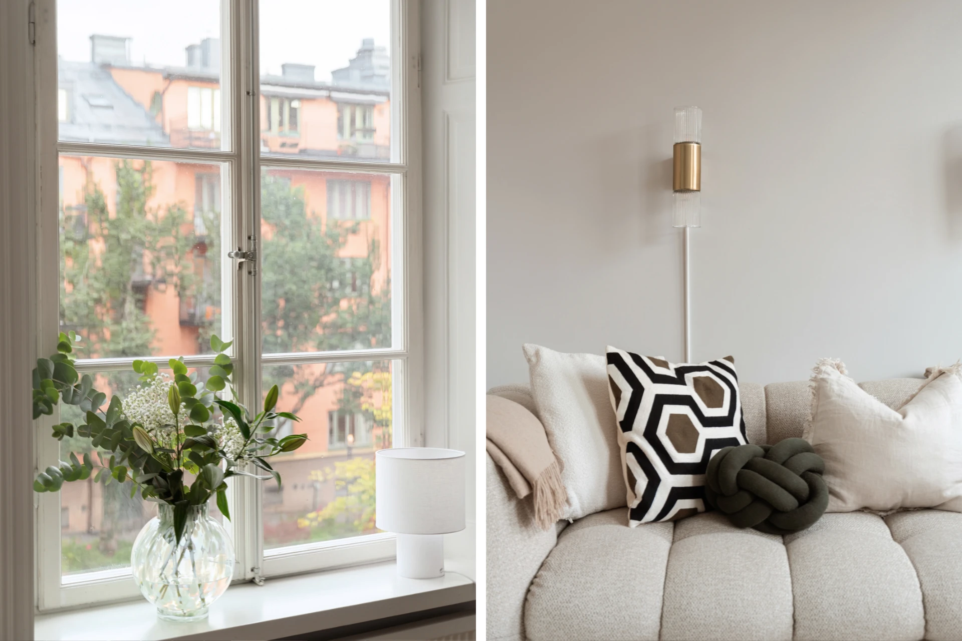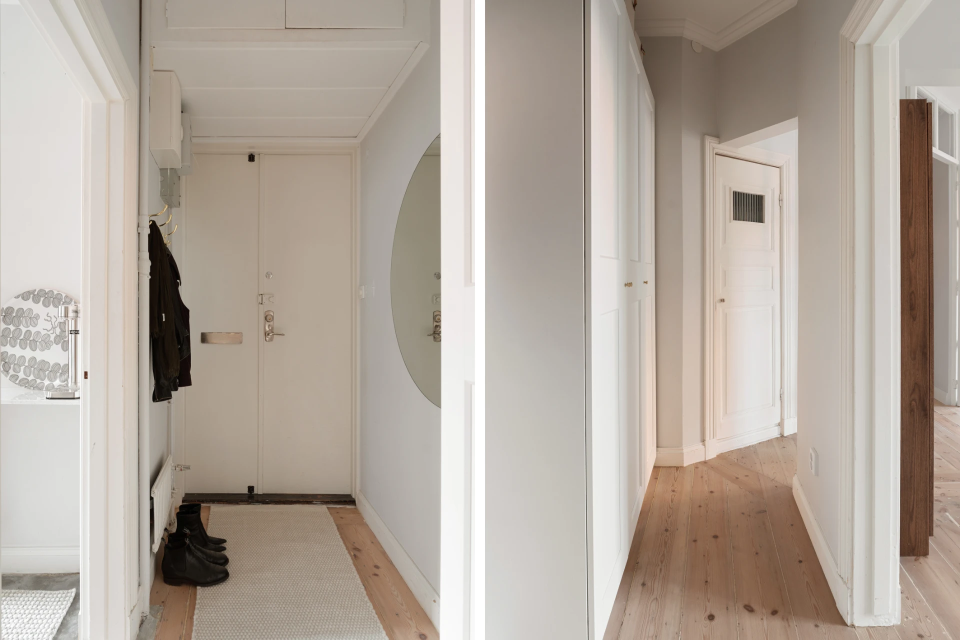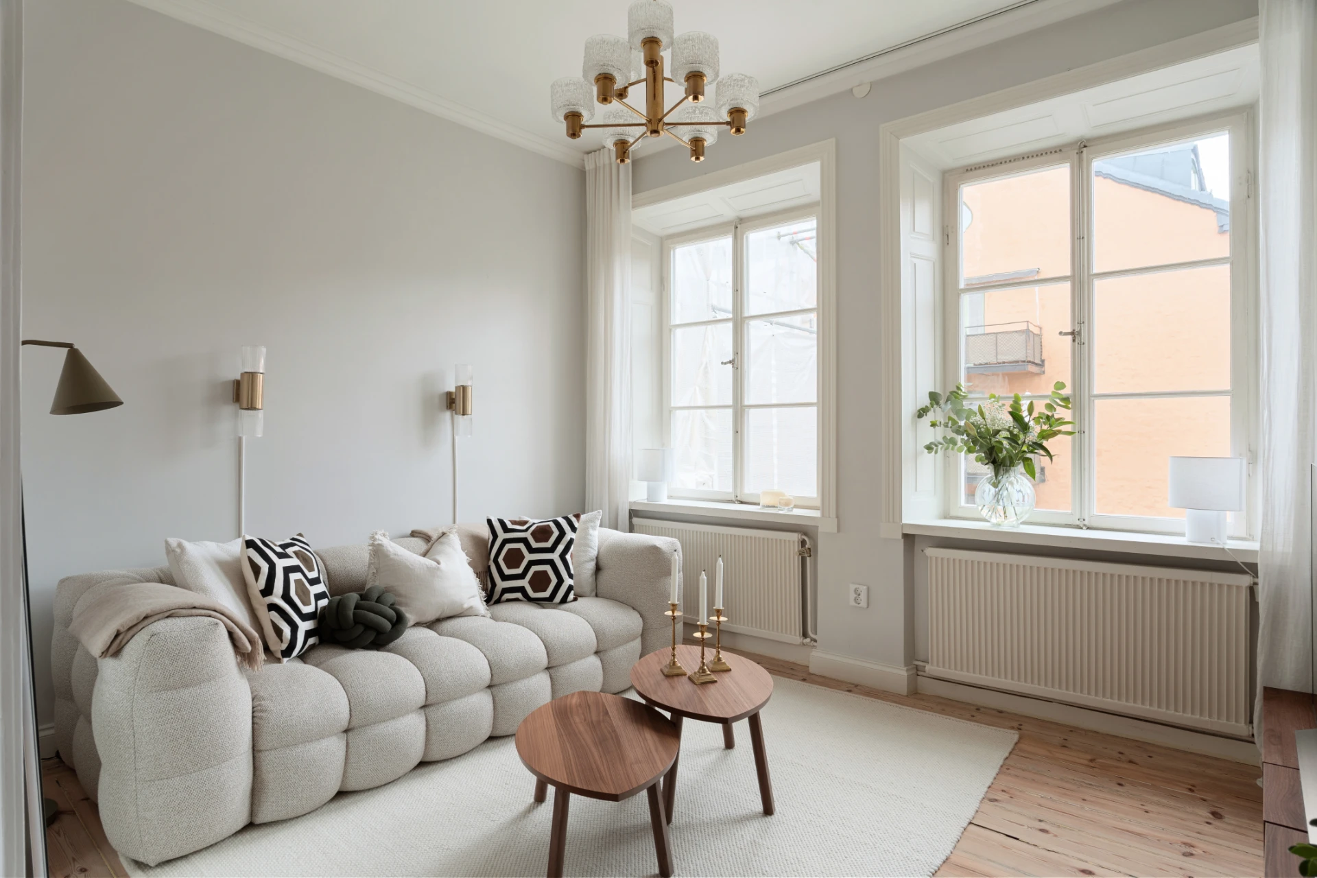 Redan i den inbjudande hallen möts ni av ljusa väggar och vackra trägolv som skapar en välkomnande känsla. Här finns gott om plats för avhängning av ytterkläder och skor, vilket gör vardagen smidig redan från första steget in. Vidare in öppnar sig bostadens hjärta – det smakfulla köket. Ljusa fronter gömmer generös förvaring och på den eleganta marmorbänkskivan erbjuds goda arbetsytor för både vardagsmatlagning och festliga middagar. Den maskinella utrustningen är komplett med spis, ugn, fläkt, integrerad diskmaskin samt kombinerad kyl och frys. Här finns även plats för en matgrupp om 4 personer eller fler, där måltiderna får en naturlig inramning av den öppna planlösningen mot vardagsrummet. Från köket nås dessutom den härliga balkongen, en rofylld plats mot den lugna innergården – perfekt för morgonkaffet eller en stillsam kväll. Vardagsrummet bjuder på en underbar rymd med generöst ljusinsläpp från två stora fönster med djupa nischer. Rummet är väl tilltaget och inbjuder till umgänge och avkoppling, med gott om plats för både soffgrupp, TV-möbel och personliga detaljer. Det vackra trägolvet löper genom hela bostaden och tillsammans med detaljer som takrosetten skapas en känsla av tidlös elegans. Intill vardagsrummet ligger den harmoniska sovrummet, smart avskärmad med glasväggar som låter ljuset flöda in. Här finns plats för säng och kompletterande förvaring – en rogivande vrå för återhämtning. Det helkaklade badrummet fulländar hemmet med sin stilrena design. Vitt kakel möter mörkt klinkergolv och här finns både WC, handfat med spegelskåp, praktisk handdukstork och dusch.