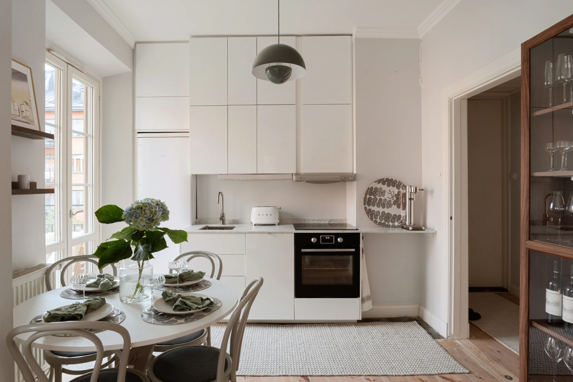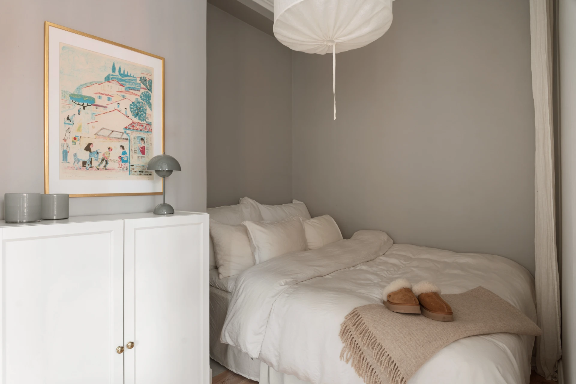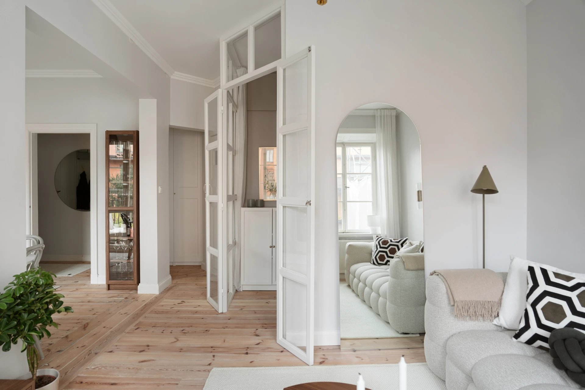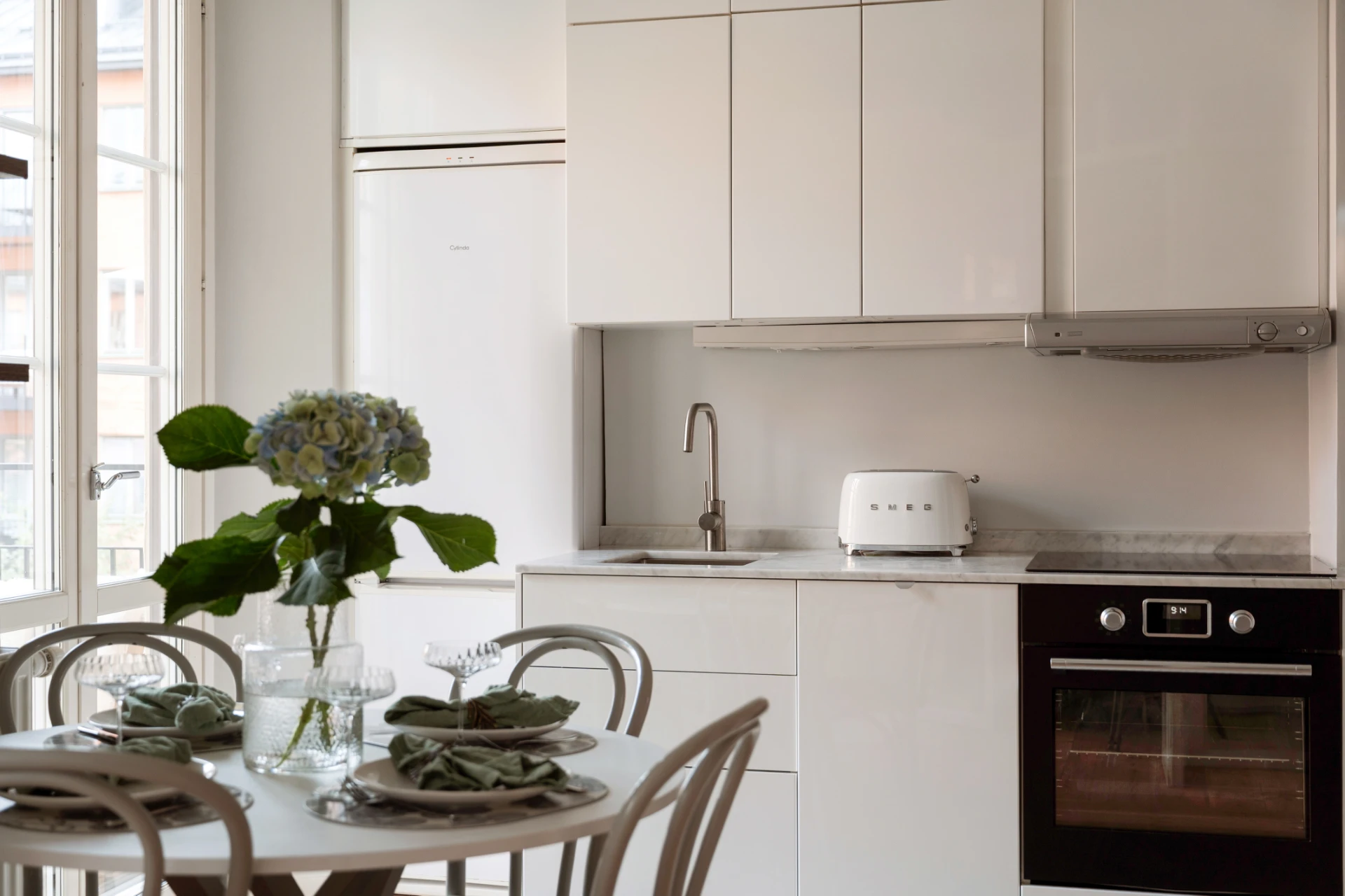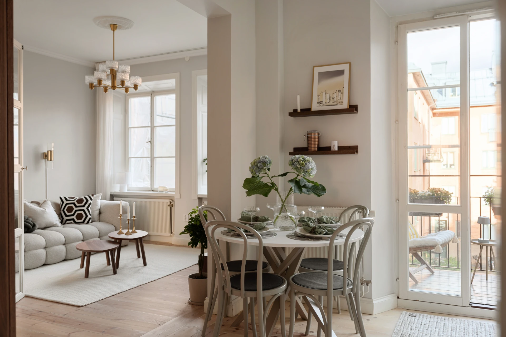 Redan i den inbjudande hallen möts ni av ljusa väggar och vackra trägolv som skapar en välkomnande känsla. Här finns gott om plats för avhängning av ytterkläder och skor, vilket gör vardagen smidig redan från första steget in. Vidare in öppnar sig bostadens hjärta – det smakfulla köket. Ljusa fronter gömmer generös förvaring och på den eleganta marmorbänkskivan erbjuds goda arbetsytor för både vardagsmatlagning och festliga middagar. Den maskinella utrustningen är komplett med spis, ugn, fläkt, integrerad diskmaskin samt kombinerad kyl och frys. Här finns även plats för en matgrupp om 4 personer eller fler, där måltiderna får en naturlig inramning av den öppna planlösningen mot vardagsrummet. Från köket nås dessutom den härliga balkongen, en rofylld plats mot den lugna innergården – perfekt för morgonkaffet eller en stillsam kväll. Vardagsrummet bjuder på en underbar rymd med generöst ljusinsläpp från två stora fönster med djupa nischer. Rummet är väl tilltaget och inbjuder till umgänge och avkoppling, med gott om plats för både soffgrupp, TV-möbel och personliga detaljer. Det vackra trägolvet löper genom hela bostaden och tillsammans med detaljer som takrosetten skapas en känsla av tidlös elegans. Intill vardagsrummet ligger den harmoniska sovrummet, smart avskärmad med glasväggar som låter ljuset flöda in. Här finns plats för säng och kompletterande förvaring – en rogivande vrå för återhämtning. Det helkaklade badrummet fulländar hemmet med sin stilrena design. Vitt kakel möter mörkt klinkergolv och här finns både WC, handfat med spegelskåp, praktisk handdukstork och dusch.