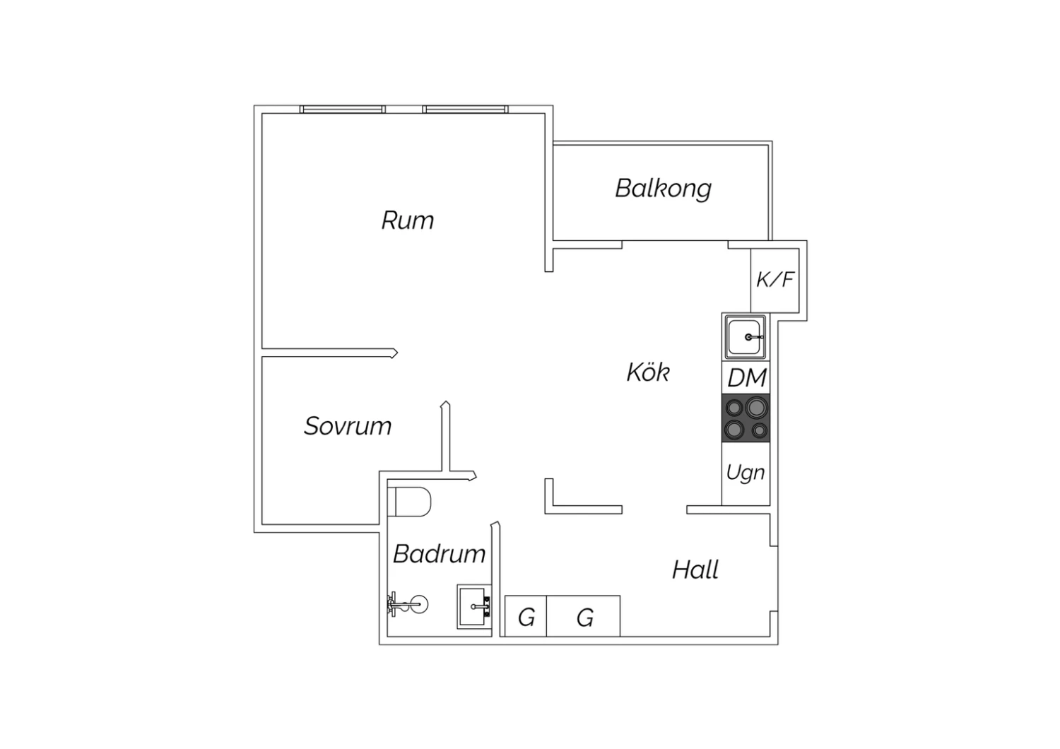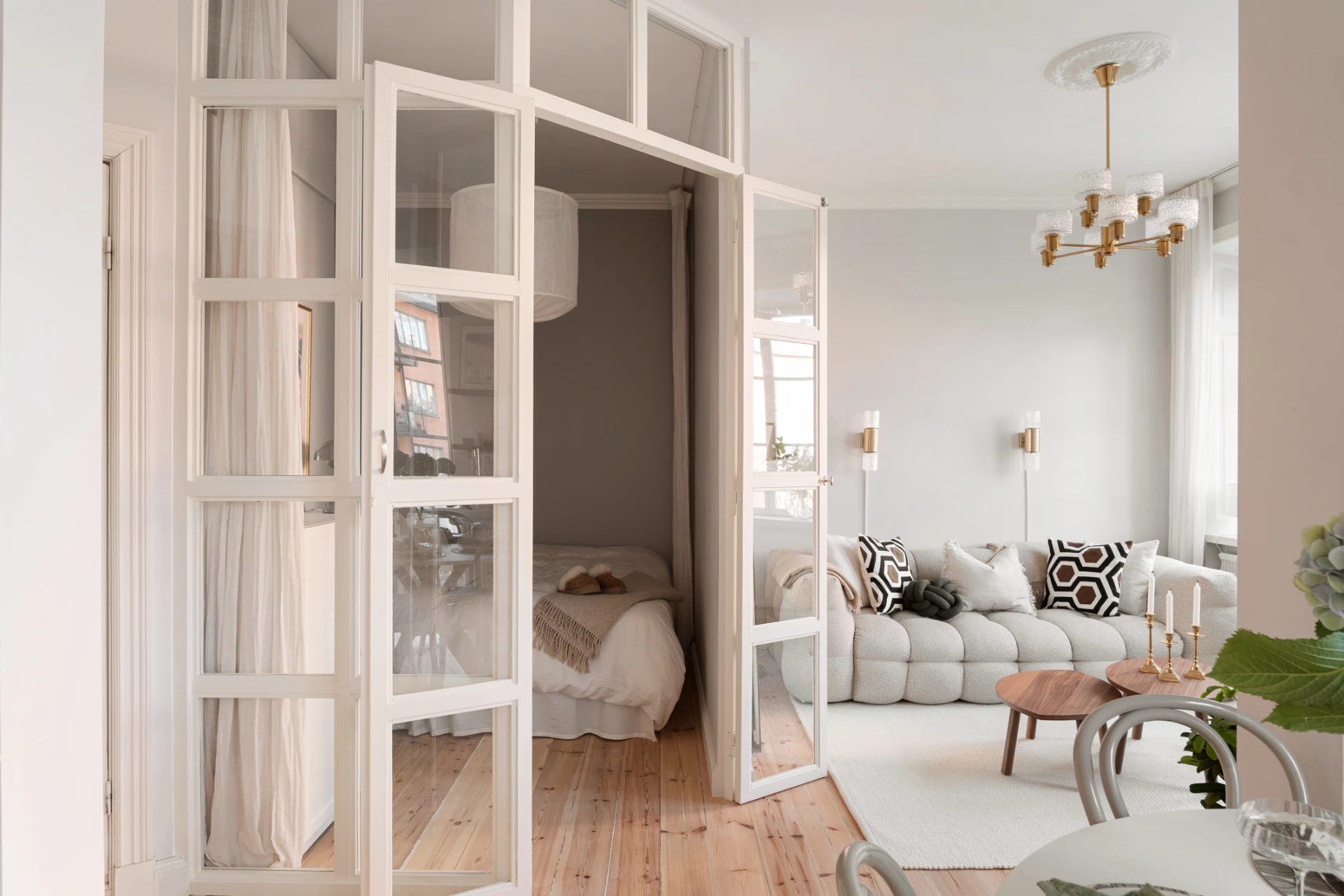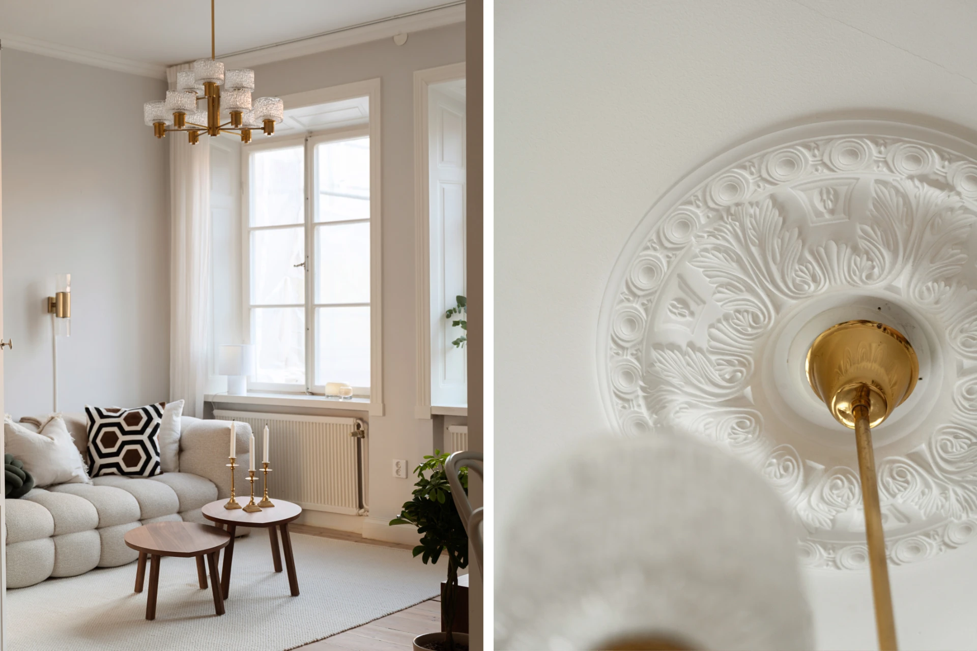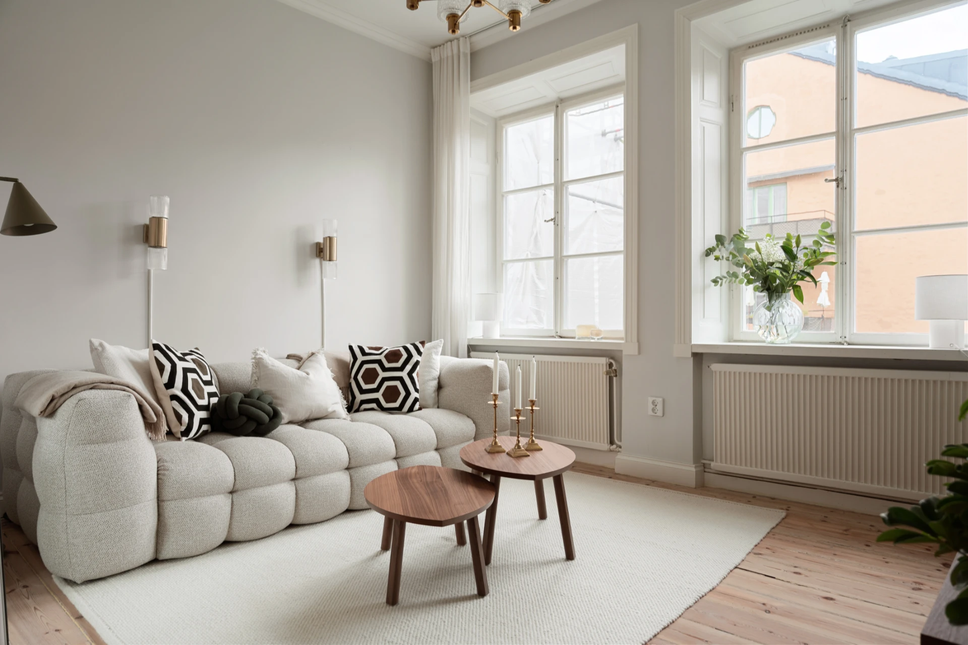 Redan i den inbjudande hallen möts ni av ljusa väggar och vackra trägolv som skapar en välkomnande känsla. Här finns gott om plats för avhängning av ytterkläder och skor, vilket gör vardagen smidig redan från första steget in. Vidare in öppnar sig bostadens hjärta – det smakfulla köket. Ljusa fronter gömmer generös förvaring och på den eleganta marmorbänkskivan erbjuds goda arbetsytor för både vardagsmatlagning och festliga middagar. Den maskinella utrustningen är komplett med spis, ugn, fläkt, integrerad diskmaskin samt kombinerad kyl och frys. Här finns även plats för en matgrupp om 4 personer eller fler, där måltiderna får en naturlig inramning av den öppna planlösningen mot vardagsrummet. Från köket nås dessutom den härliga balkongen, en rofylld plats mot den lugna innergården – perfekt för morgonkaffet eller en stillsam kväll. Vardagsrummet bjuder på en underbar rymd med generöst ljusinsläpp från två stora fönster med djupa nischer. Rummet är väl tilltaget och inbjuder till umgänge och avkoppling, med gott om plats för både soffgrupp, TV-möbel och personliga detaljer. Det vackra trägolvet löper genom hela bostaden och tillsammans med detaljer som takrosetten skapas en känsla av tidlös elegans. Intill vardagsrummet ligger den harmoniska sovrummet, smart avskärmad med glasväggar som låter ljuset flöda in. Här finns plats för säng och kompletterande förvaring – en rogivande vrå för återhämtning. Det helkaklade badrummet fulländar hemmet med sin stilrena design. Vitt kakel möter mörkt klinkergolv och här finns både WC, handfat med spegelskåp, praktisk handdukstork och dusch.