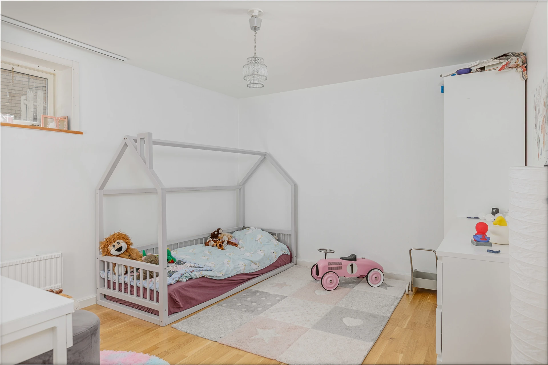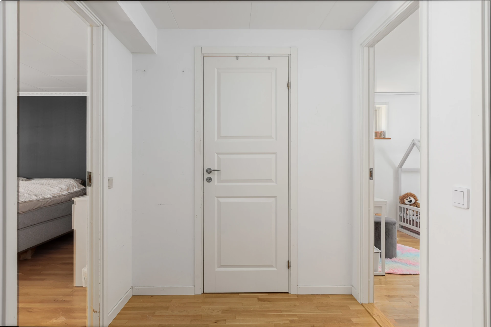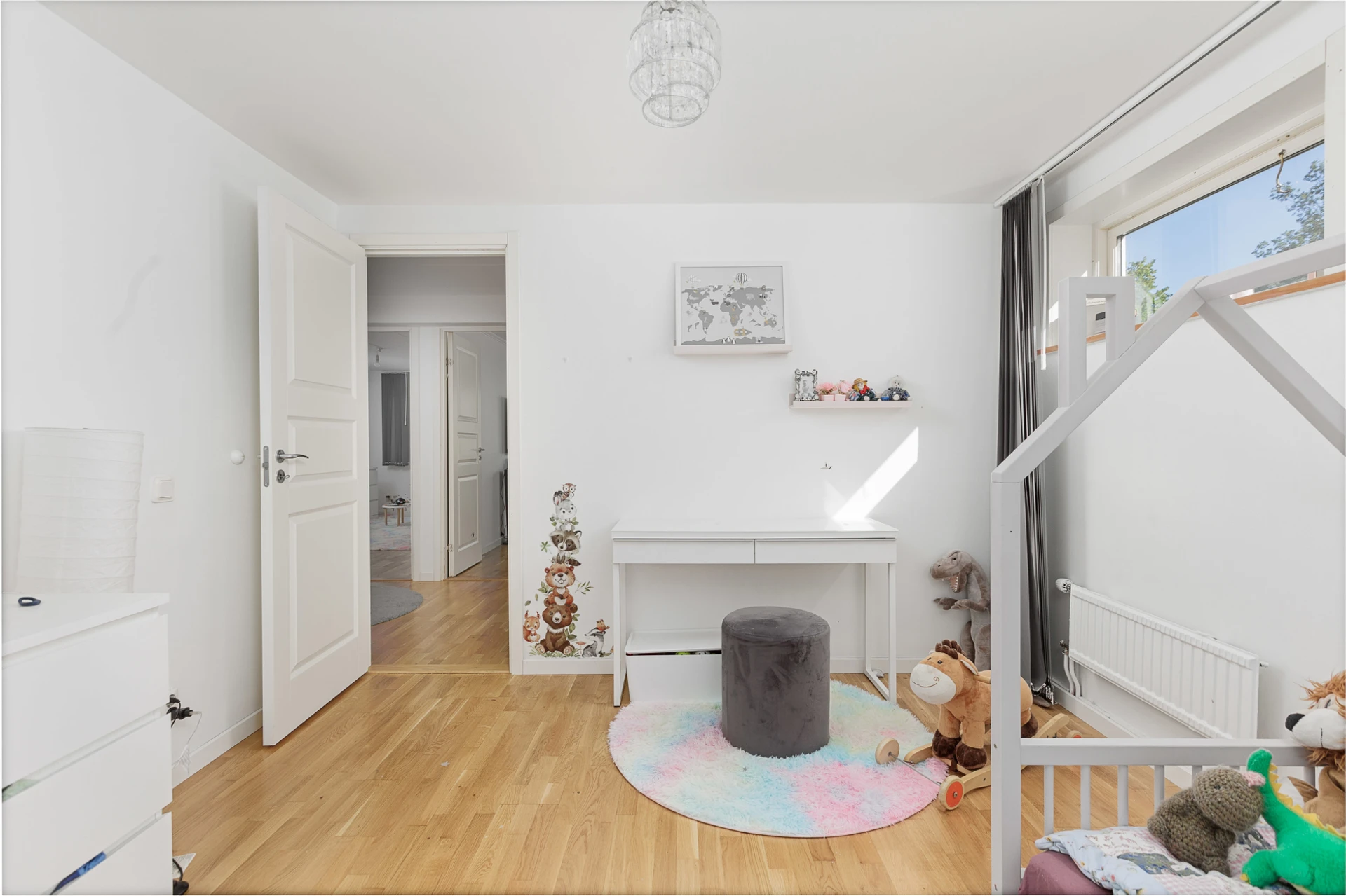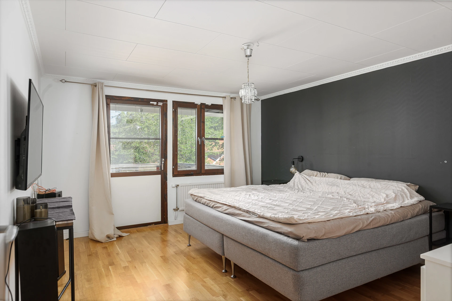 På nedre plan finns tre rymliga sovrum med trägolv – perfekt för barnfamiljen eller för dig som vill ha extra gästrum och hemmakontor.