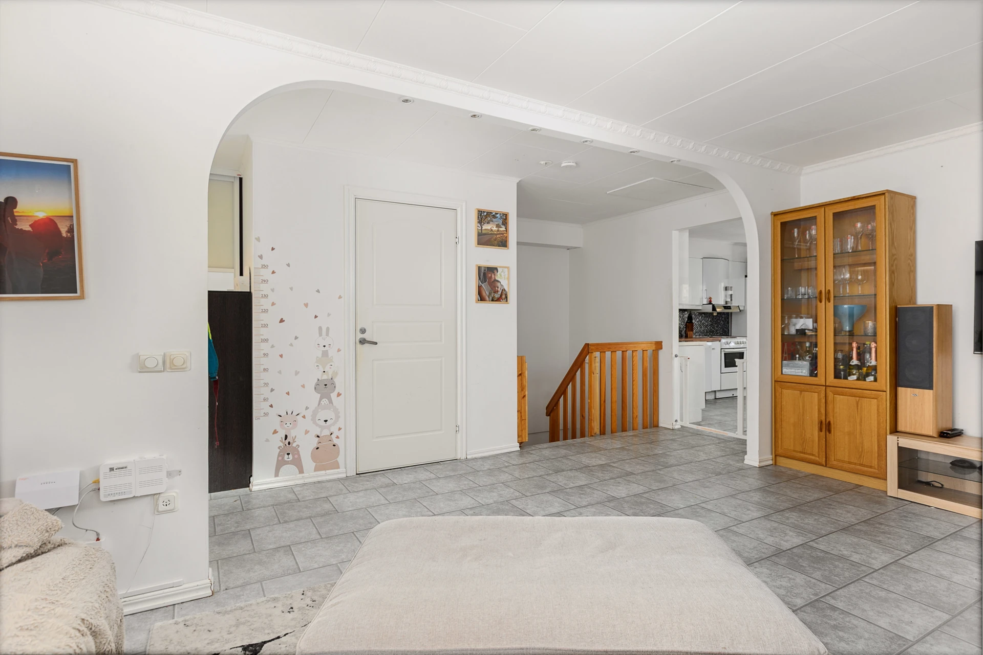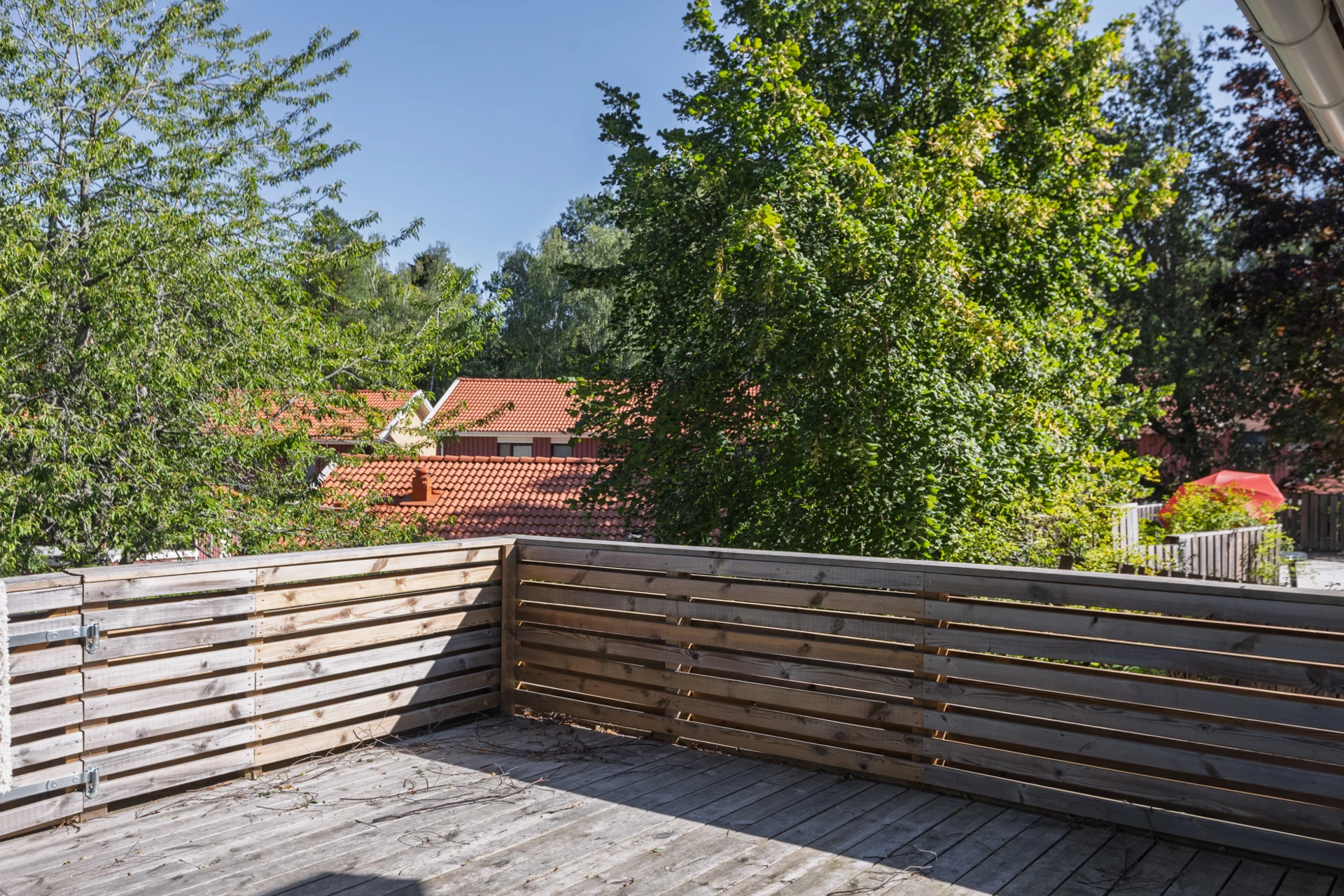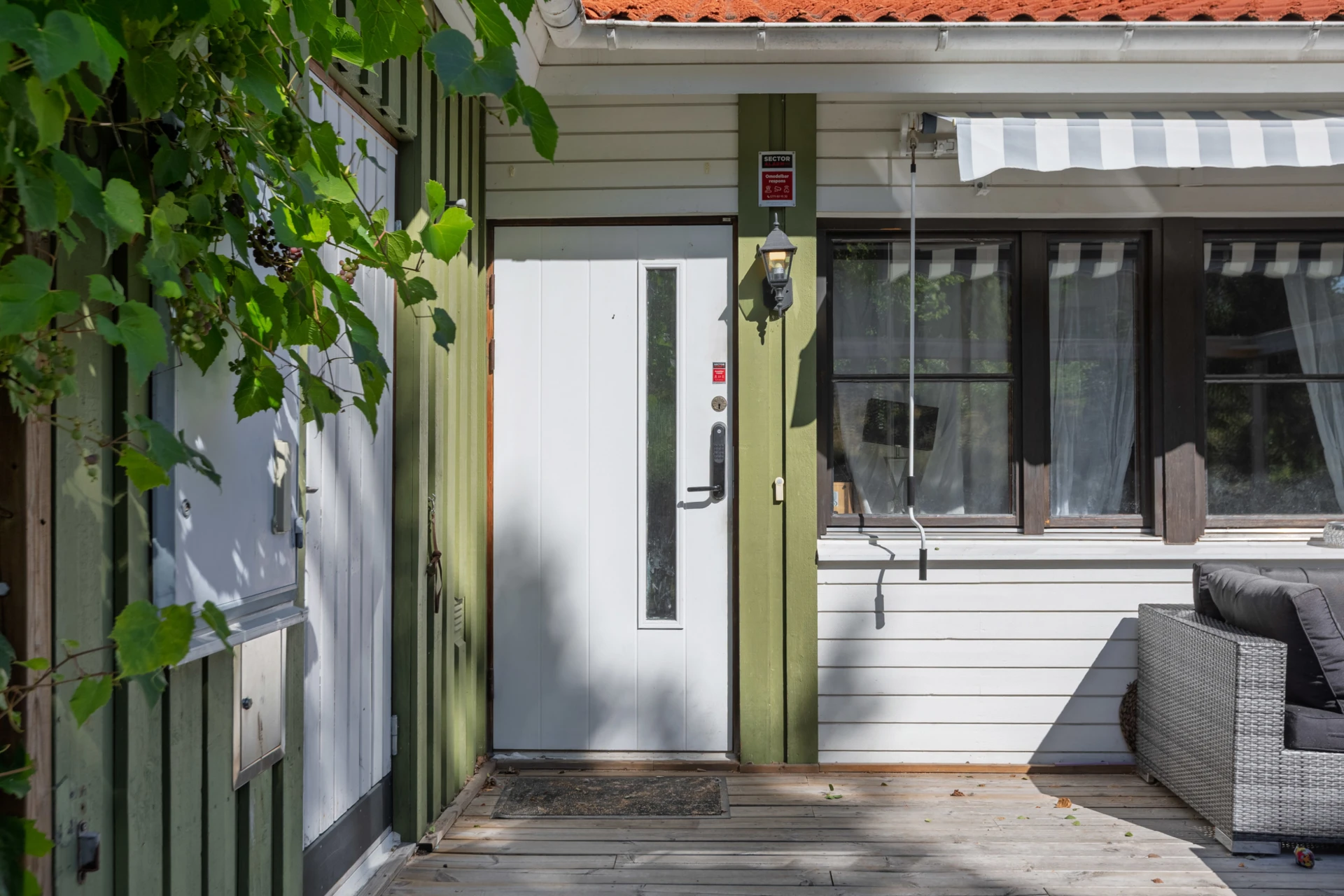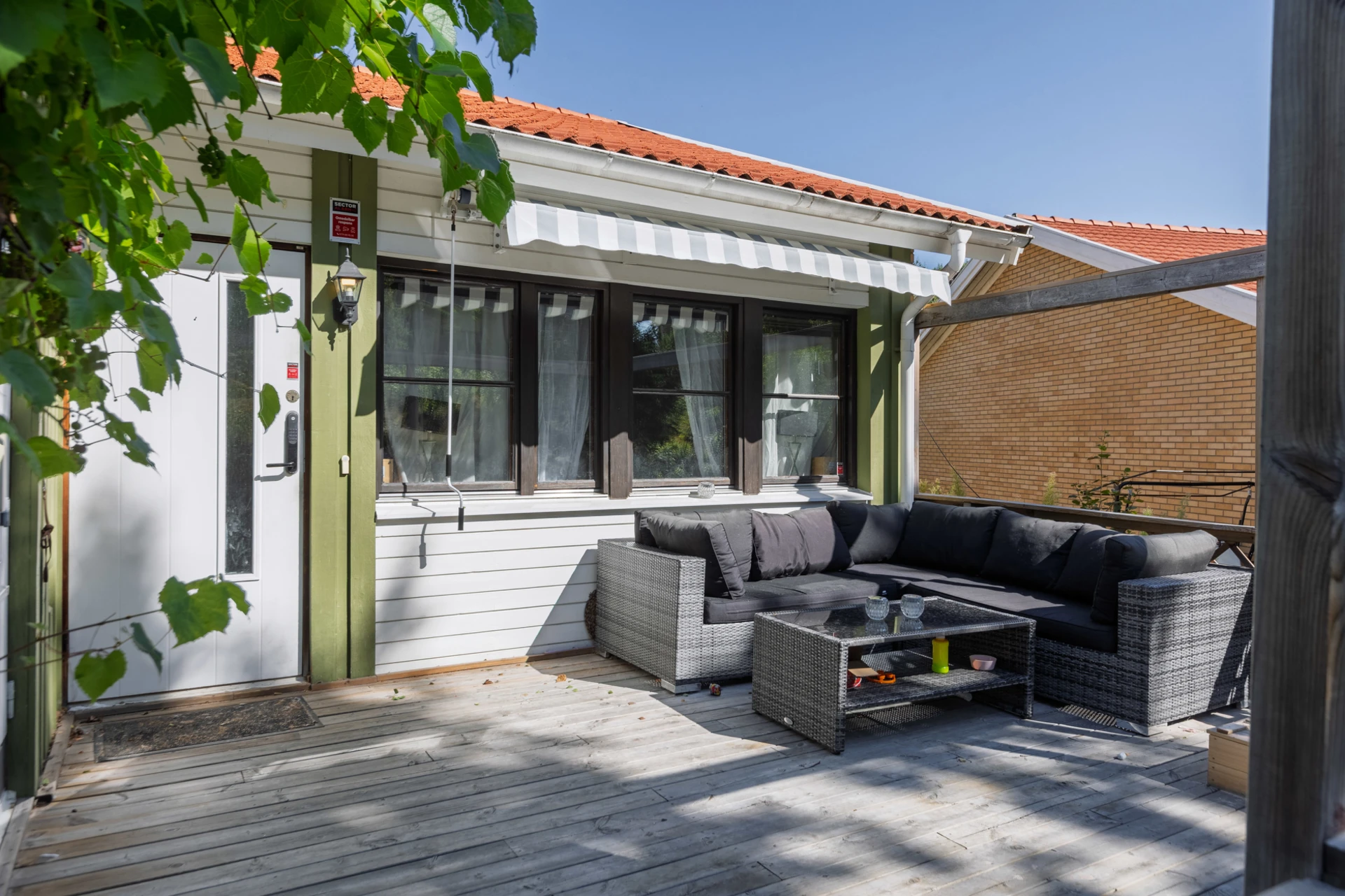 Bostaden erbjuder två trivsamma uteplatser på fram- och baksidan – här kan du njuta av morgonsol på ena sidan och eftermiddagssol på den andra. Invändigt möts du av ett rymligt vardagsrum med utgång till uteplats, ett generöst kök med anslutande matplats, samt två våtutrymmen: en gäst-WC på entréplan och ett större badrum på nedre plan med både badkar och tvättdel. Båda rummen är smakfullt inredda med klinker och mosaik. Därtill finns flera förvaringsmöjligheter som förenklar vardagen.