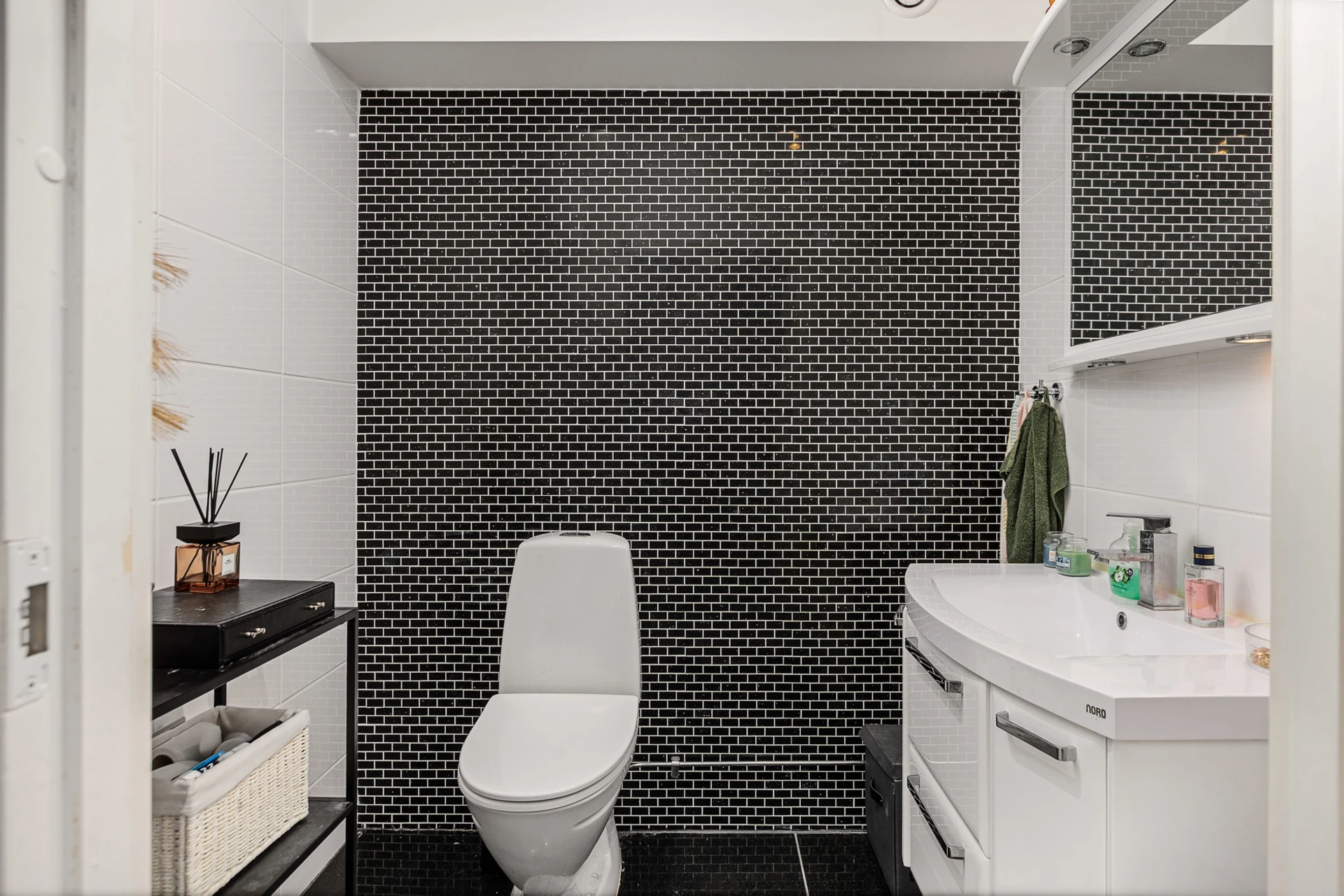 Smakfullt badrum med helkaklade väggar, stilfull svart mosaik och moderna badrumsmöbler som ger både funktion och elegans.