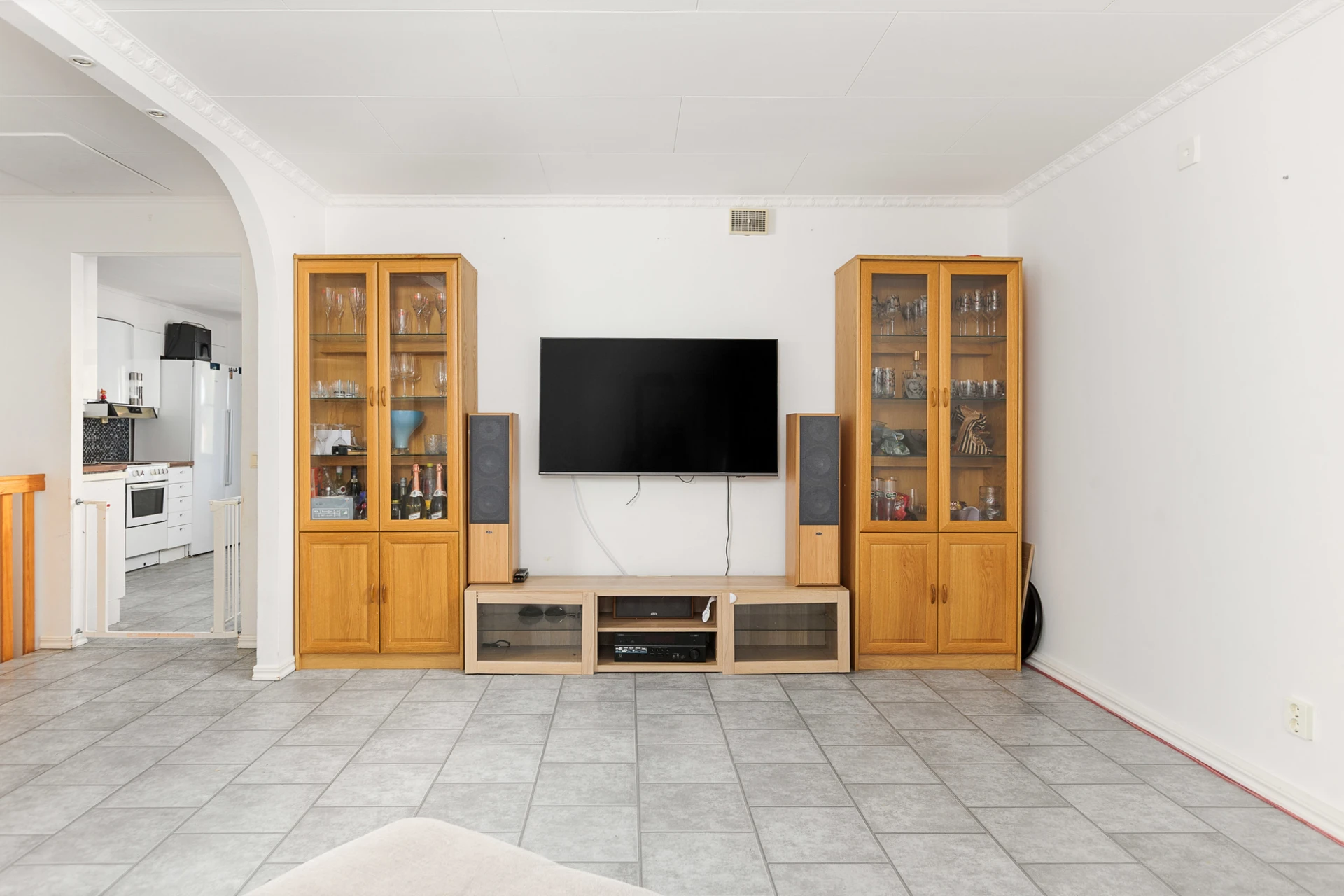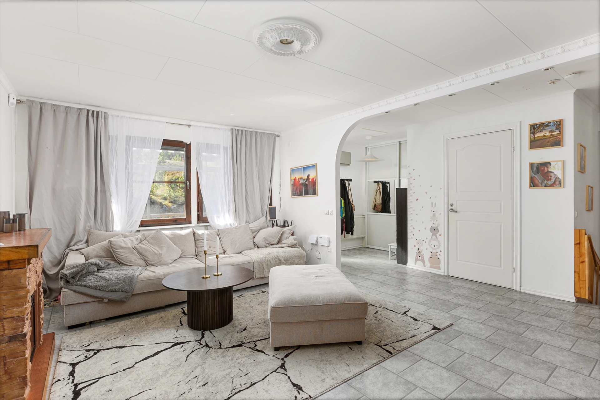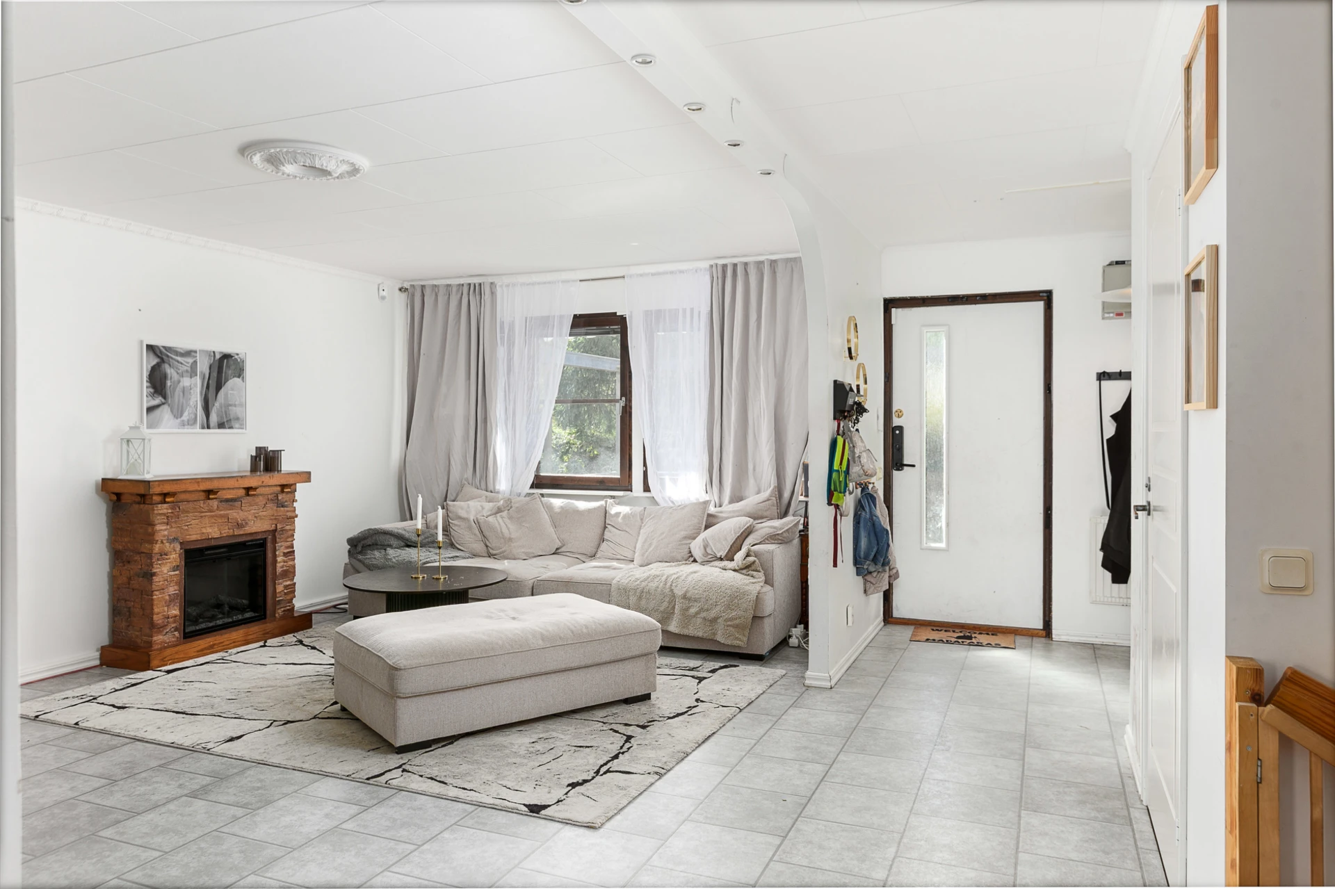 Vardagsrummet är ljust och rymligt med fint ljusinsläpp från stora fönster. Den öppna planlösningen och den charmiga öppna spisen skapar en inbjudande atmosfär med gott om plats för både umgänge och avkoppling.