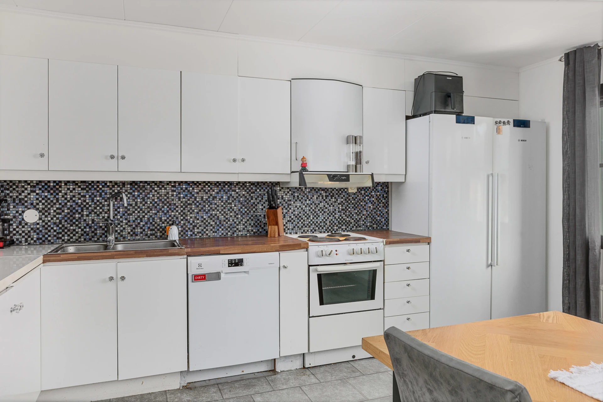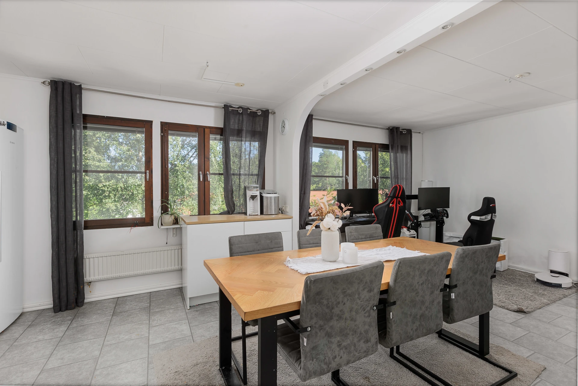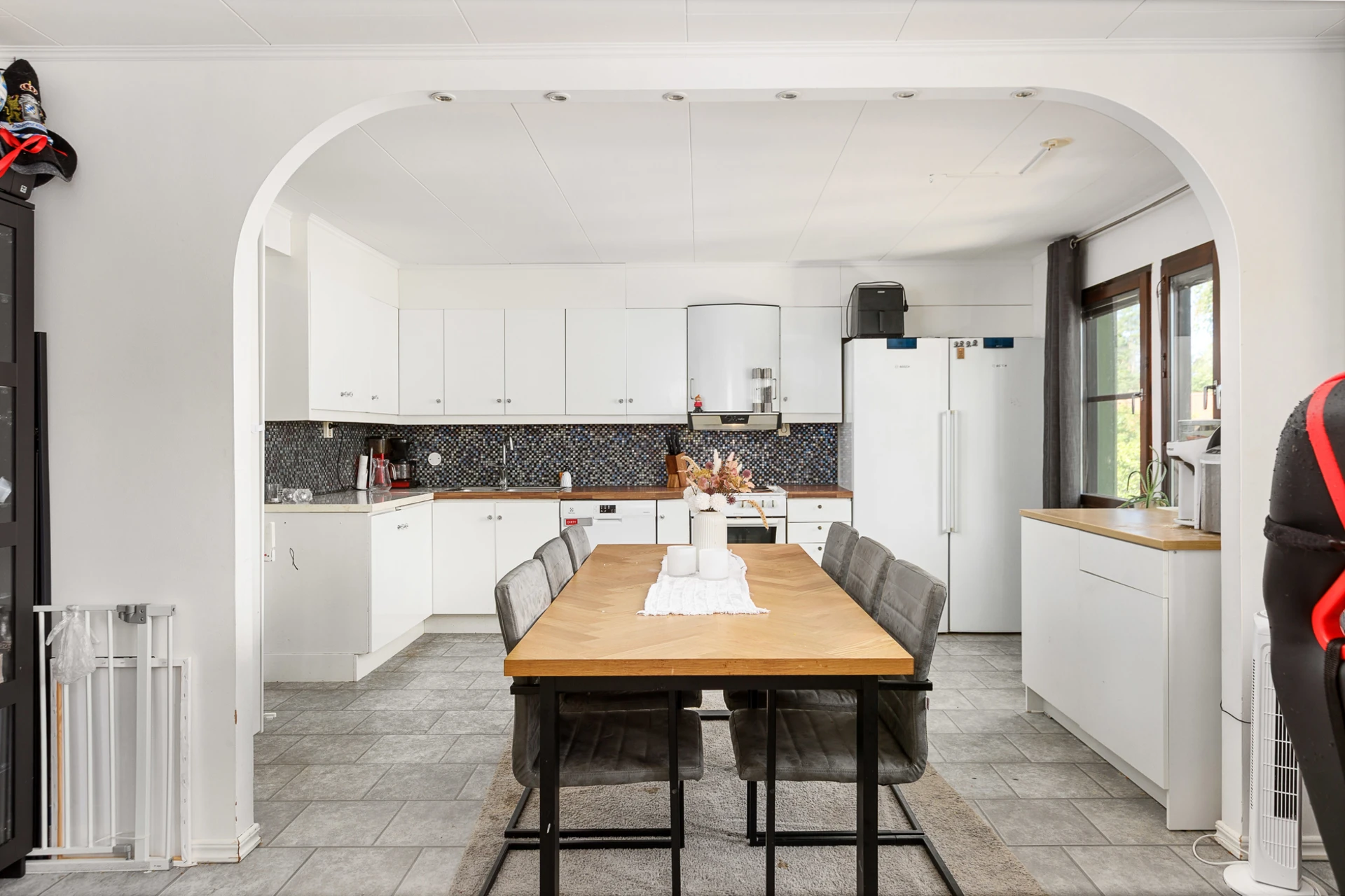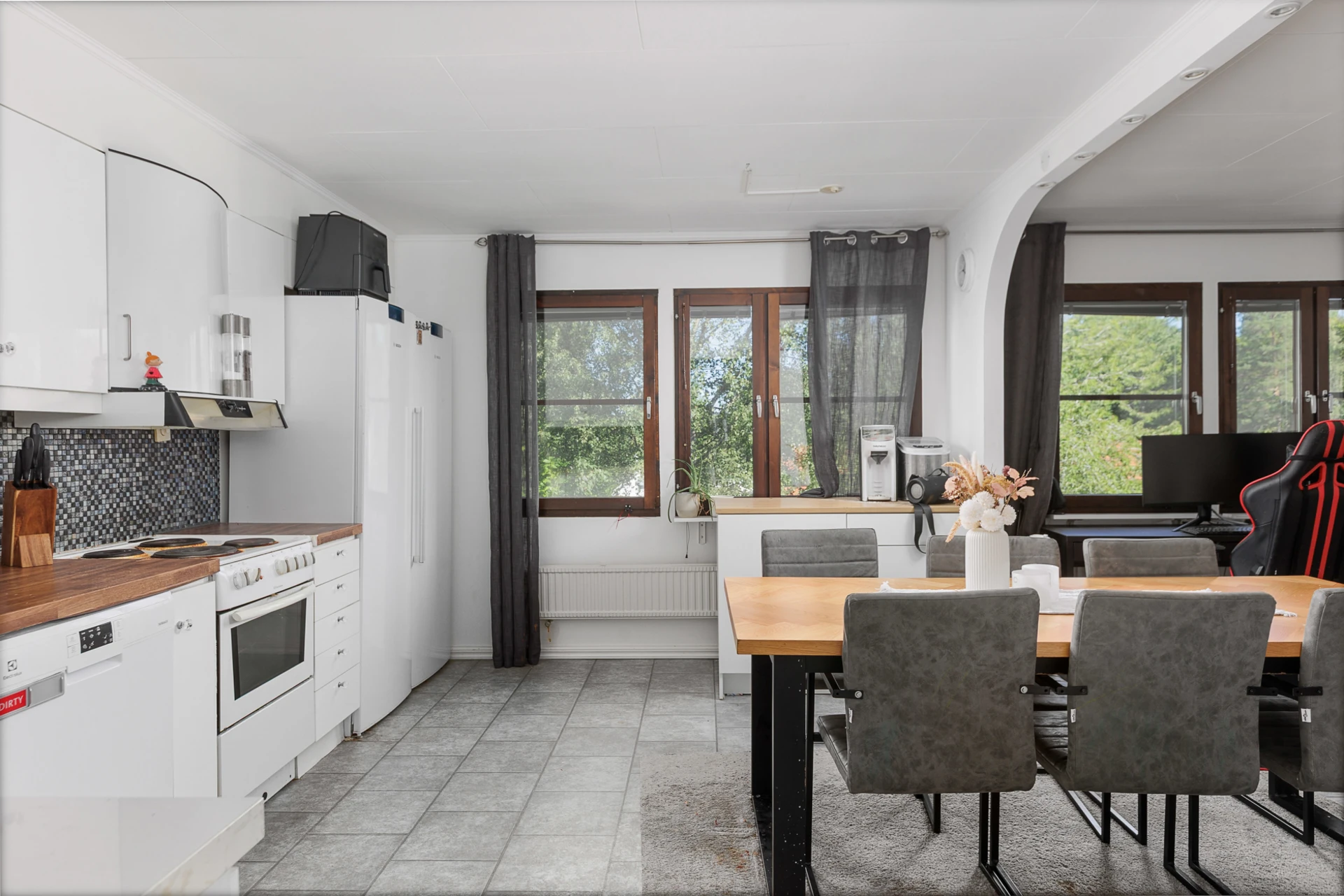 Ljust och öppet kök med gott om förvaring och arbetsytor. I anslutning finns plats för matsal eller ett extra vardagsrum – perfekt för både vardag och umgänge.