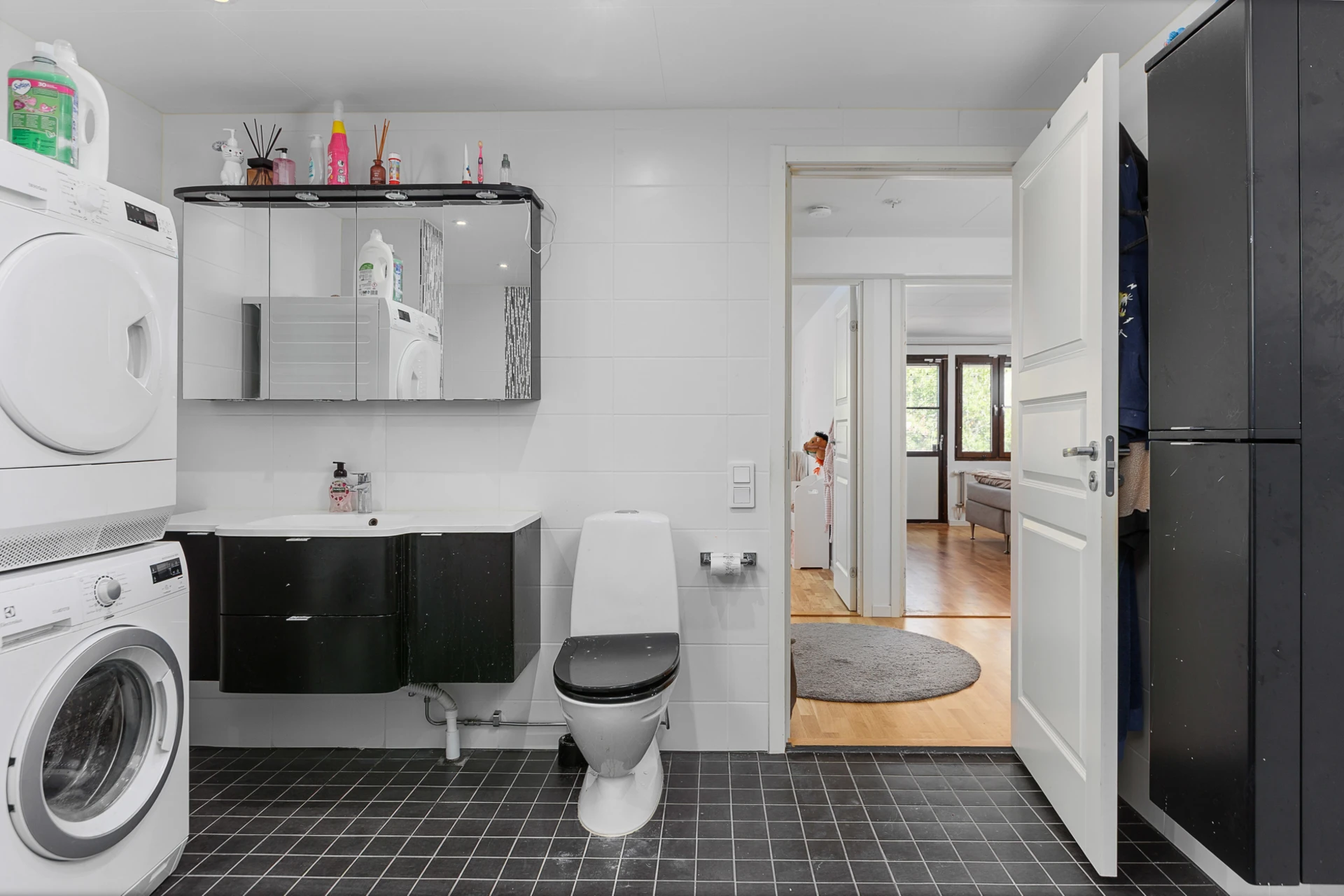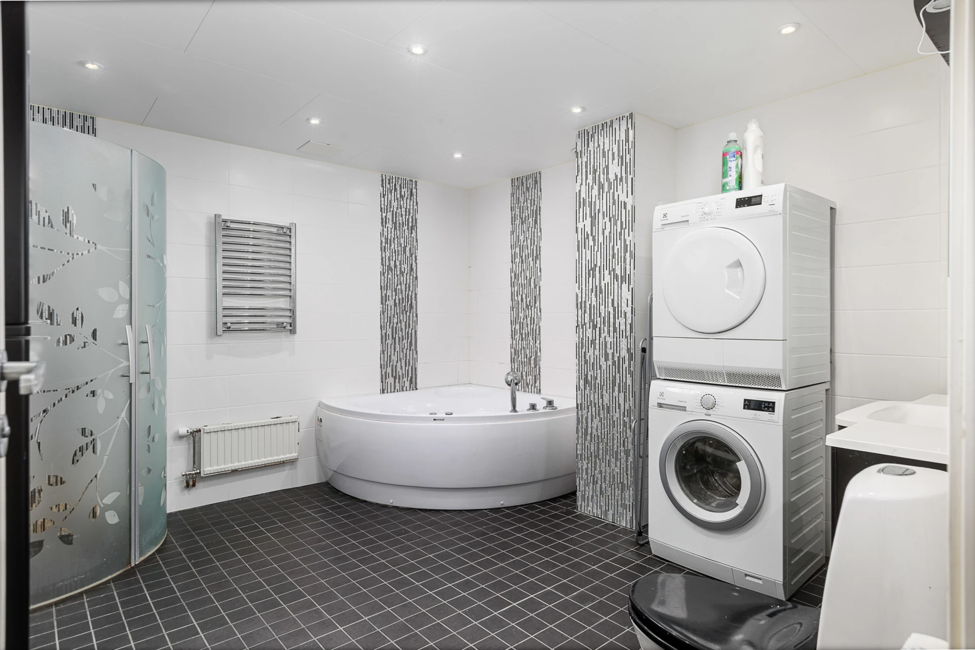Stort badrum med både dusch och hörnbadkar, praktisk tvättavdelning med tvättmaskin och torktumlare samt bra förvaring.