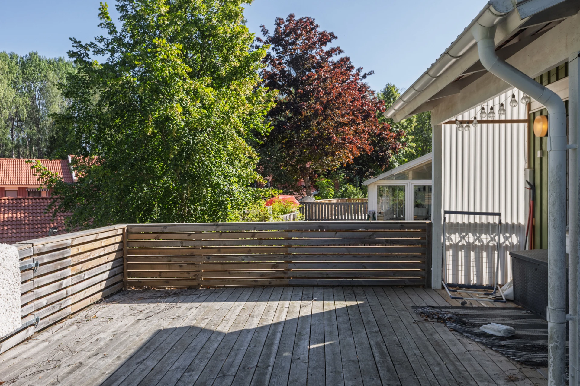 Till huset hör även ett praktiskt förråd, två trevliga uteplatser samt ett garage som ger plats för bilen.
