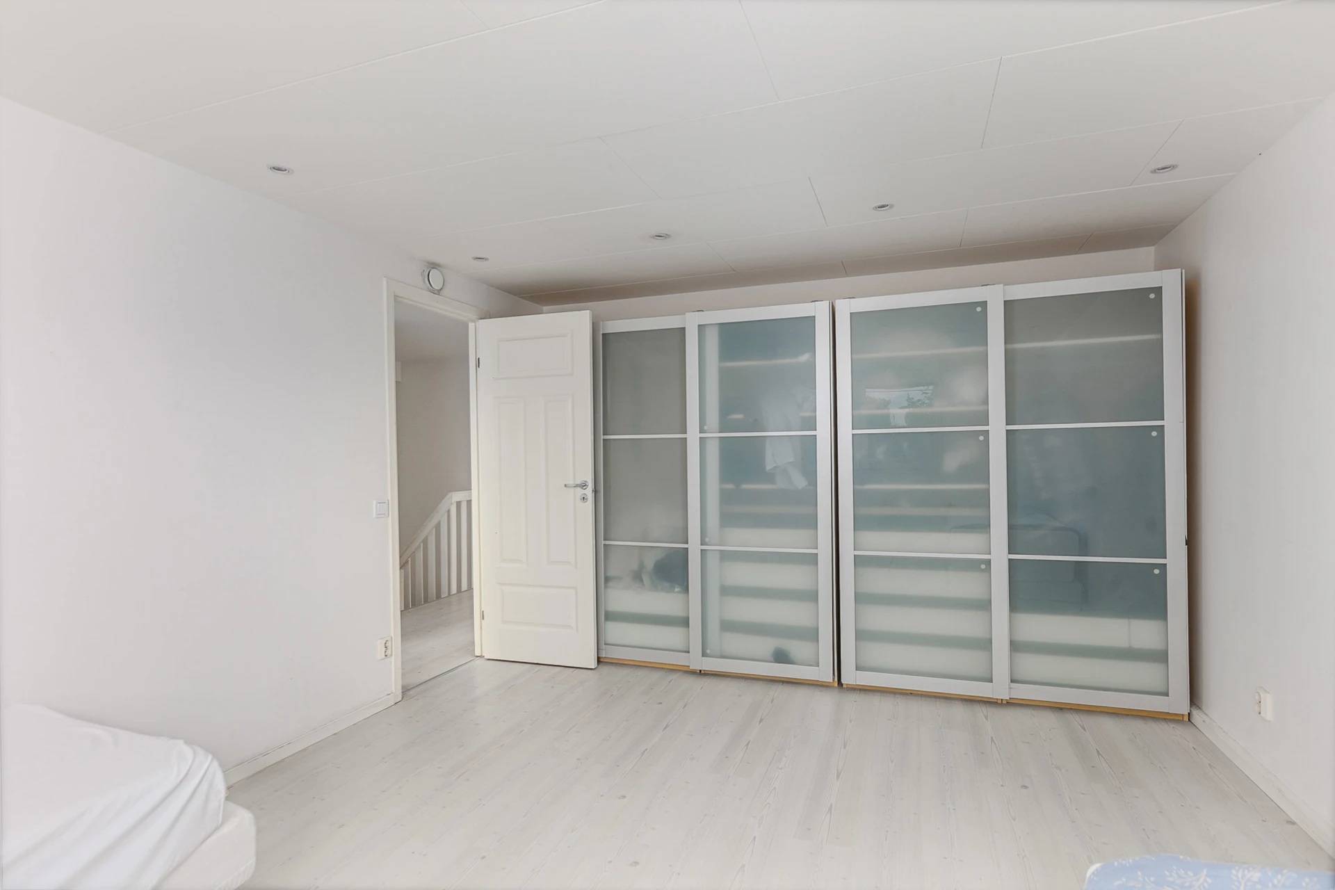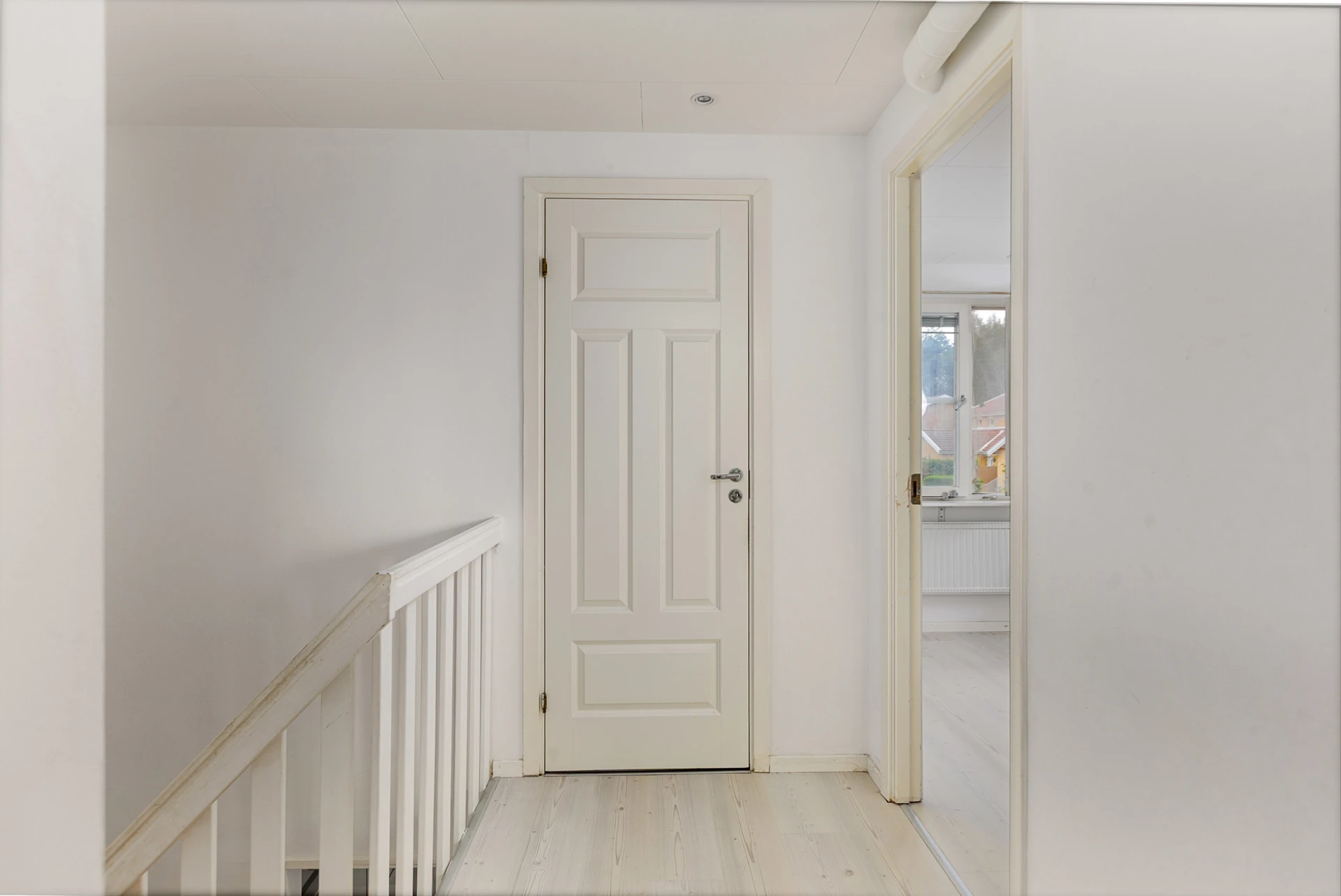 På övre plan finns tre sovrum – ett större föräldrasovrum med plats för dubbelsäng samt två mindre rum som passar perfekt som barnrum, gästrum eller arbetsrum.