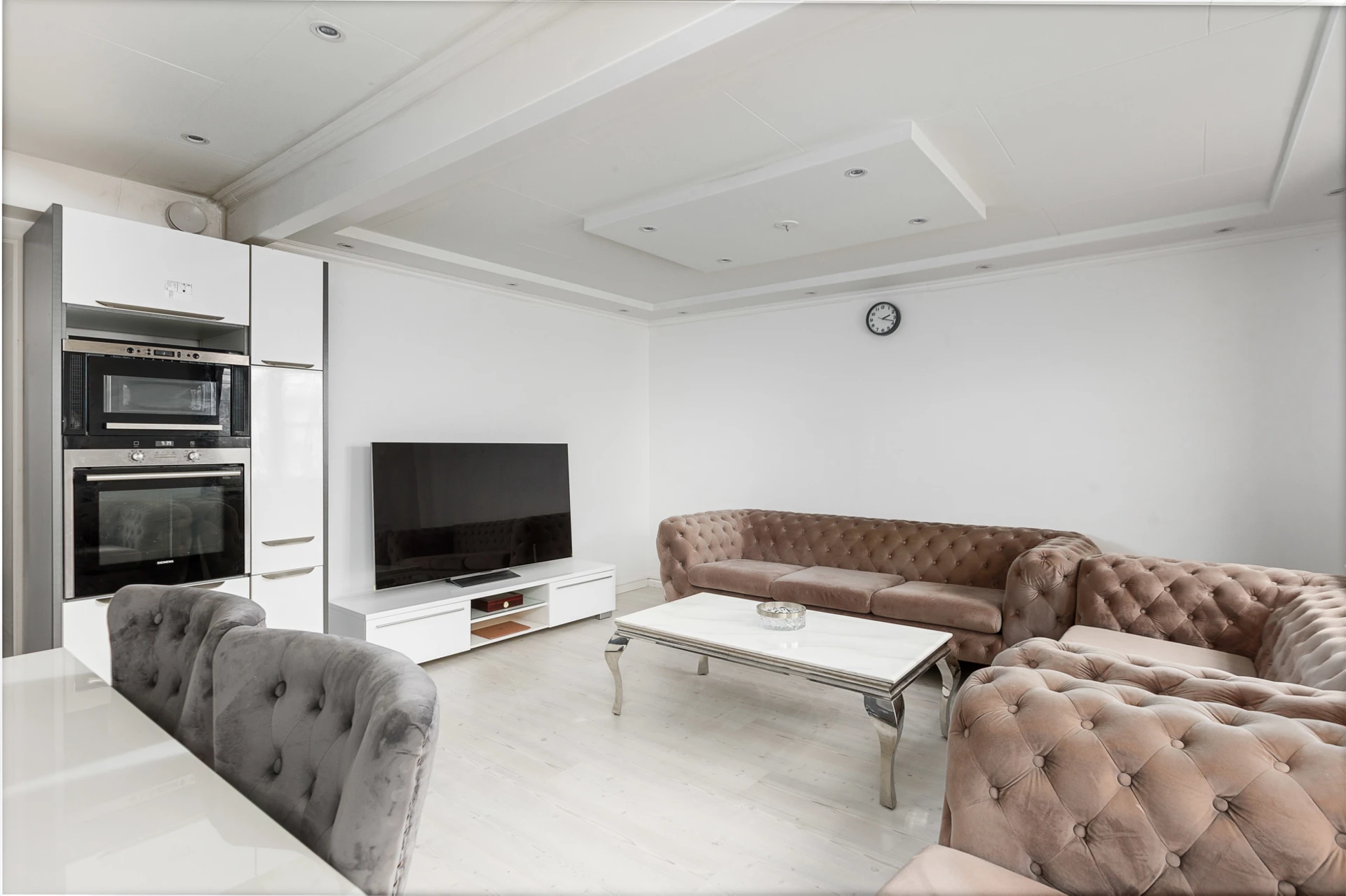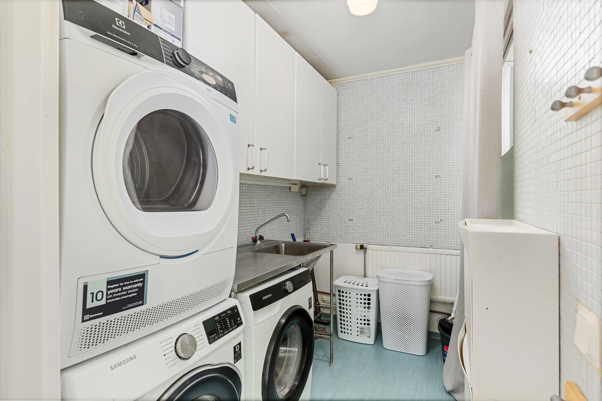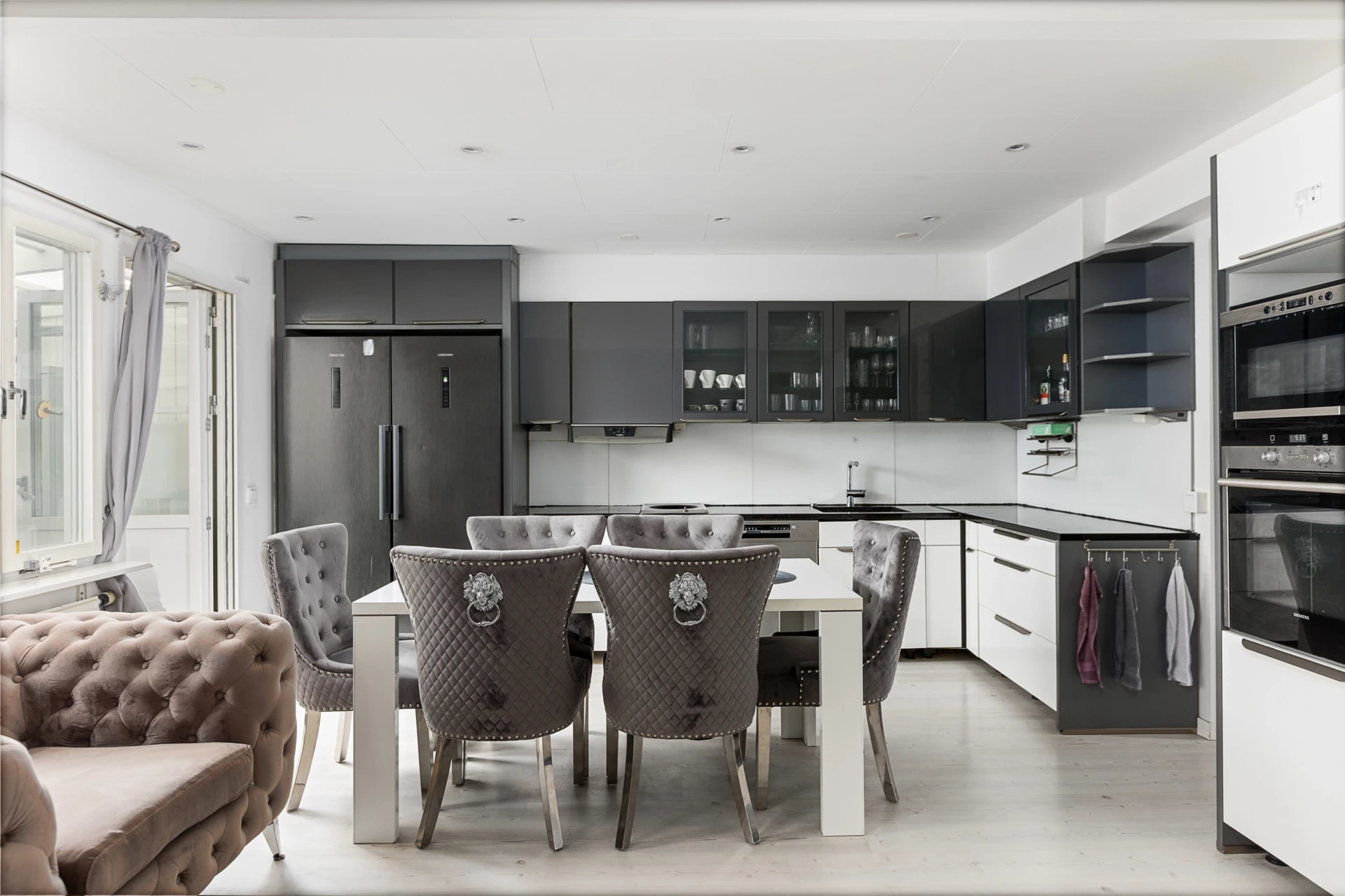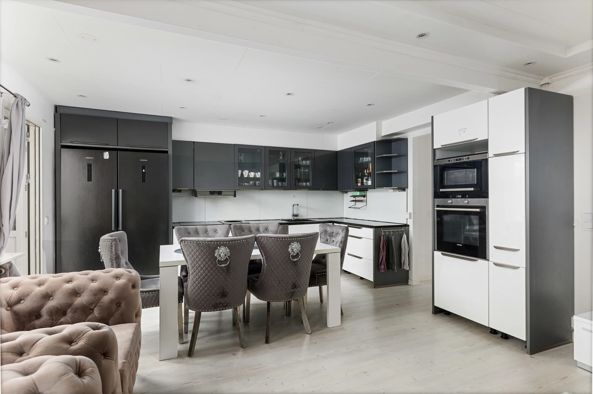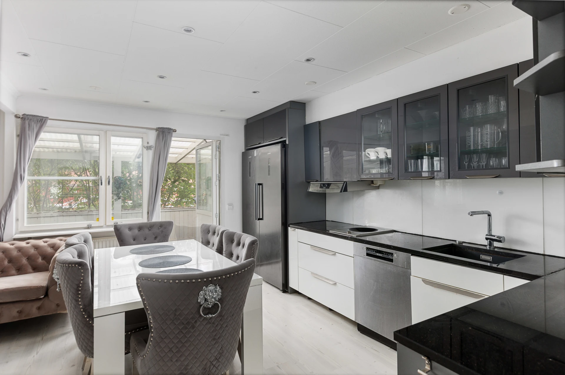 Det moderna köket bjuder på stilren design med smakfull färgsättning i svart, vitt och glasdetaljer. Här finns gott om förvaring bakom släta luckor samt generösa arbetsytor med bänkskiva i mörk ton. Den maskinella utrustningen består bland annat av kyl och frys i fullhöjd, inbyggd ugn och mikro, spishäll samt integrerad diskmaskin. Intill köket finns en naturlig matplats för hela familjen, med plats för ett stort matbord. De stora fönsterpartierna ger rikligt med ljus och skapar en trevlig atmosfär för både vardagsmiddagar och sociala tillställningar.