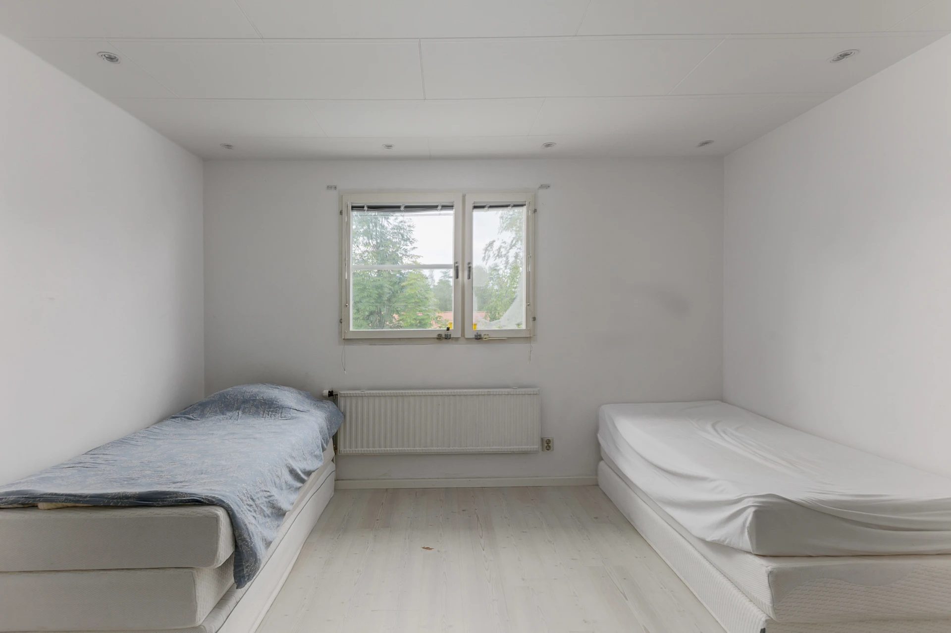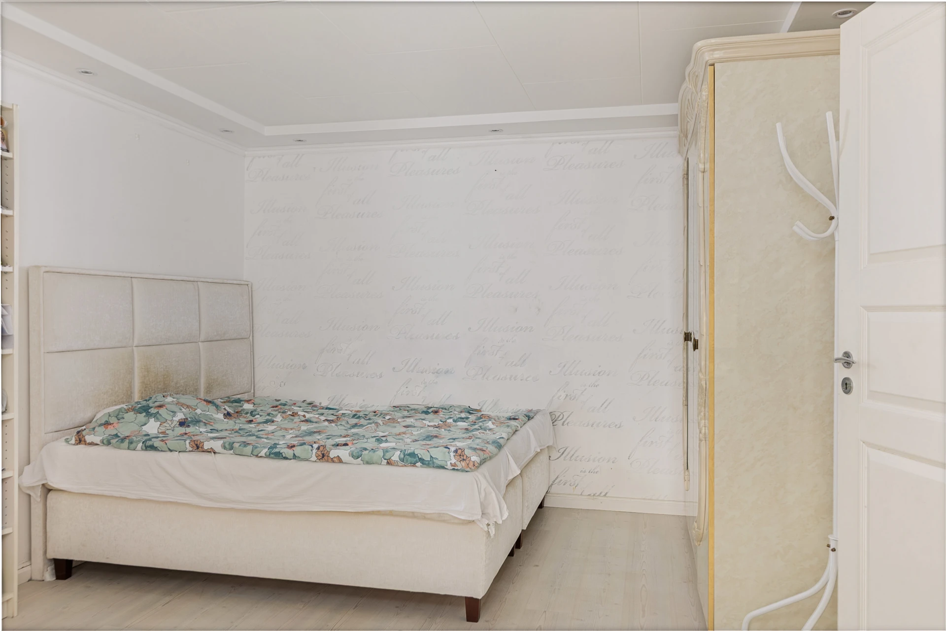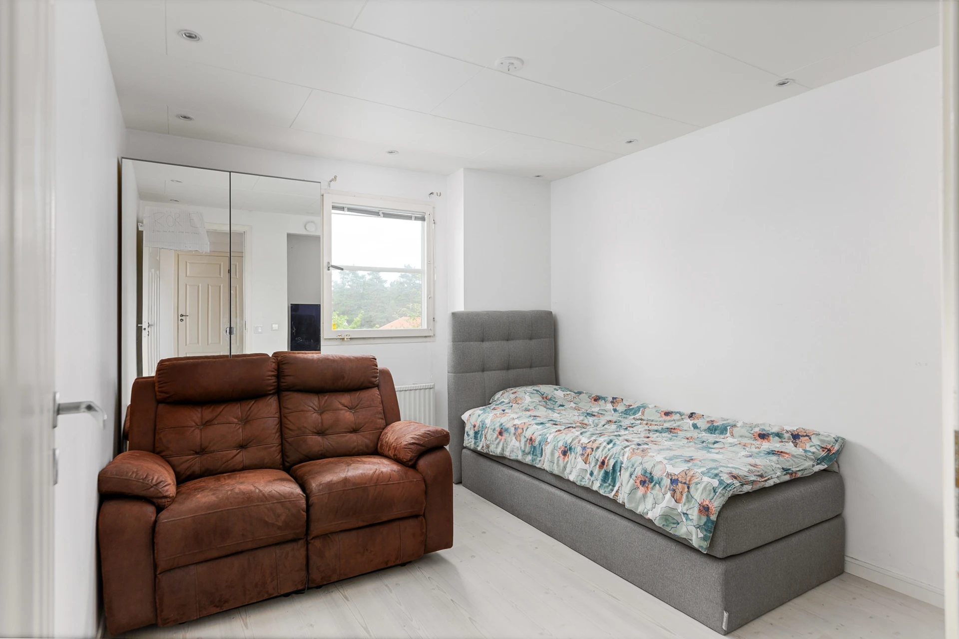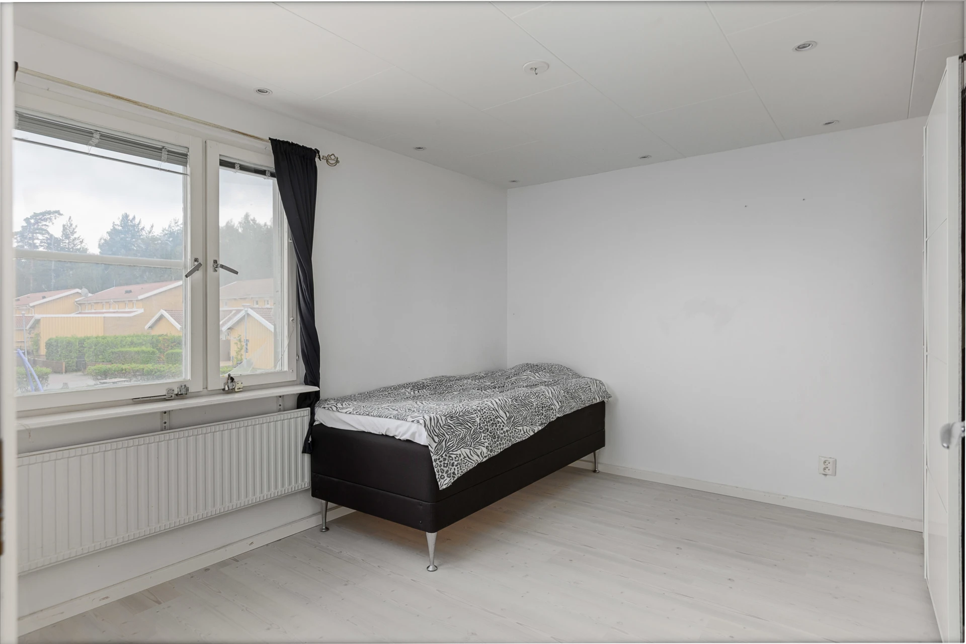 Ett rymligt och ljust sovrum med plats för säng och förvaringsmöbler. Fönster som släpper in gott om dagsljus och ger en trevlig vy mot altanen på framsidan. Rummet har en lugn och privat känsla, perfekt för gäster eller som master bedroom på entréplan.