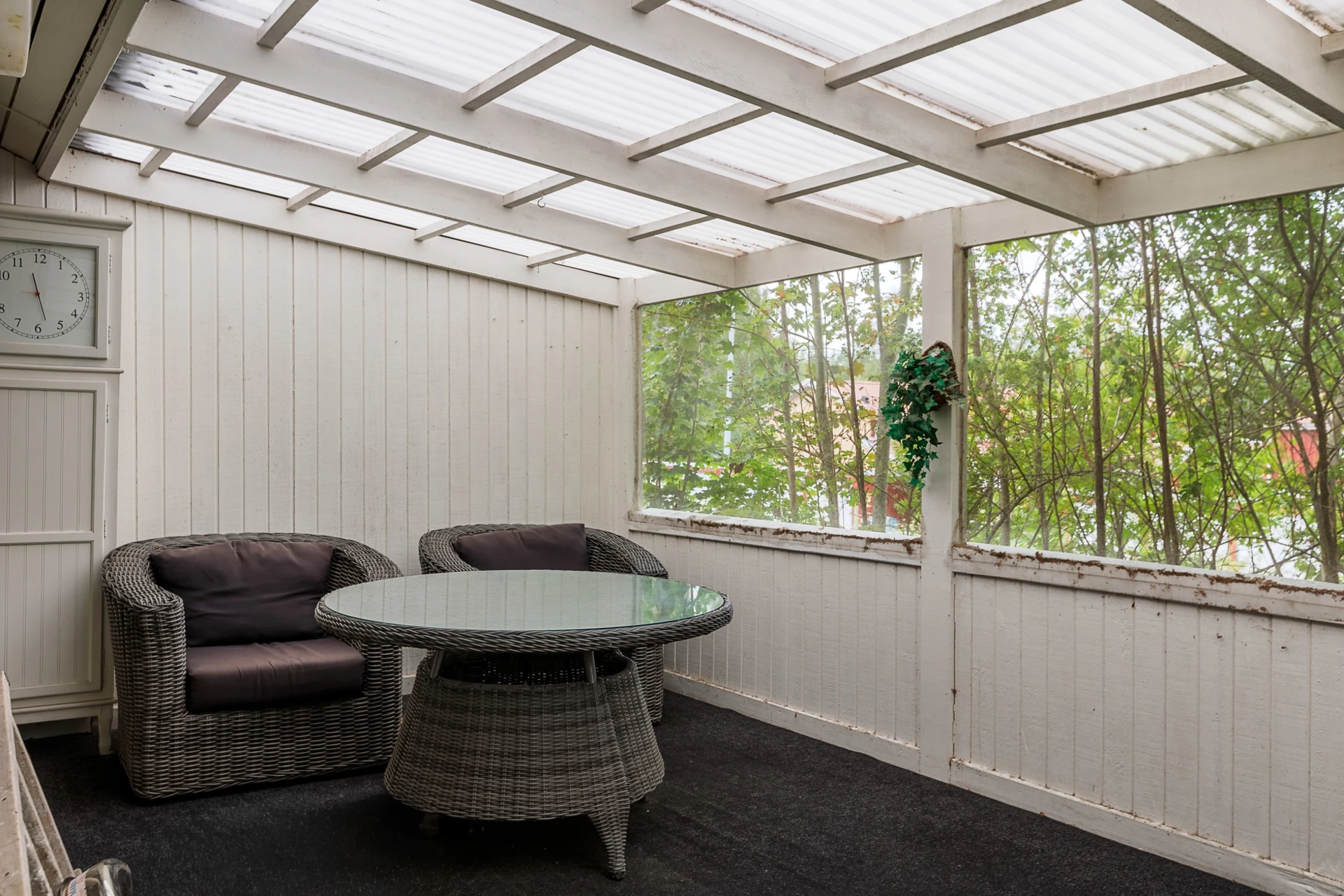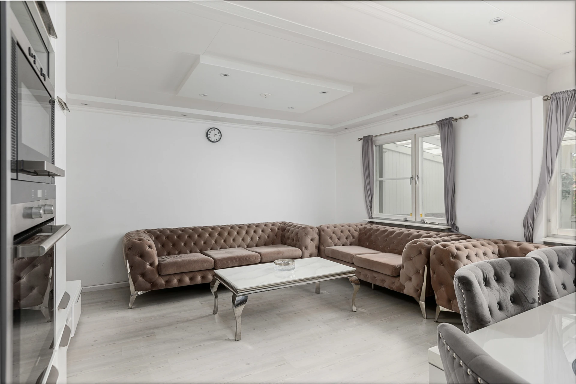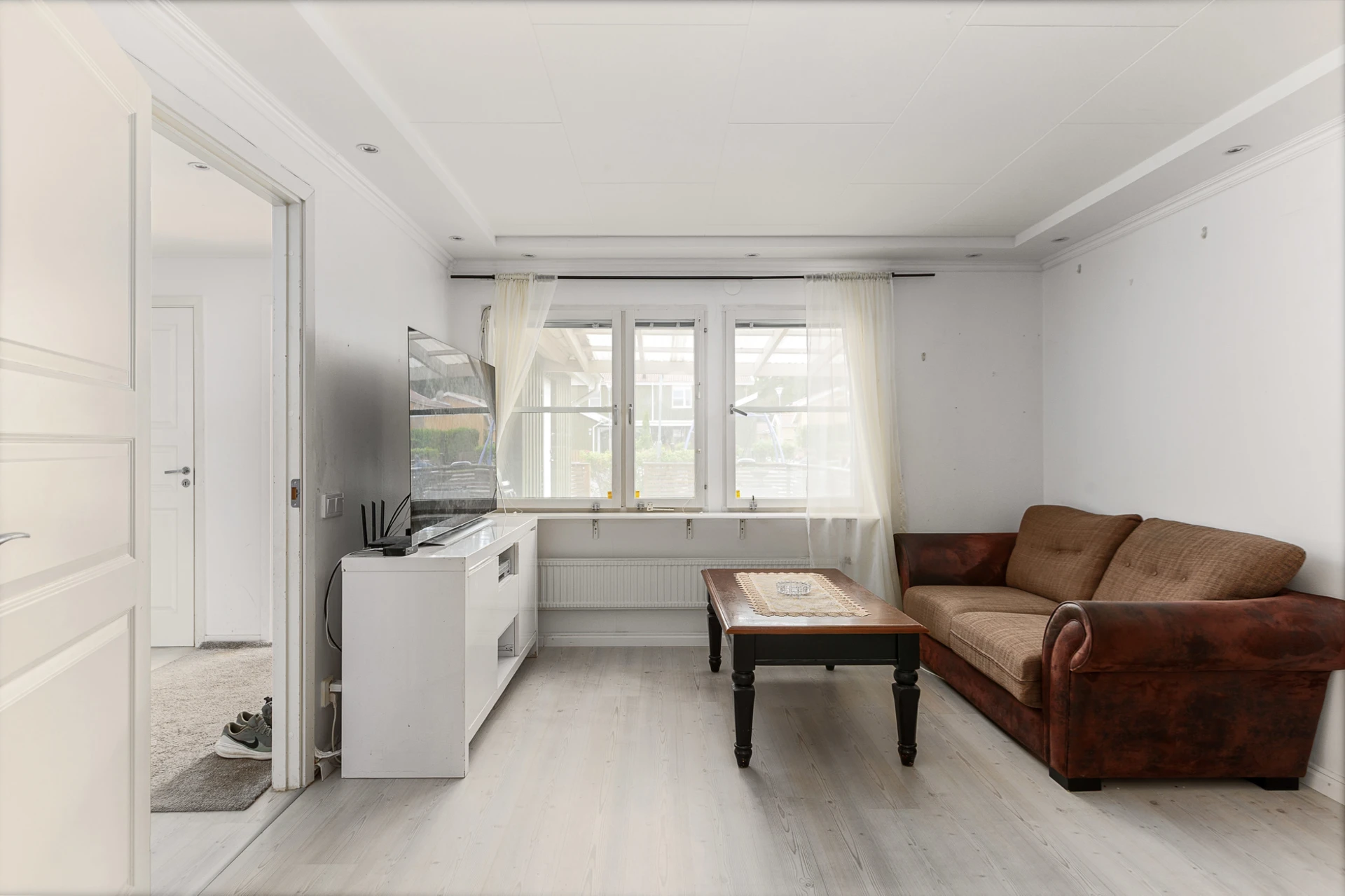 Ljust och rymligt vardagsrum i öppen planlösning med köket, med direkt anslutning till den inglasade altanen via en dörr, vilket skapar en härlig förlängning av sällskapsytorna.