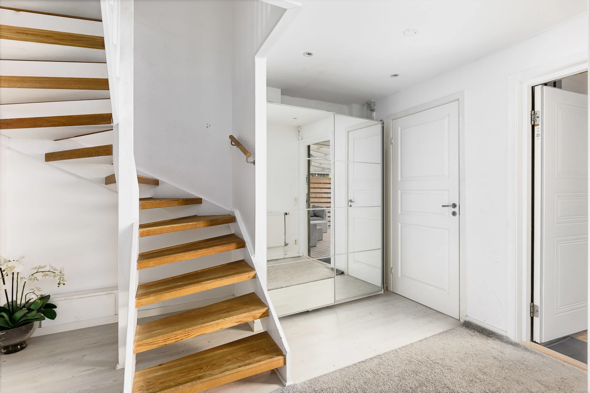 Välkomnande hall med gott om plats för avhängning av ytterkläder och skor. Här finns praktiska garderober som ger bra förvaring och skapar en ordnad känsla redan vid entrén. Det ljusa golvet och väggarna ger ett fräscht intryck och binder ihop hallen med resten av bostadens moderna stil.