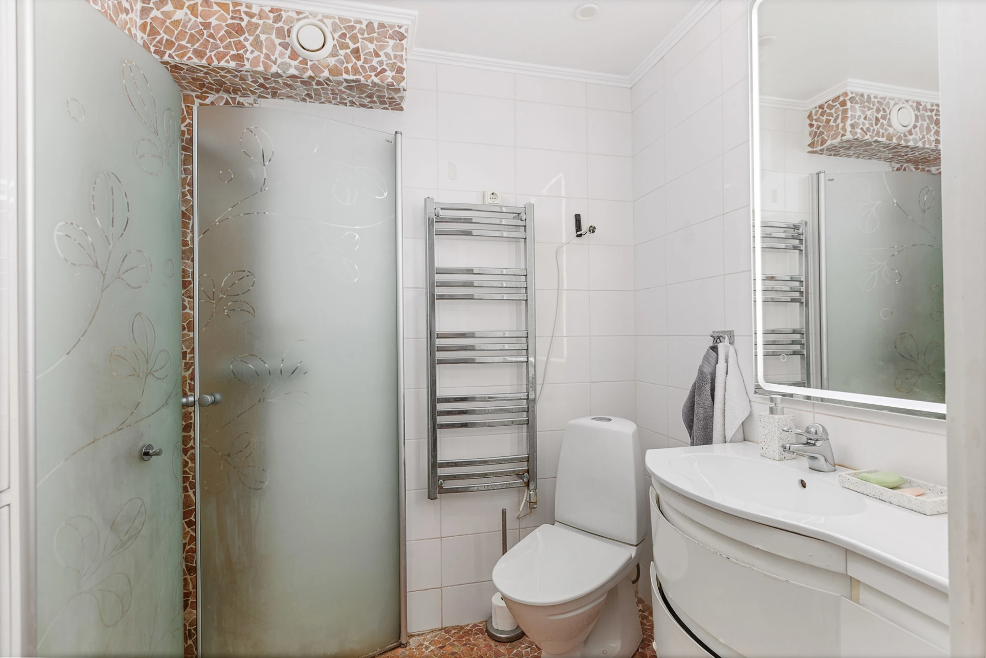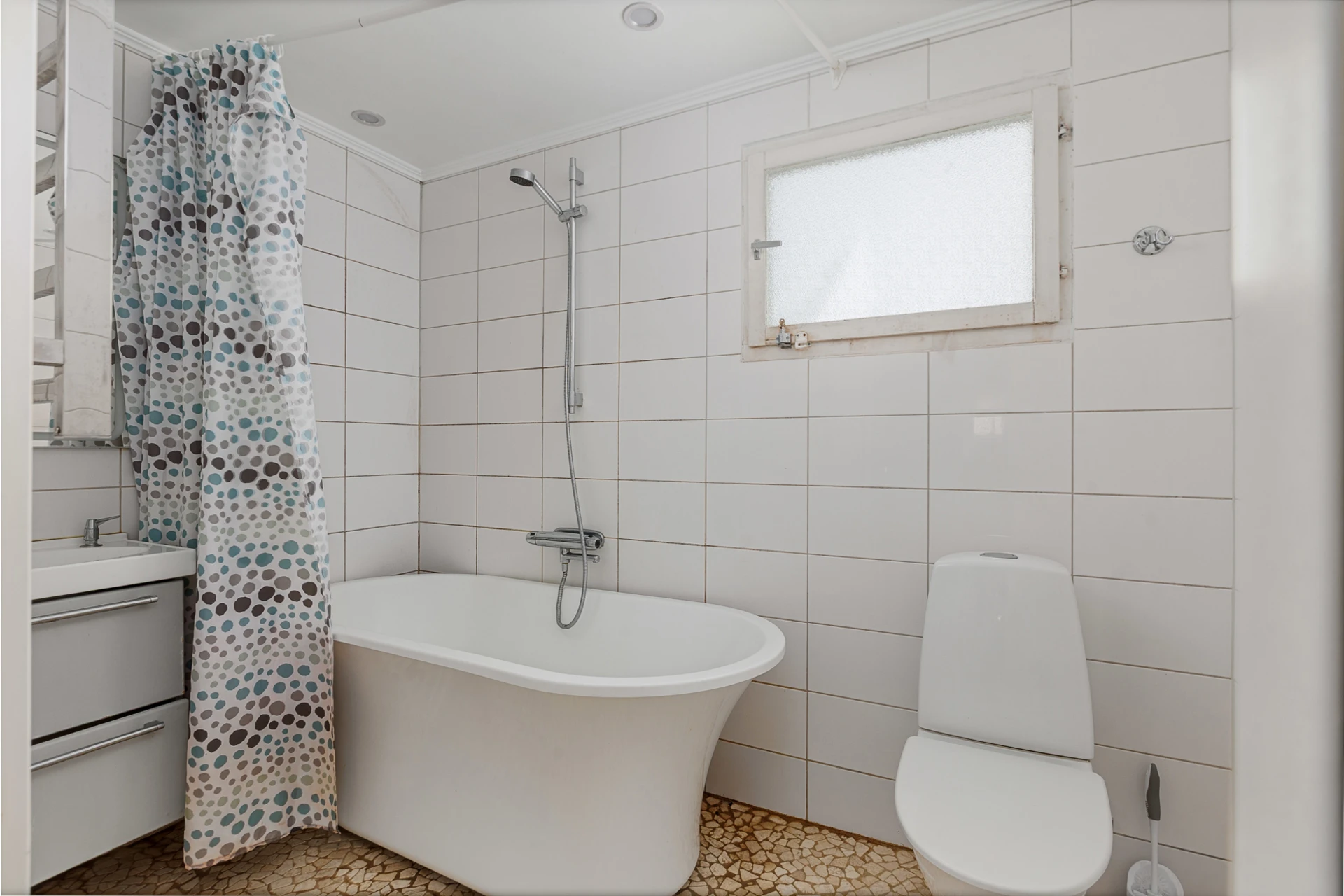 På övre plan finns ett helkaklat badrum utrustat med badkar, wc och handfat – en perfekt plats för avkoppling och praktisk vardag för hela familjen.
