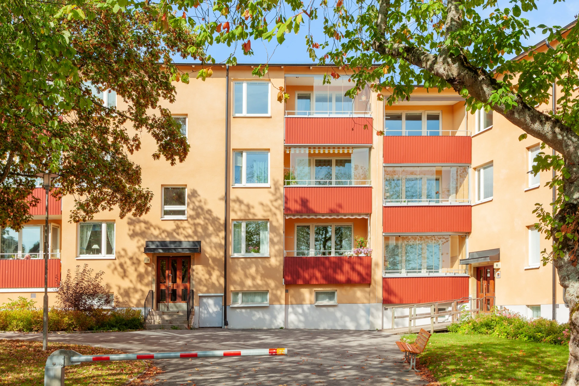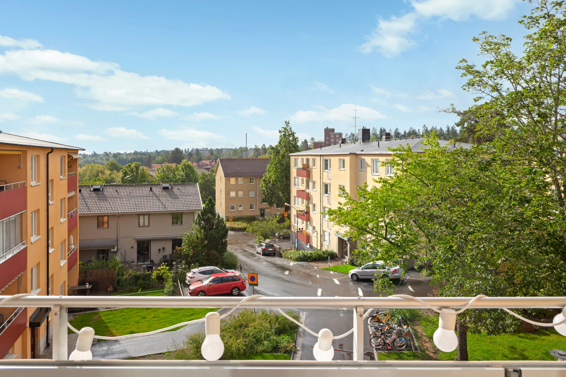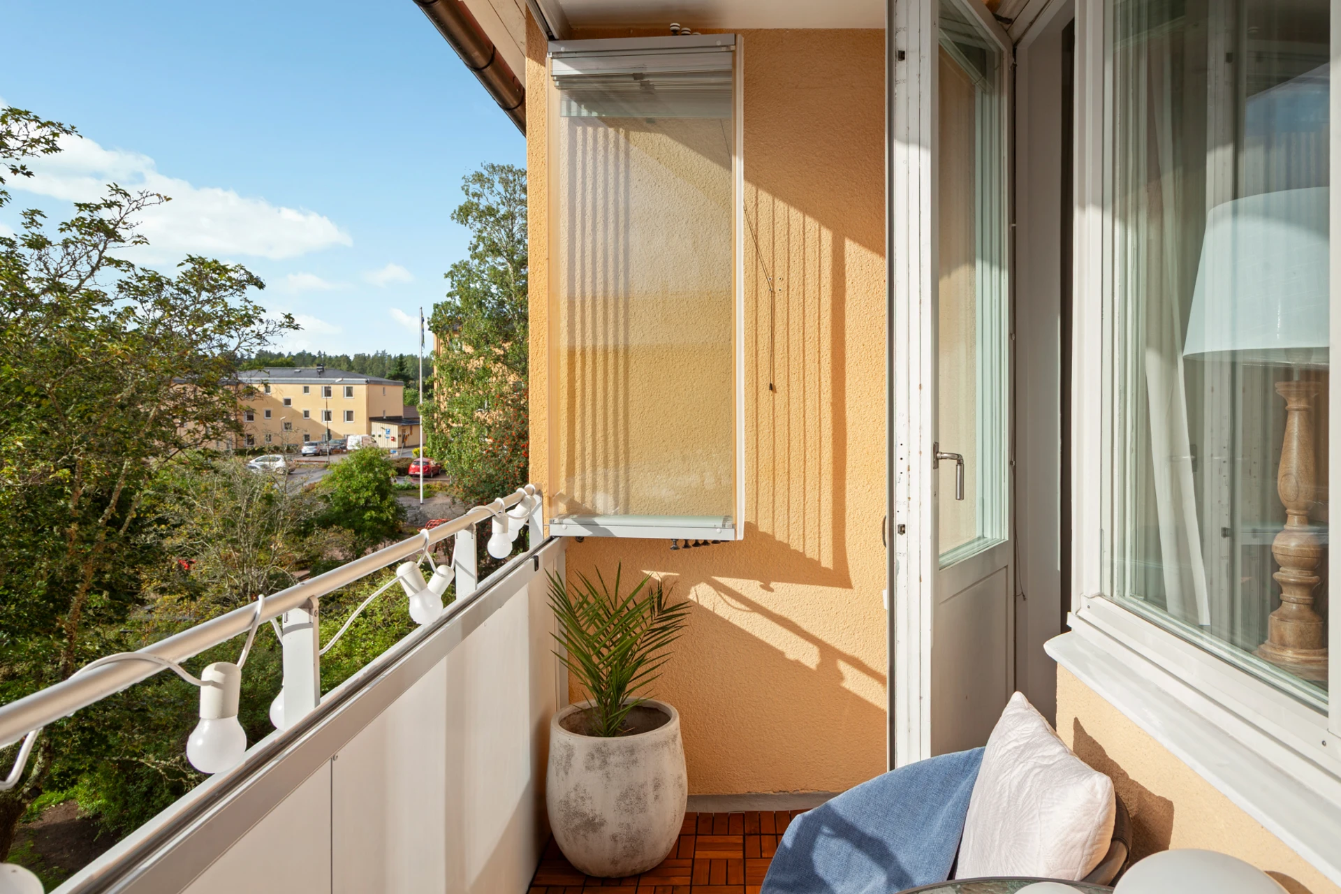 Stor inglasad balkong i bästa söderläge med sol under stora delar av dagen. Här ryms plats för ett mindre matbord eller en loungemöbel.
