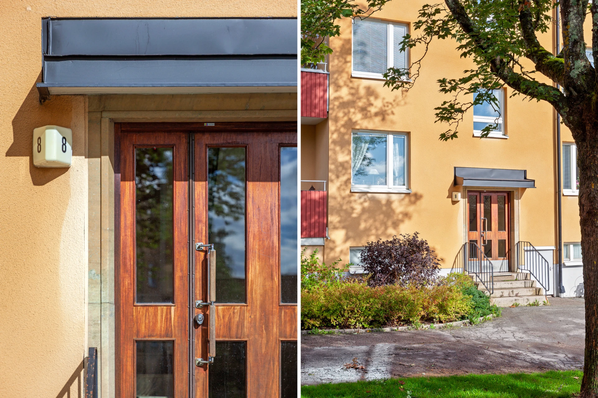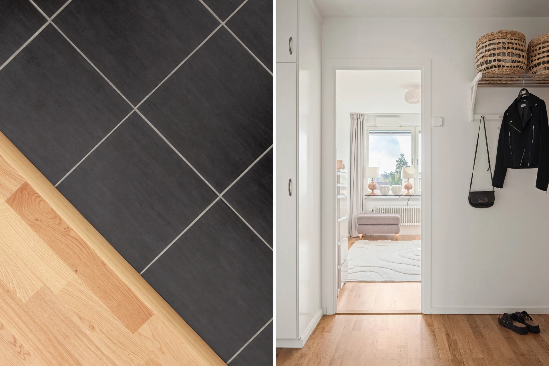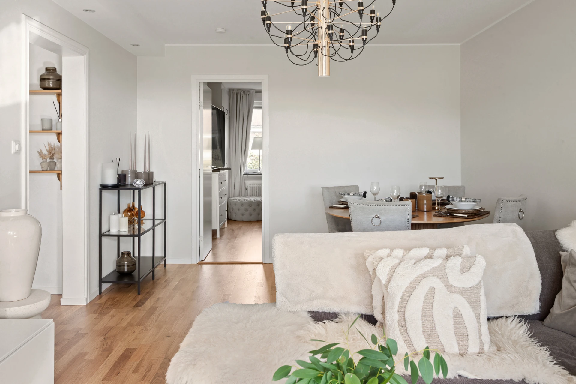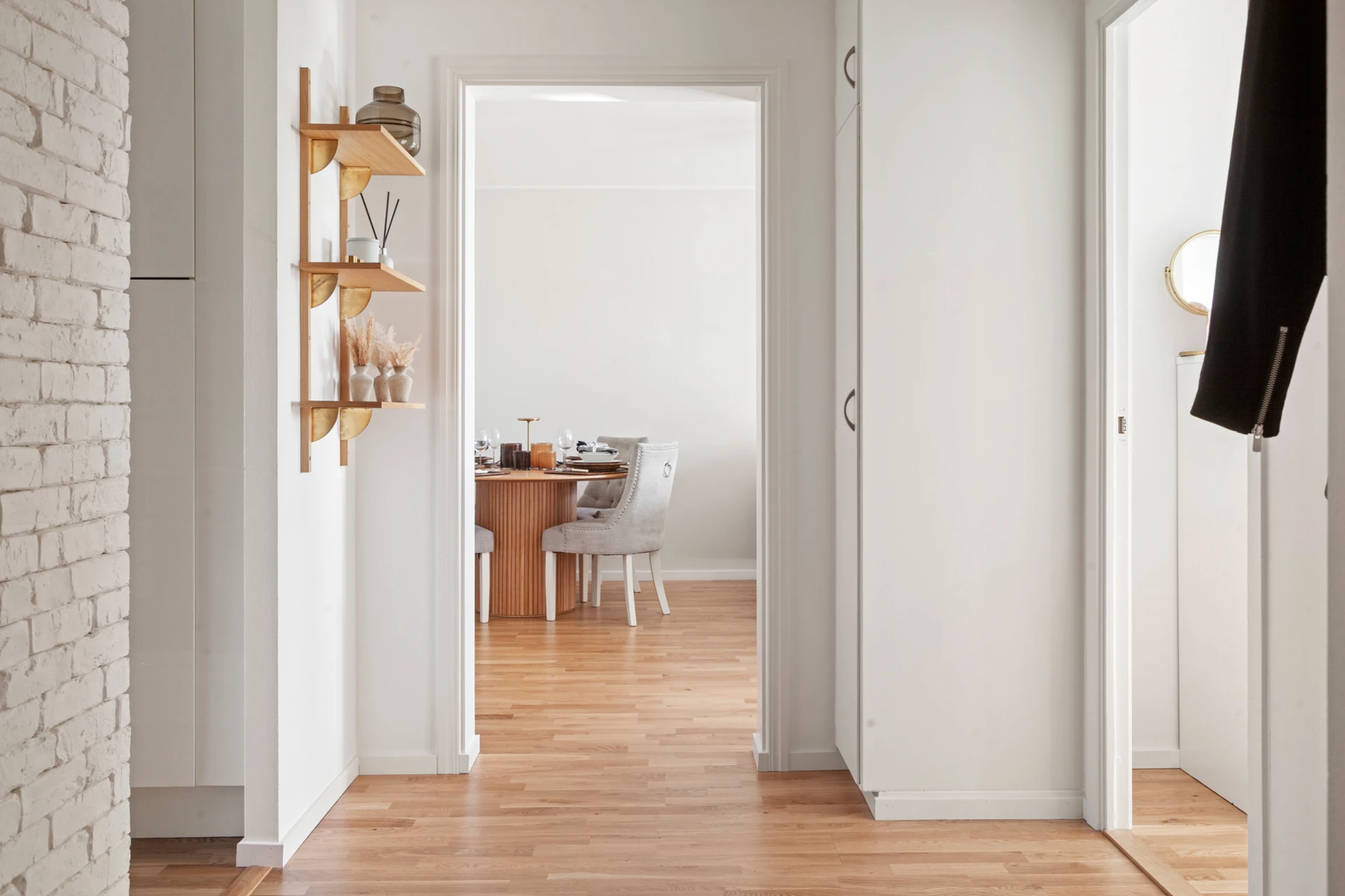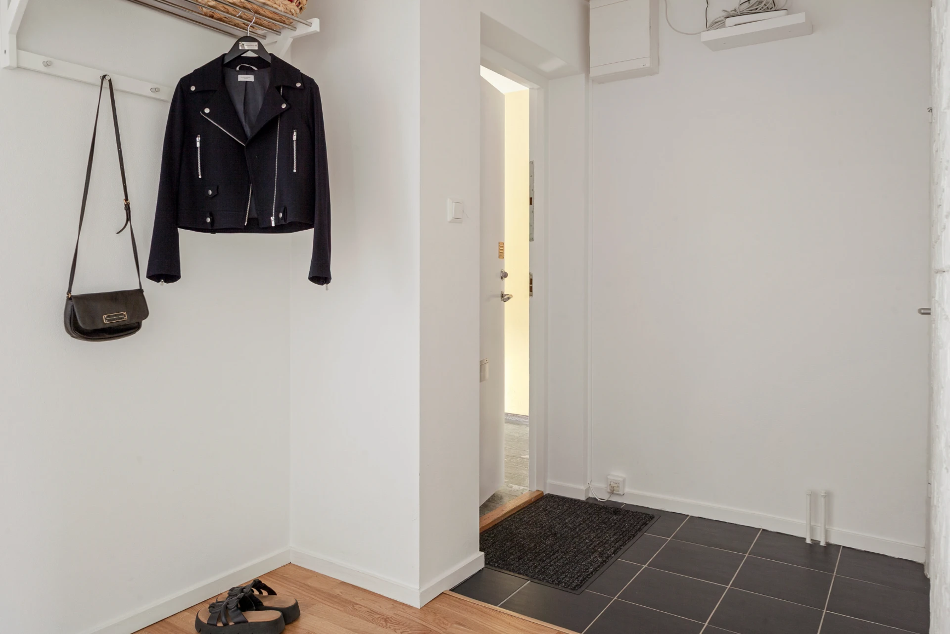 Rymlig och välkomnande hall med vitmålade väggar och mörkt instegsklinker precis vid dörren som sedan går över i ett nytt fint parkettgolv som sträcker sig genom hela lägenheten. Här finns plats för avhängning samt diverse möbel för avlastning och förvaring. Från hallen nås lägenhetens kök, vardagsrum, badrum och ena sovrum.