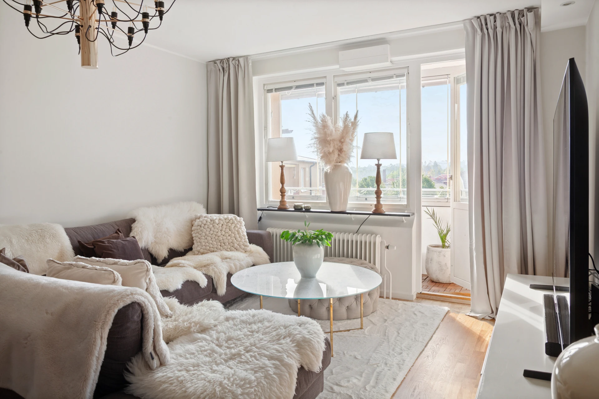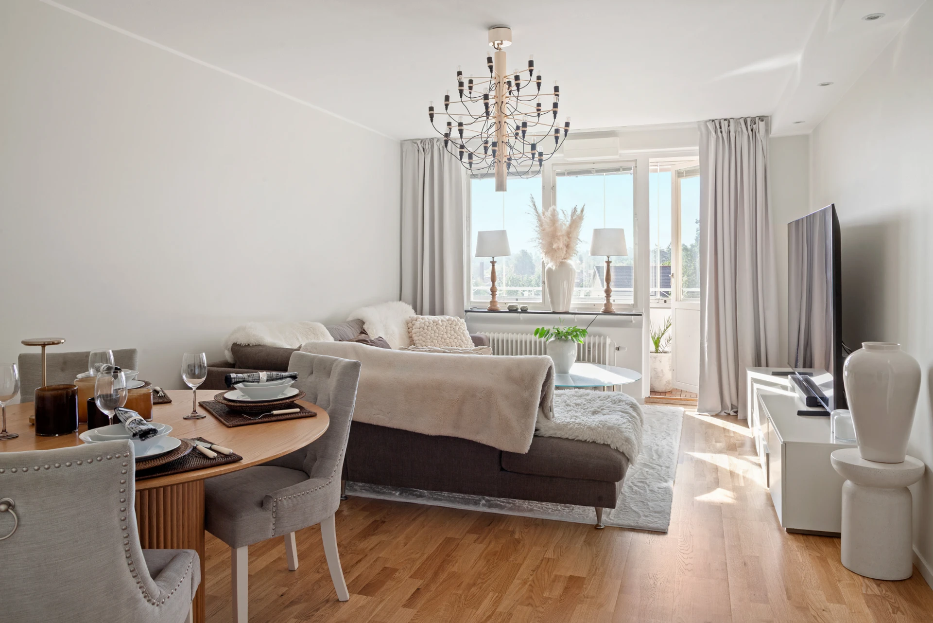 Stort, ljust och luftigt vardagsrum som har ljust målade väggar och nytt parkettgolv. Inbyggda spotlights längst rummets ena långsida och ett stort fönsterparti som ger ett härligt ljusinsläpp. Här ryms plats för en stor soffa, soffbord, TV med tillhörande bänk samt diverse annat möblemang, exempelvis ett matsalsbord om önskas. Från vardagsrummet nås också lägenhetens balkong.