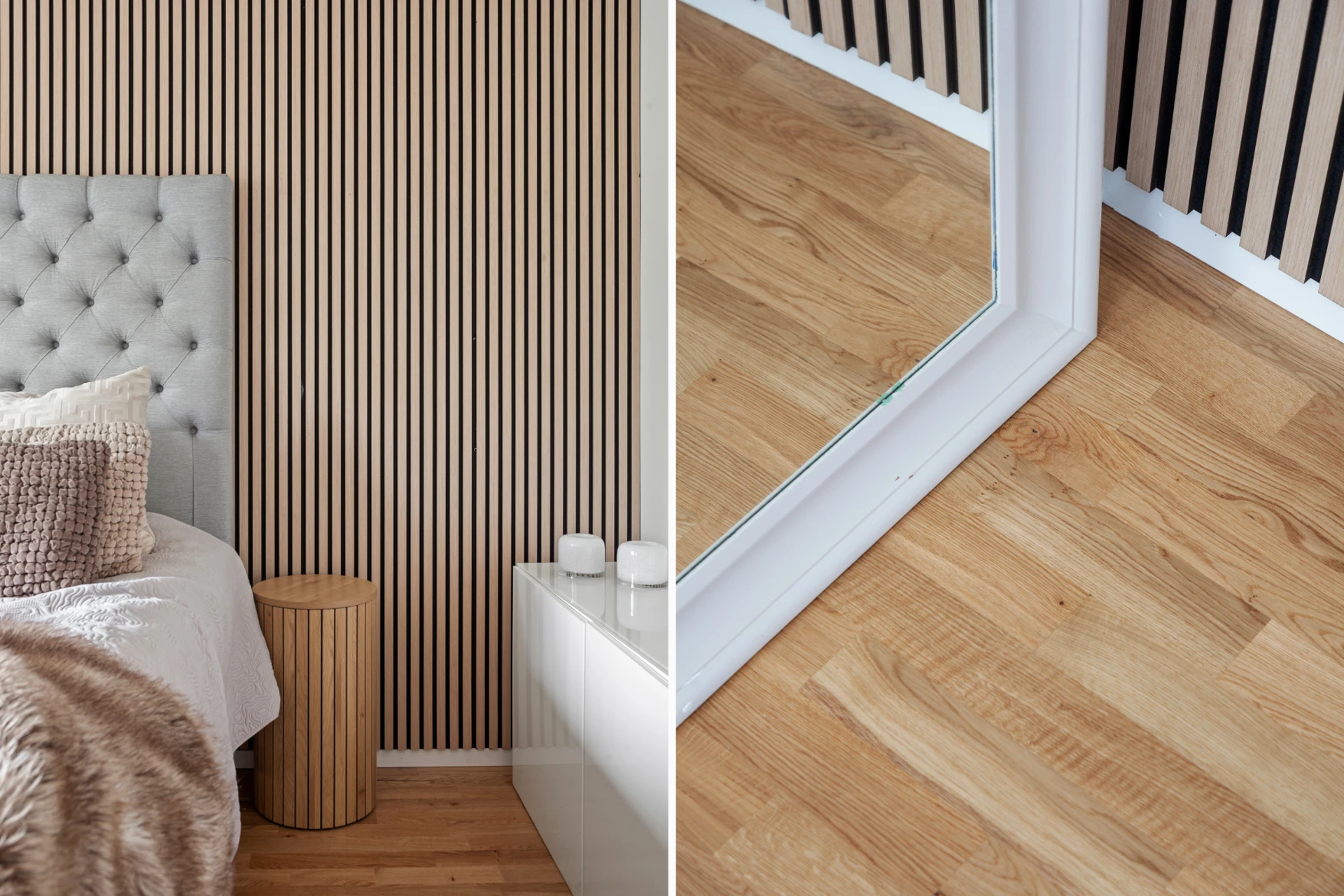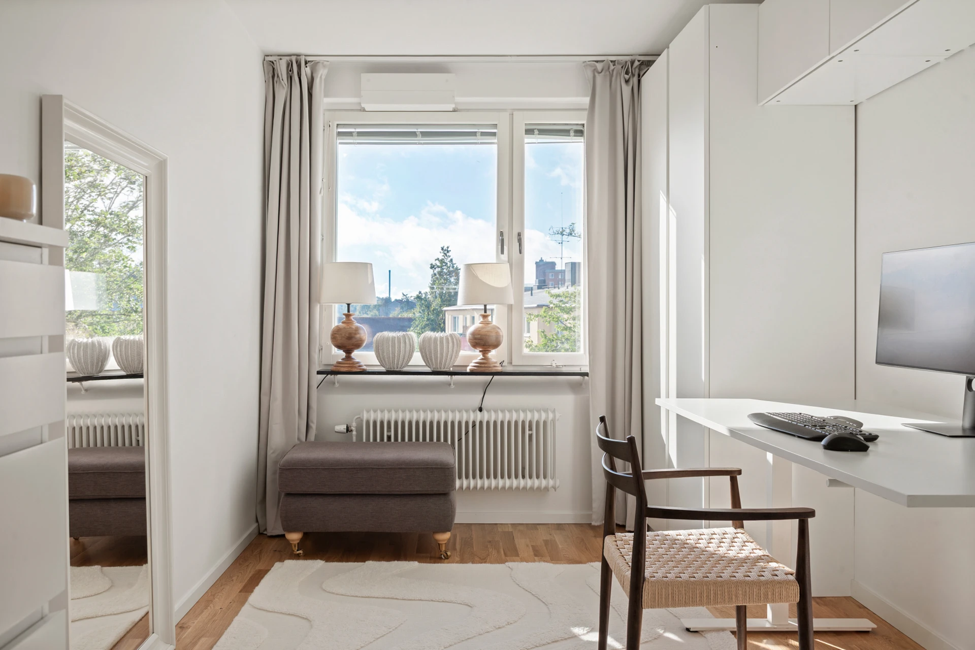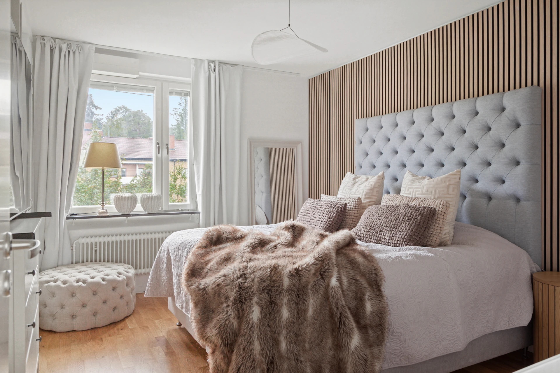 Lägenhetens stora sovrum nås från vardagsrummet och rymmer plats för en dubbelsäng, sängbord, smidig förvaring i fyra garderober samt diverse annan möbel om önskas. Vitmålade väggar med en vägg klädd i fin akustikpanel för en mer ombonad och mysig känsla, samt parkettgolv.