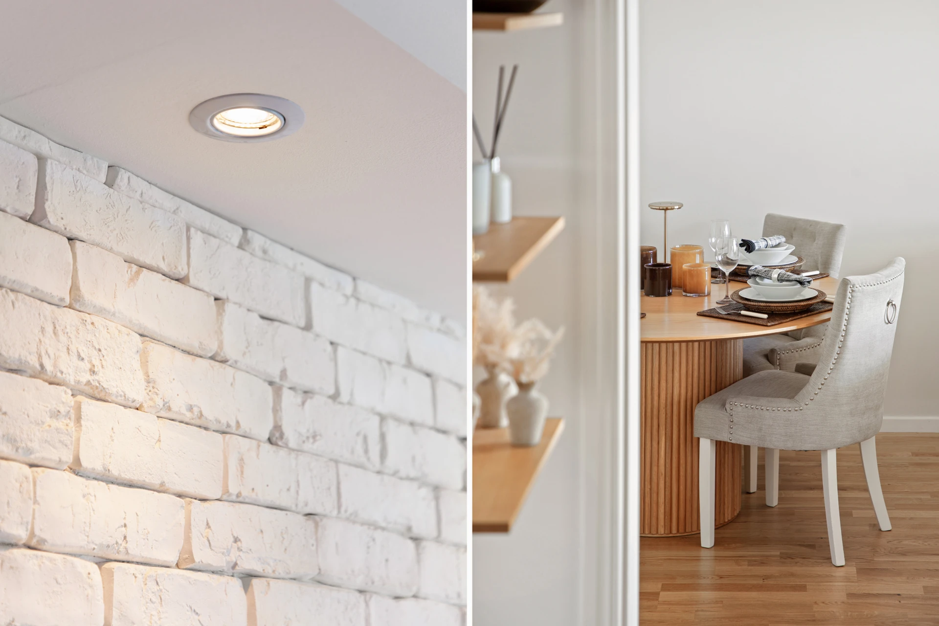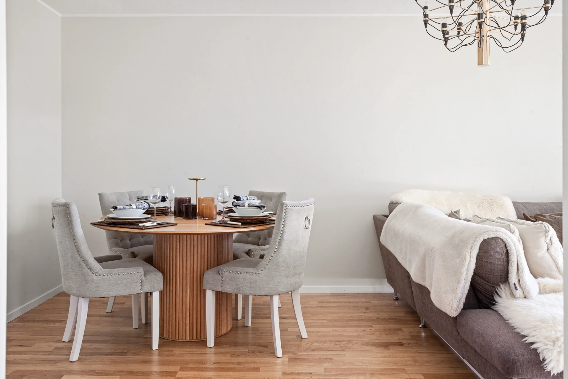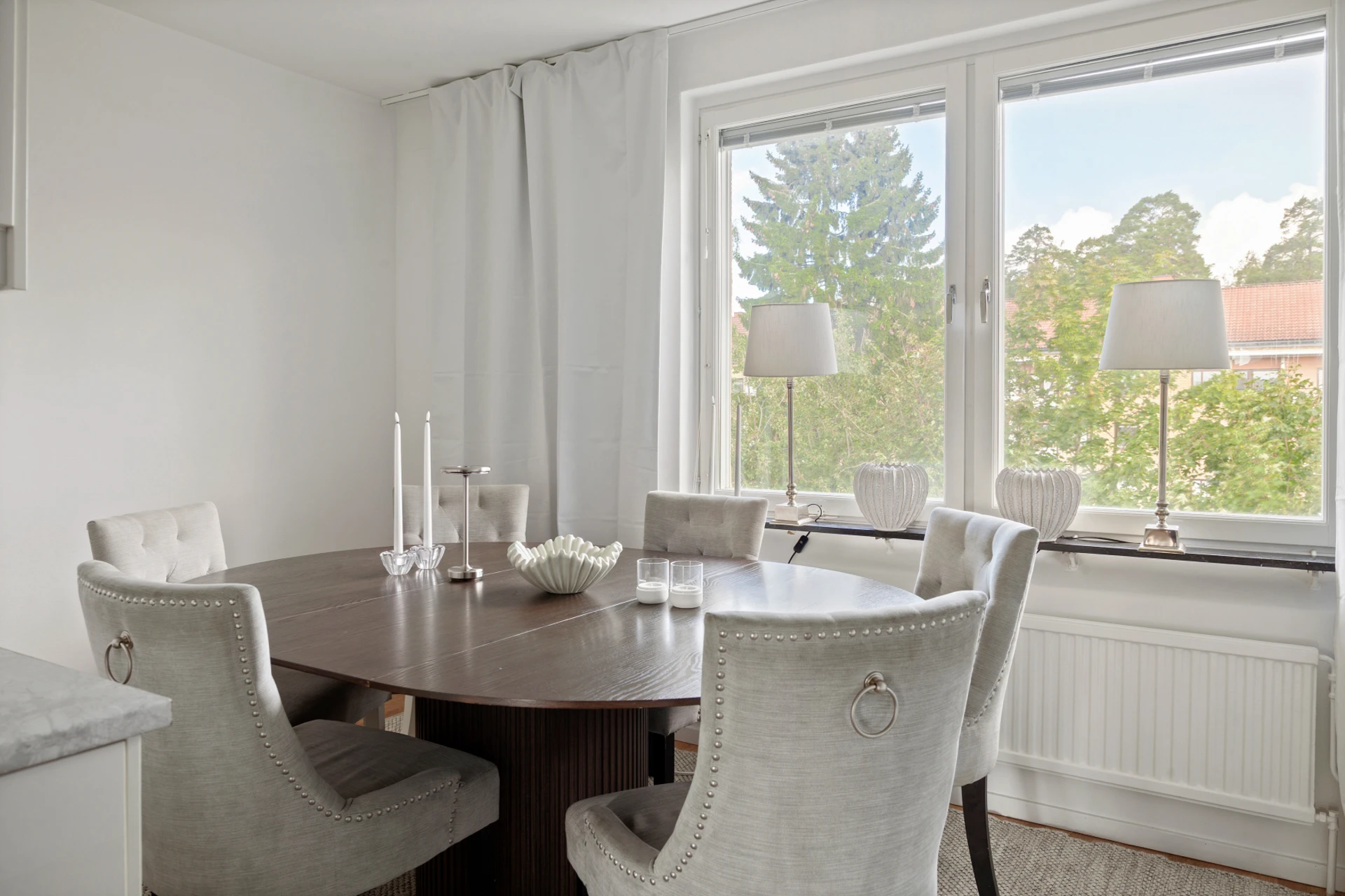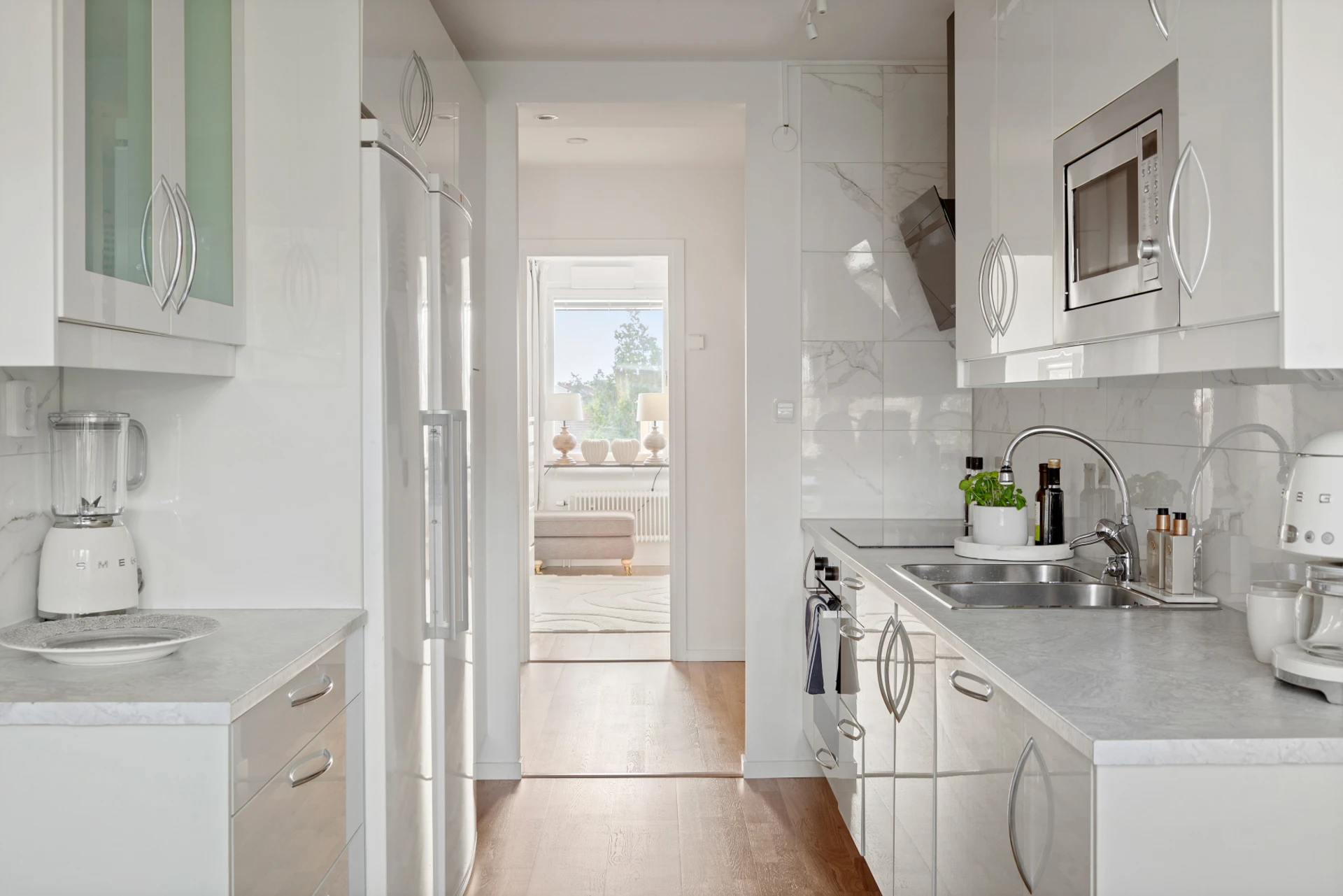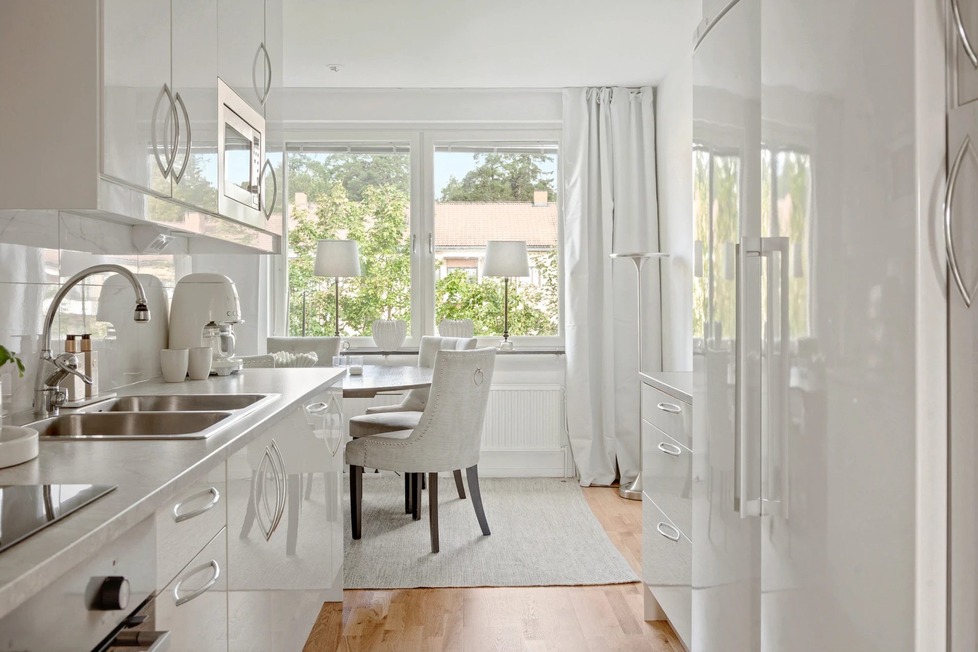 Ljust, modernt och välplanerat kök med goda förvaringsutrymmen bakom vita skåpluckor, stora arbetsytor på ny ljus bänkskiva samt nytt ljust och marmorerat kakel ovanför. Även köket har vitmålade väggar och fint parkettgolv. Intill ett stort fönsterparti finns också plats för ett stort matbord med plats för 8 personer.