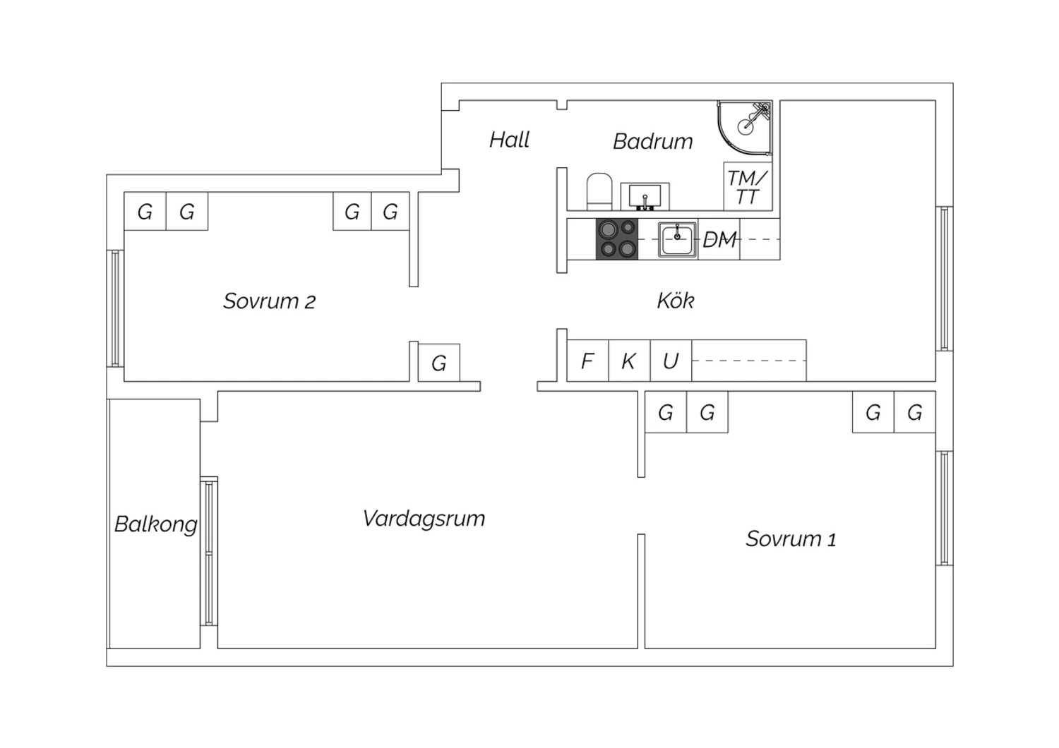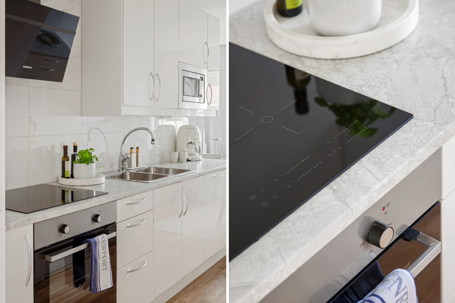Den maskinella utrustningen består av hel kyl och frys, ugn, spishäll med induktion, integrerad diskmaskin, inbyggnadsmikro och köksfläkt.