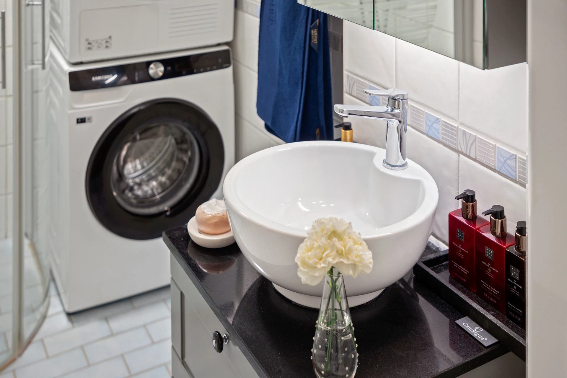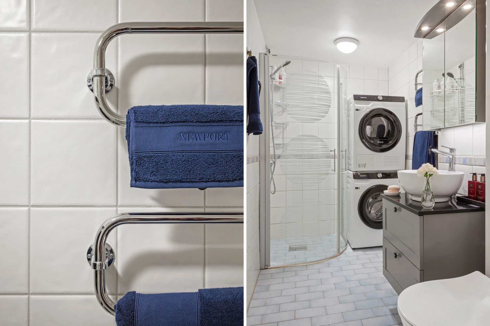 Helkaklat badrum med vitt kakel på väggar och ljust klinkergolv. Badrummet är utrustat med en vägghängd toalett, duschhörna med glasdörrar, nytt handfat med tillhörande kommod, spegelskåp med belysning samt handdukstork. Här finns också en praktisk tvättpelare med en ny tvättmaskin och torktumlare som ingår.