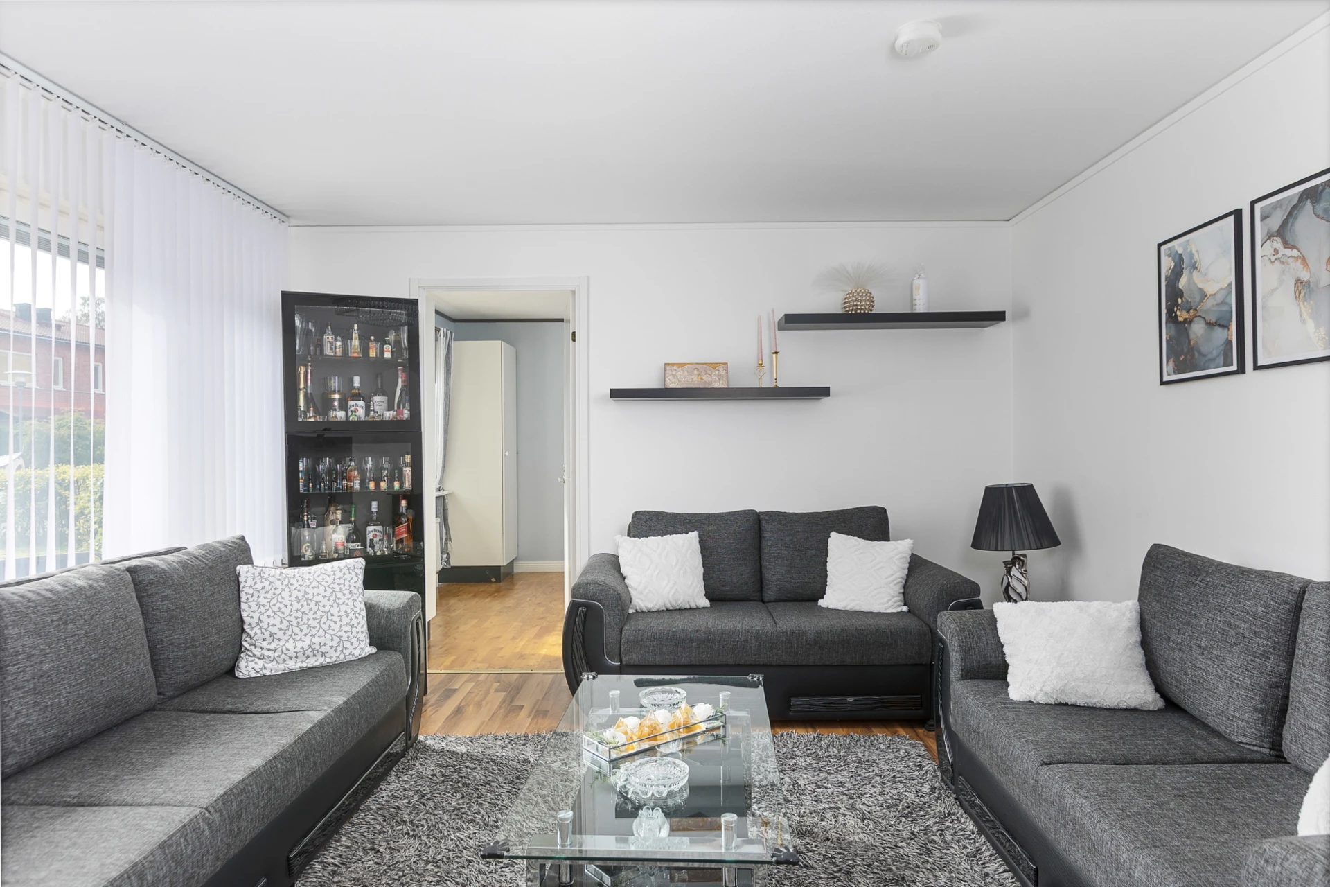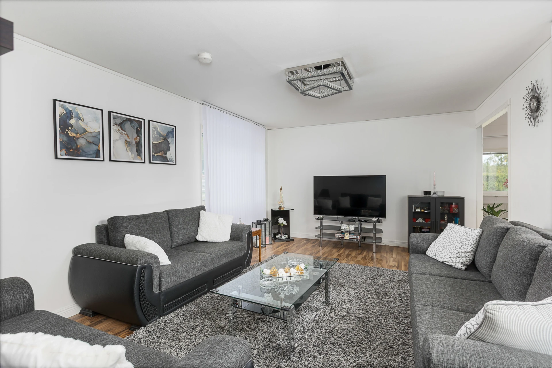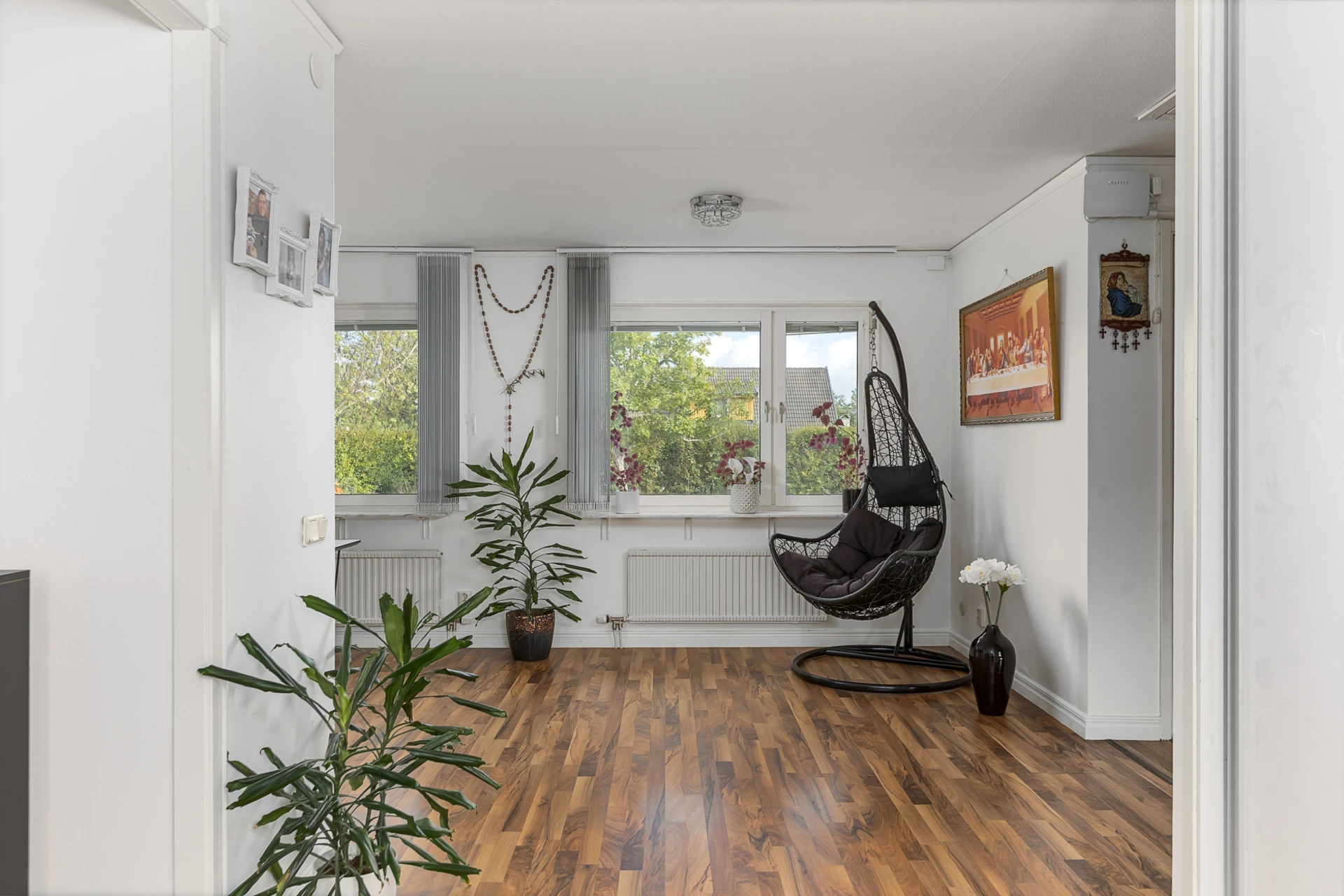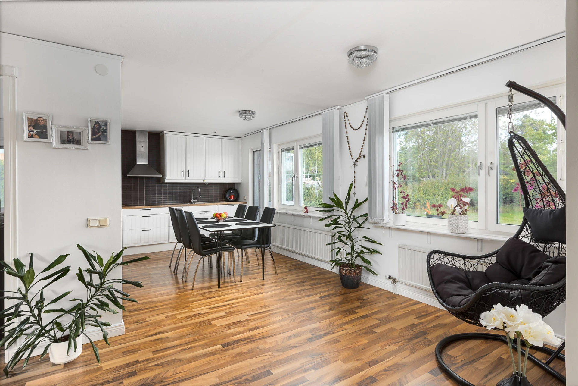 Trivsamt vardagsrum med generösa ytor och plats för både soffgrupp och matsalsmöbel. De stora fönsterpartierna ger ett fint ljusinsläpp och skapar en ljus och inbjudande atmosfär. Ett rum som fungerar lika bra för avkoppling som för umgänge.